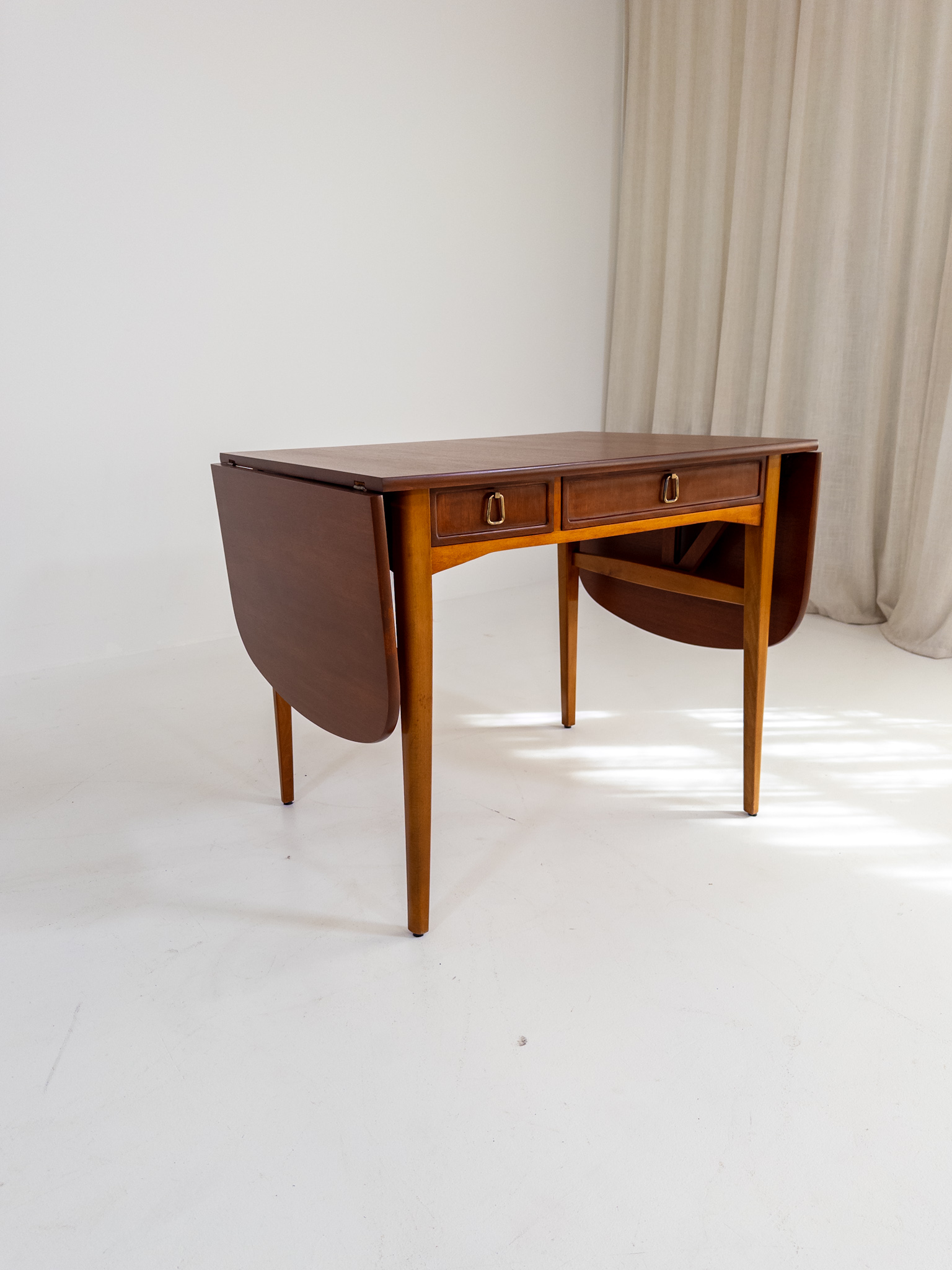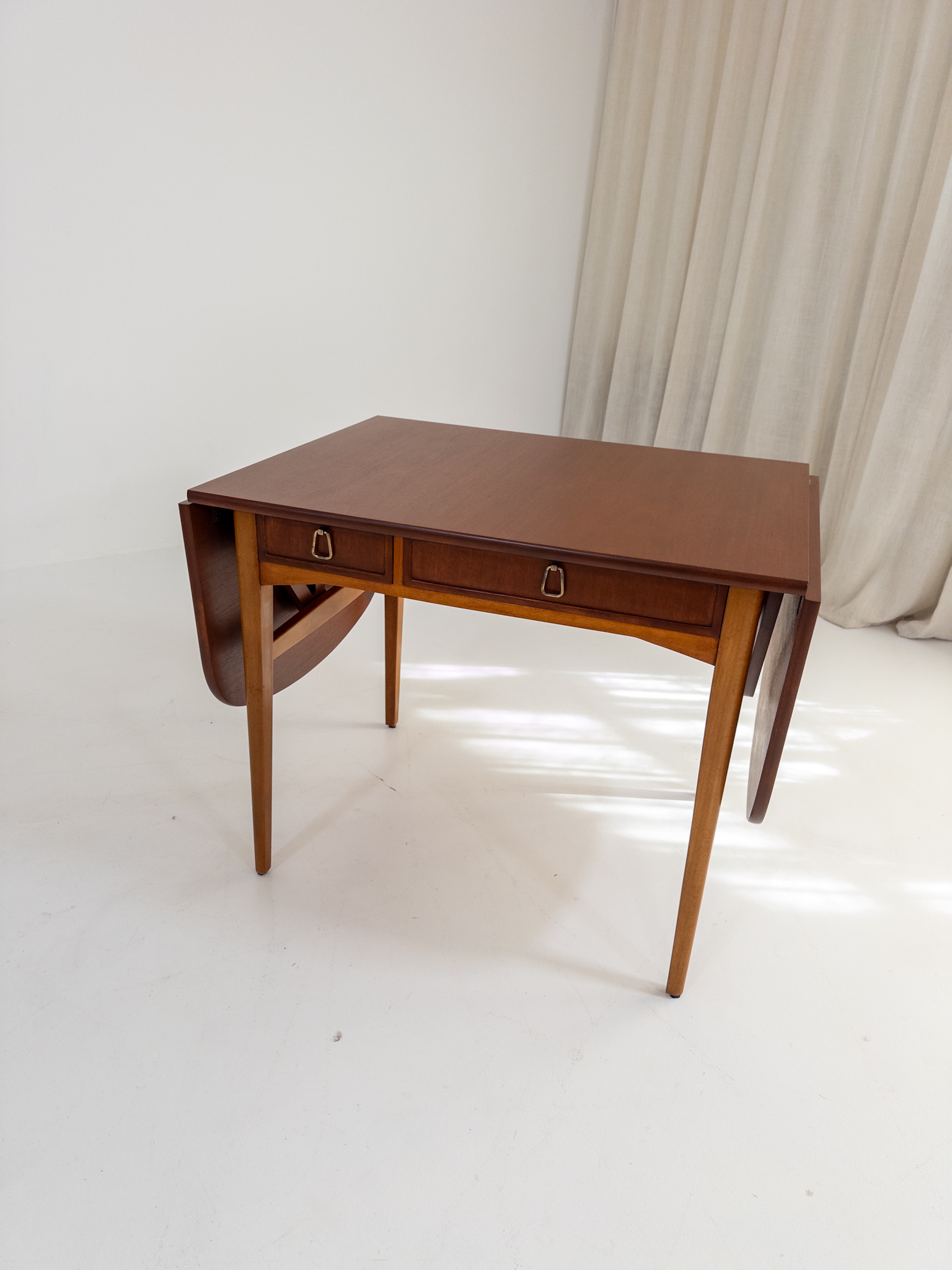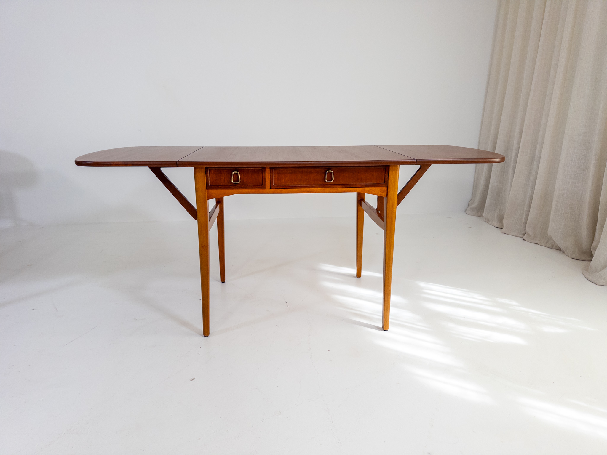 Nätt och elegant skrivbord / klaffbord från 50-tal i teak och bok med fina, väl avvägda proportioner och en form som gör det lika användbart som vackert.