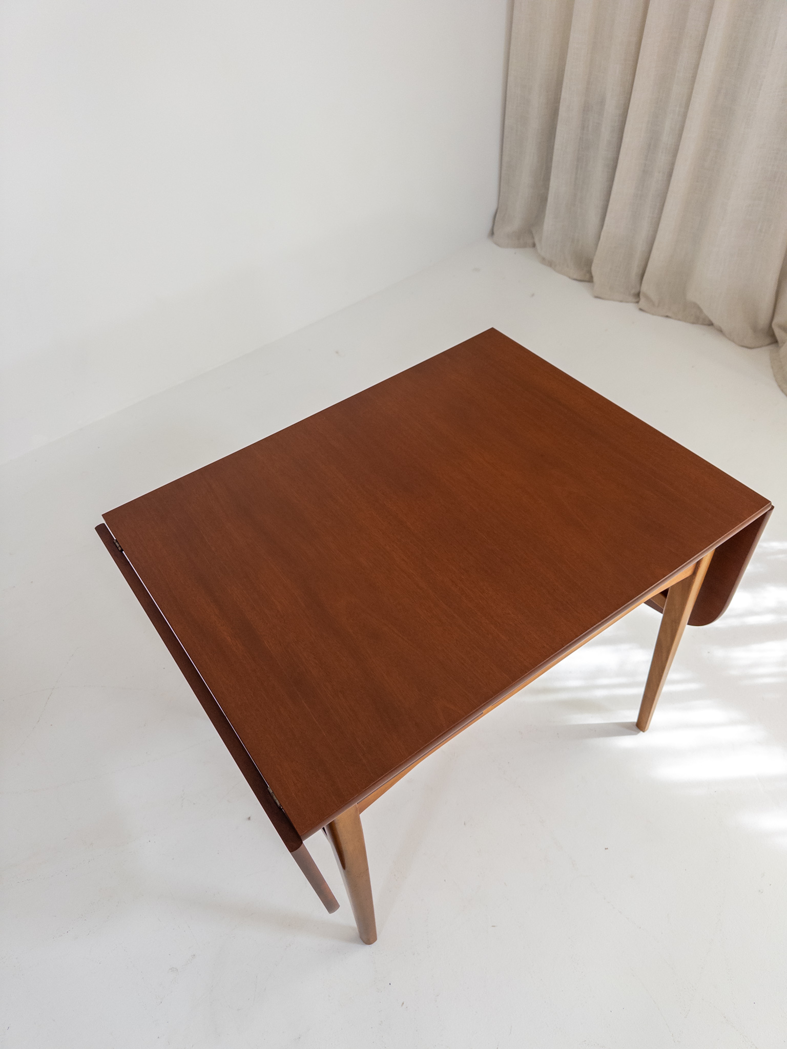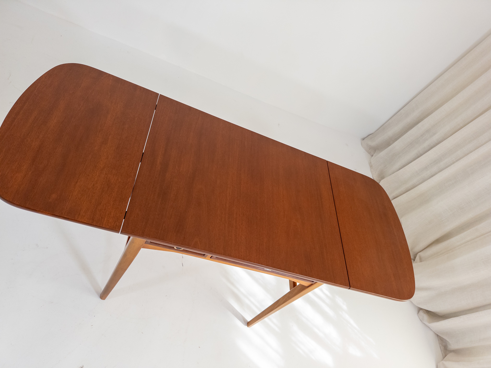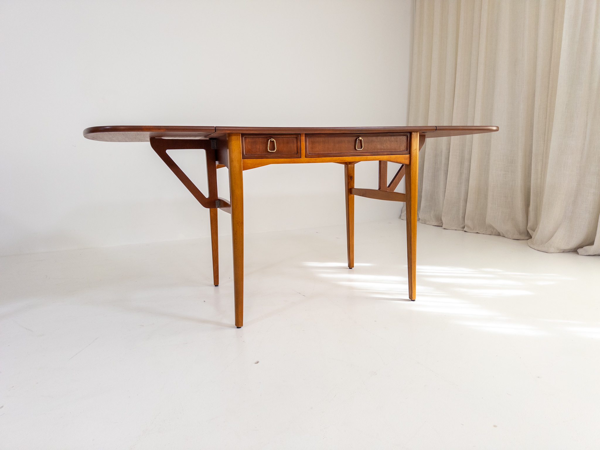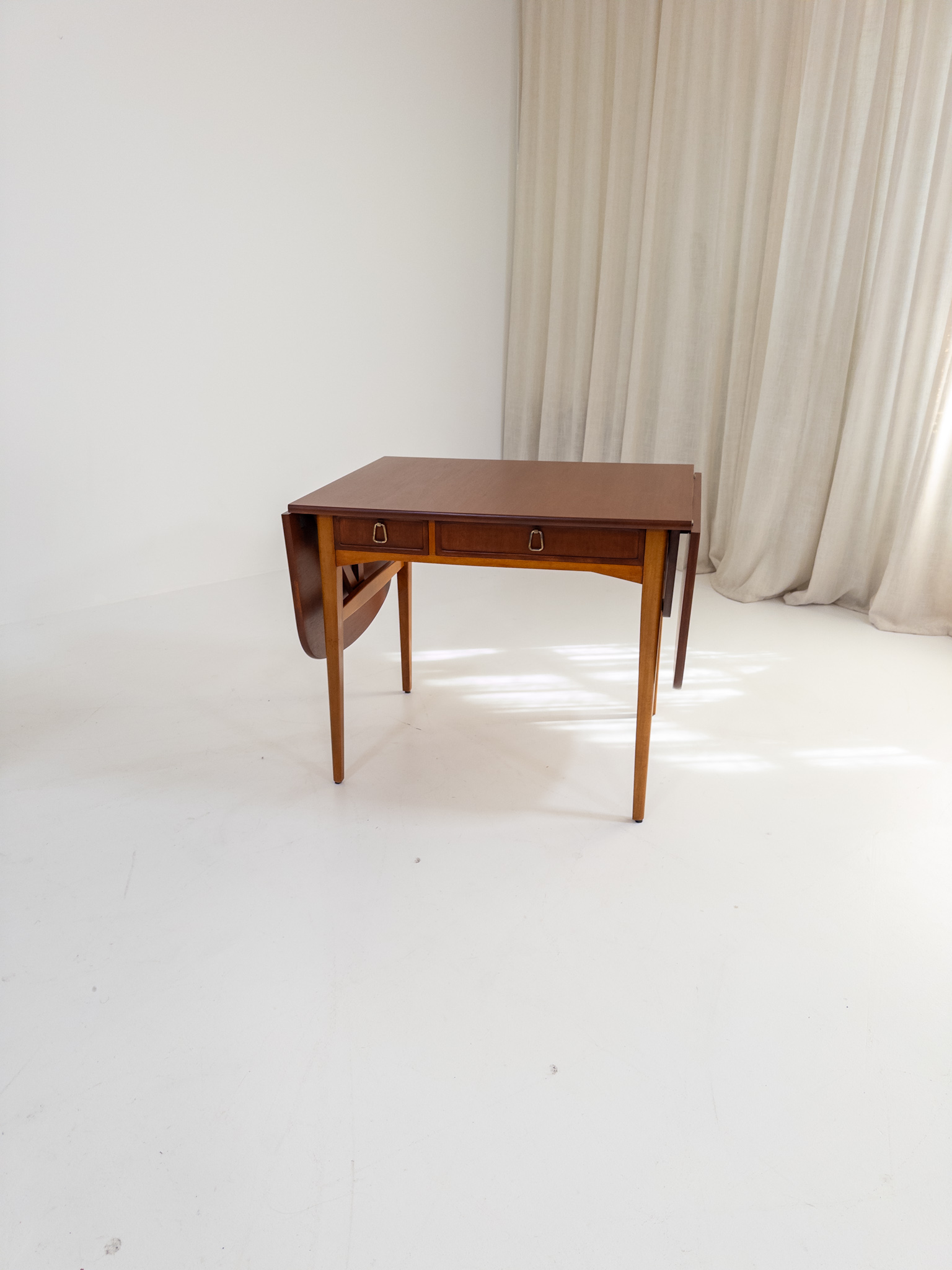 Nätt och elegant skrivbord / klaffbord från 50-tal i teak och bok med fina, väl avvägda proportioner och en form som gör det lika användbart som vackert.