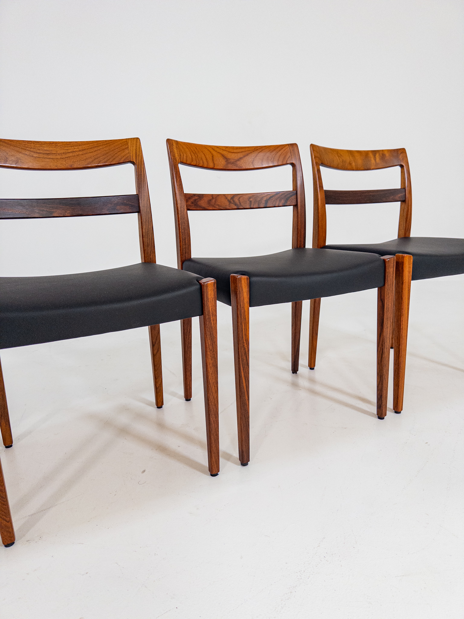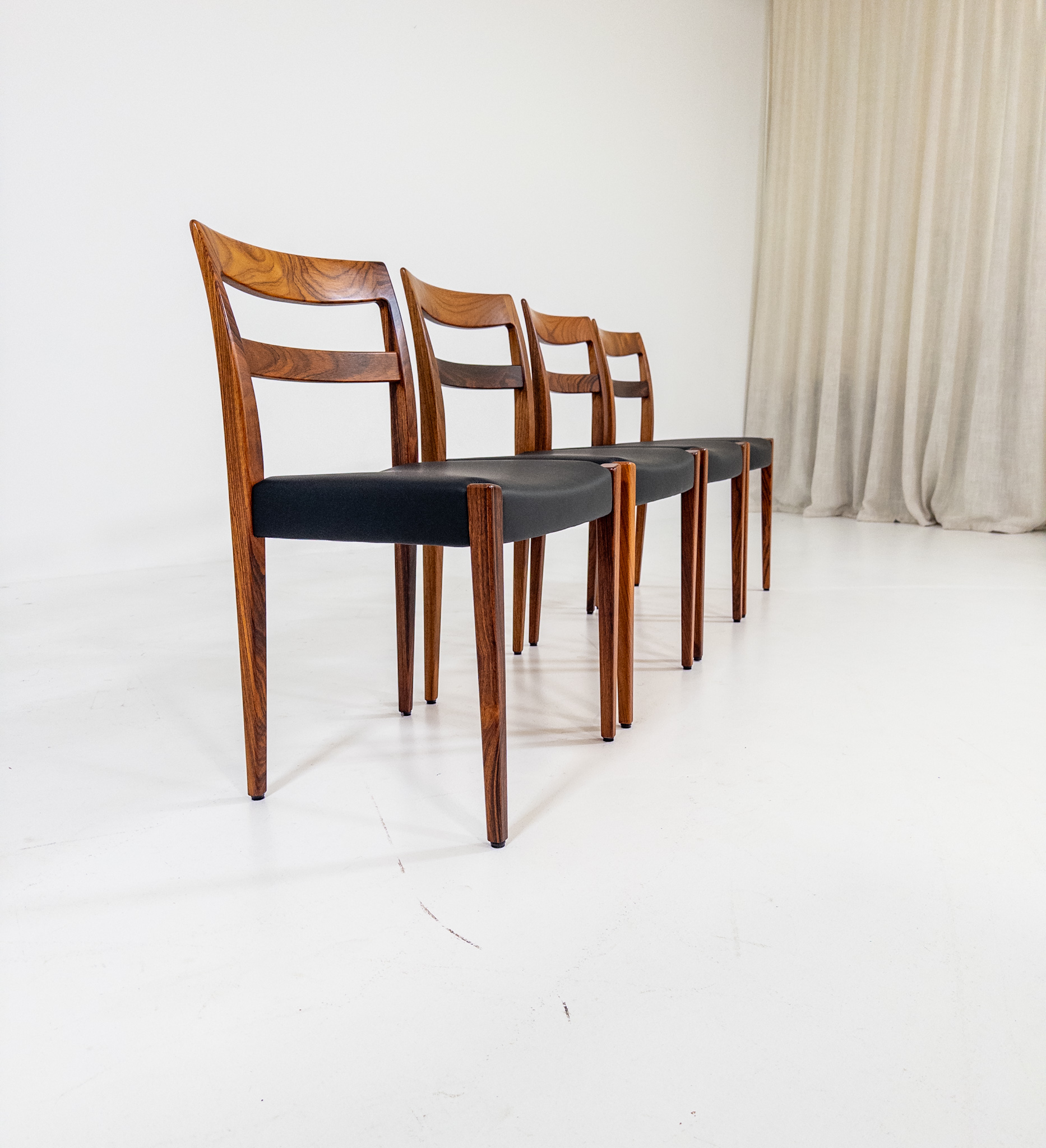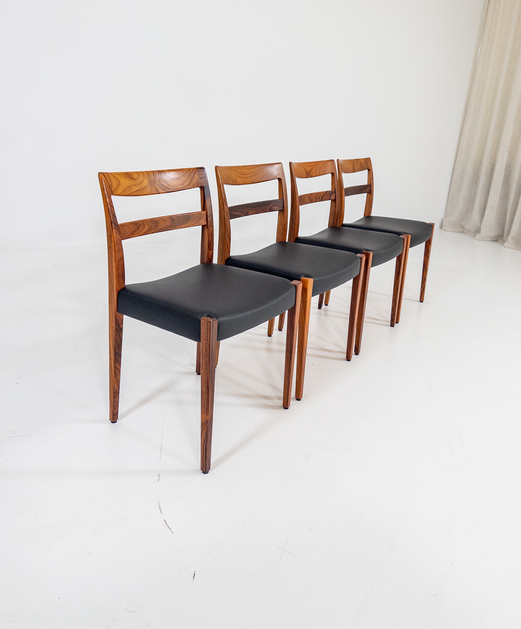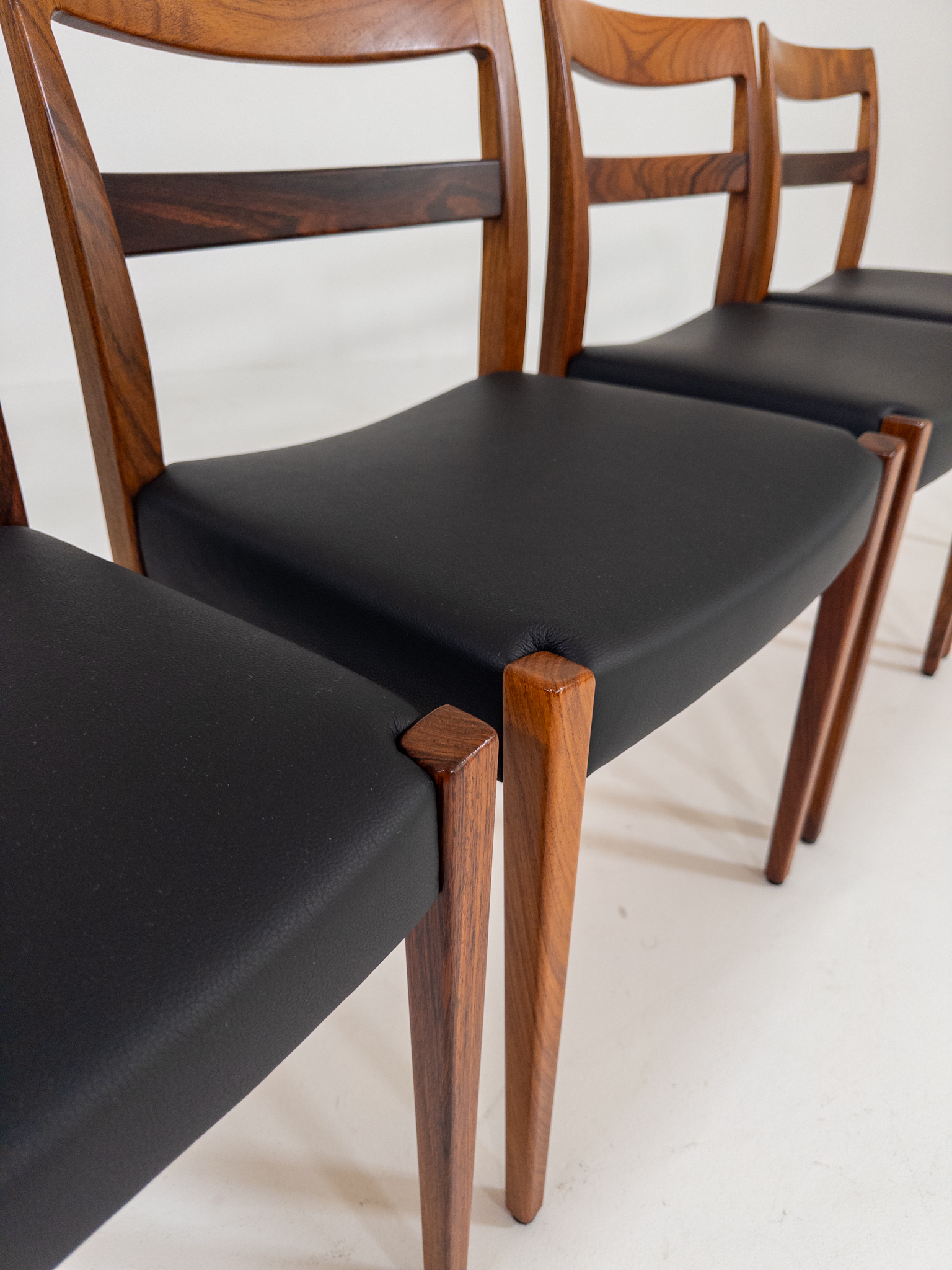 Tillverkade i vacker jakaranda / Santos Rosewood med livfull ådring och djup ton. Stolarna är dessutom nyomklädda i svart äkta skinn, vilket ger dem ett exklusivt och tidlöst uttryck.