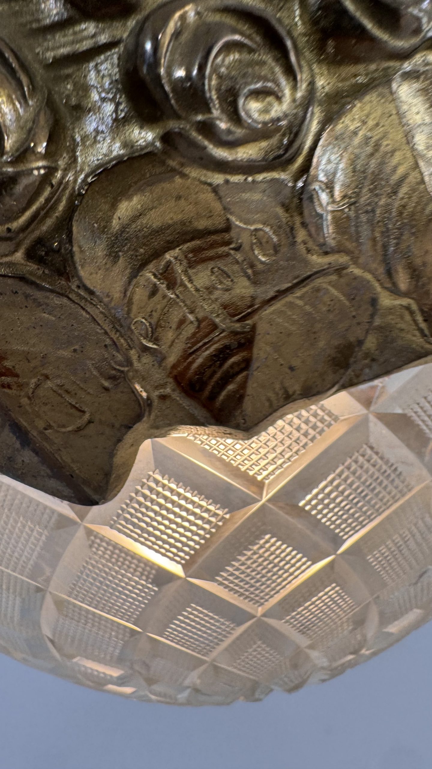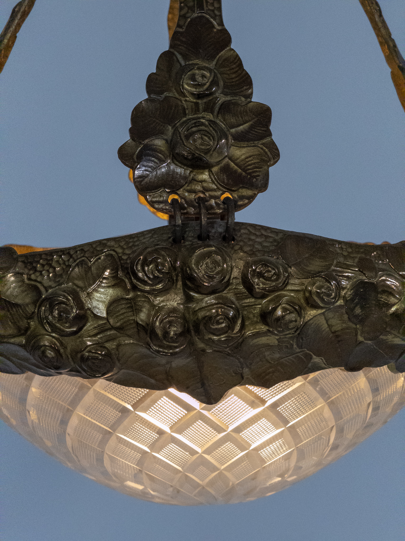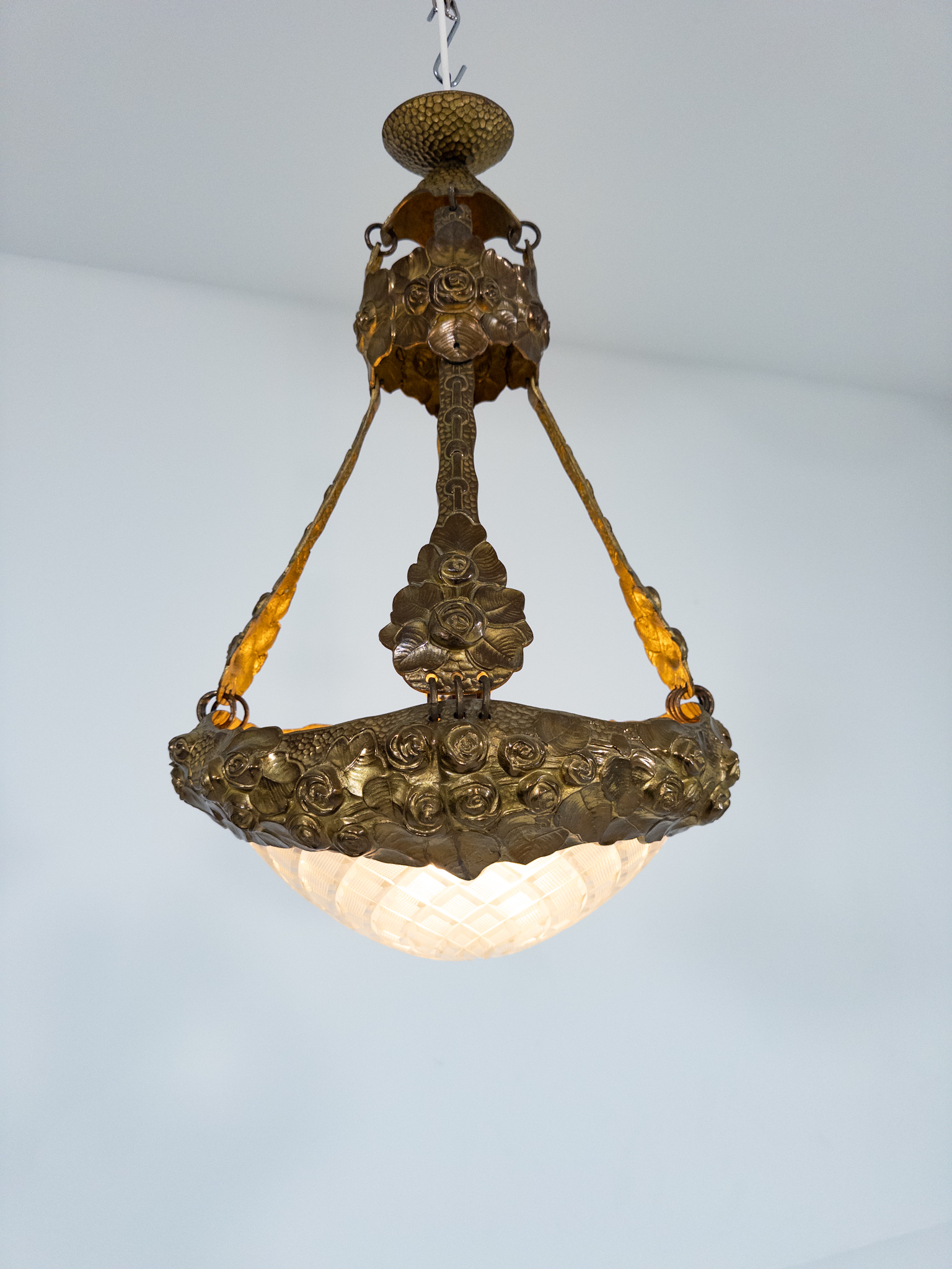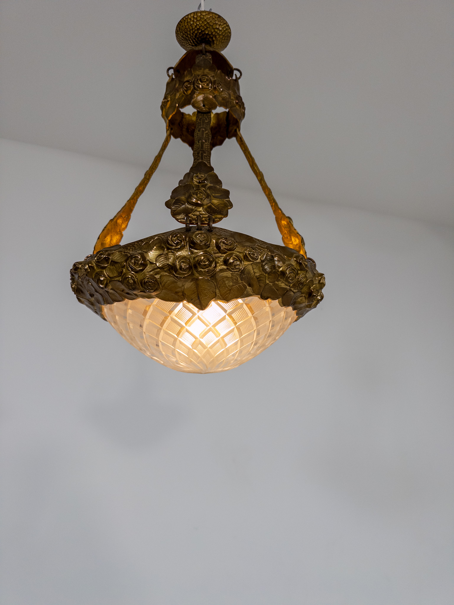 Stommen i patinerad metall är rikt dekorerad med rosor i relief, och den kupade glasskärmen med slipat rutmönster ger ett varmt och behagligt ljus. Kombinationen av den signerade metallstommen och den vackra glaskupan gör detta till ett mycket dekorativt och samlarvärt objekt.