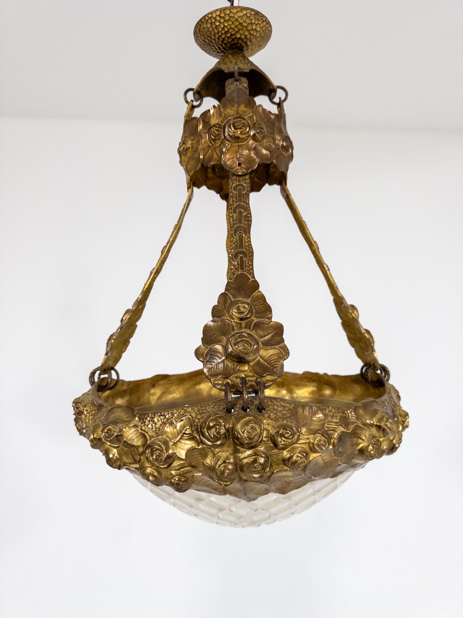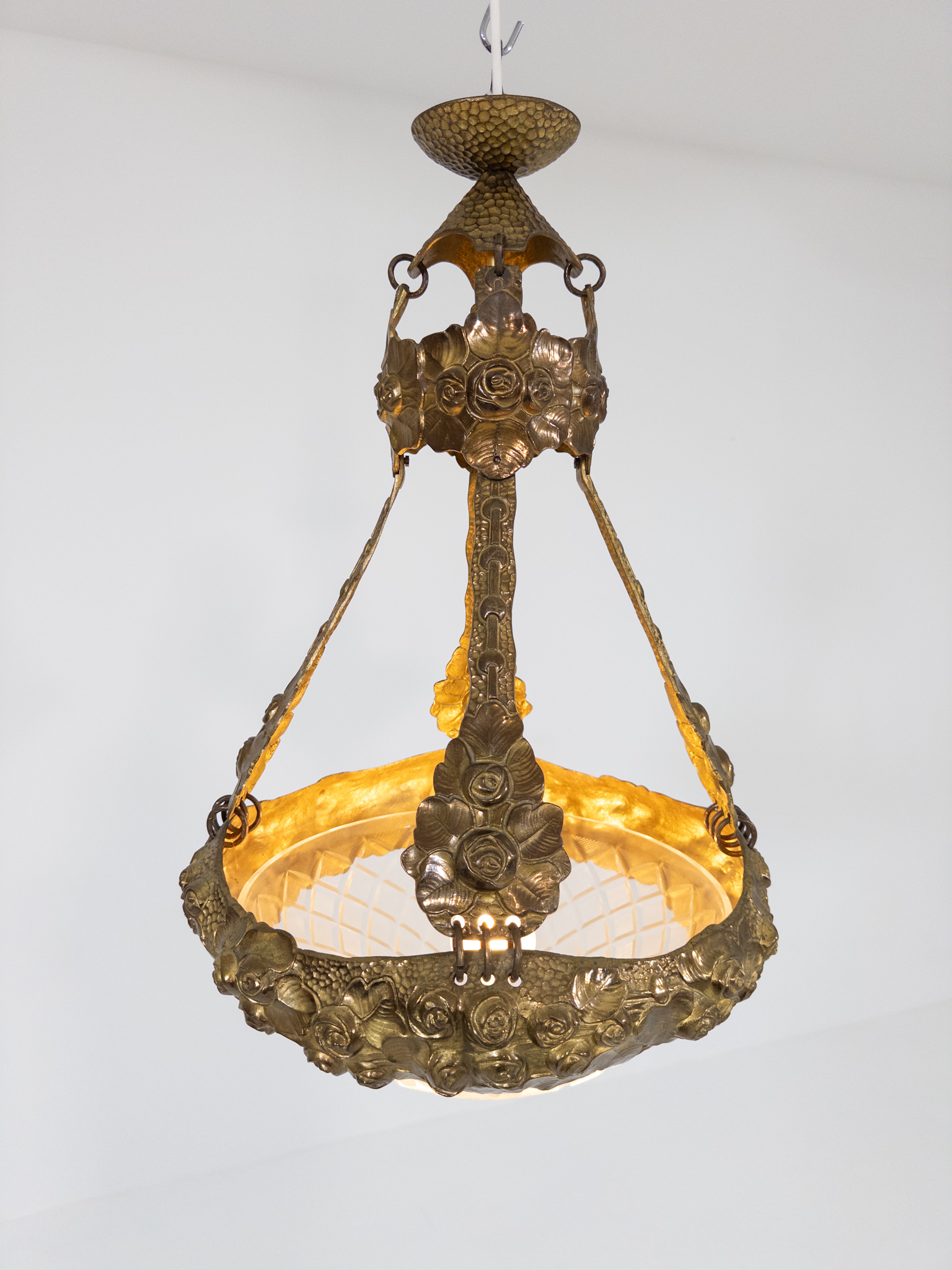 Elegant och ovanlig taklampa i jugendstil med rik, skulptural dekor av rosor och organiska former. Lampan är signerad i metallen och tillskrivs Alice Nordin, en av Sveriges främsta skulptörer under det tidiga 1900-talet.