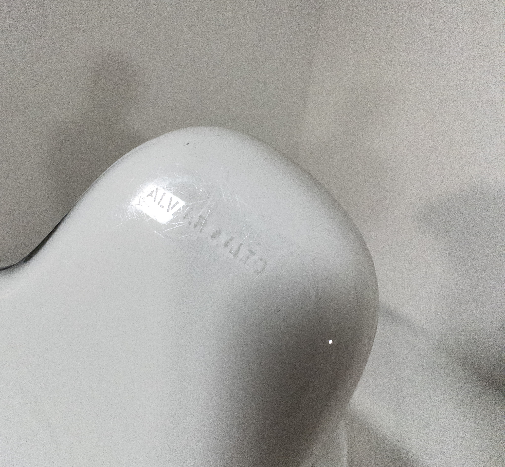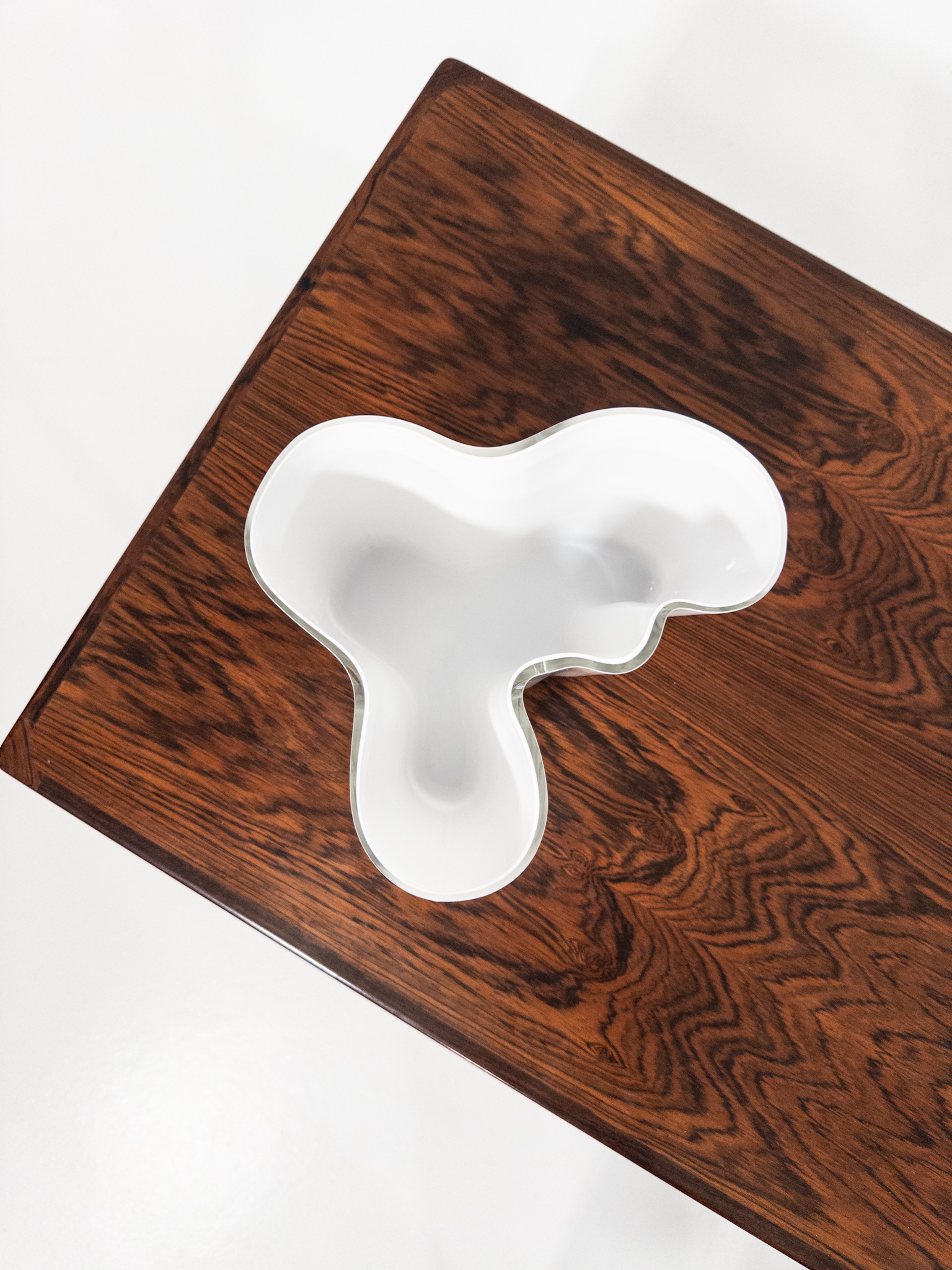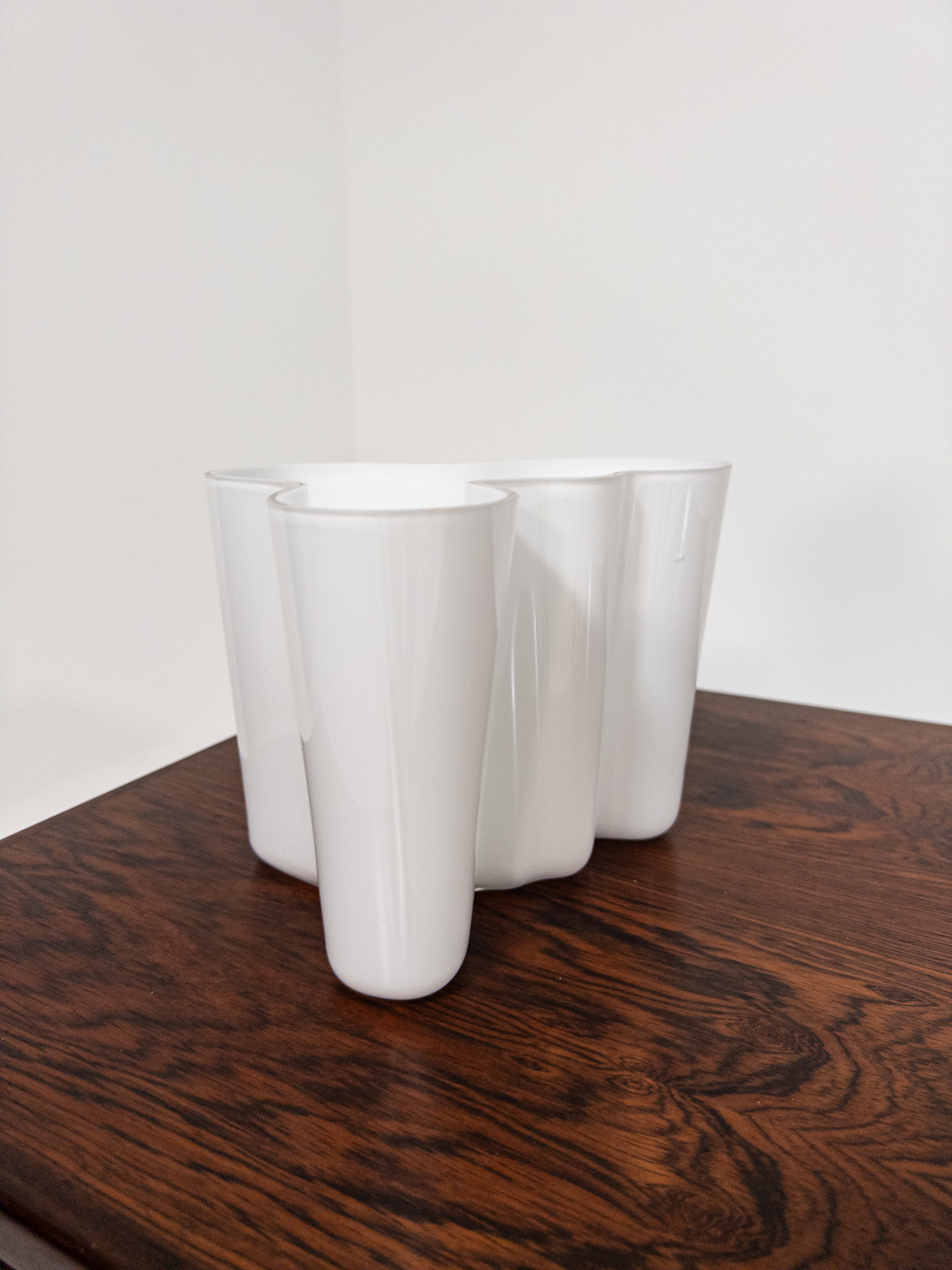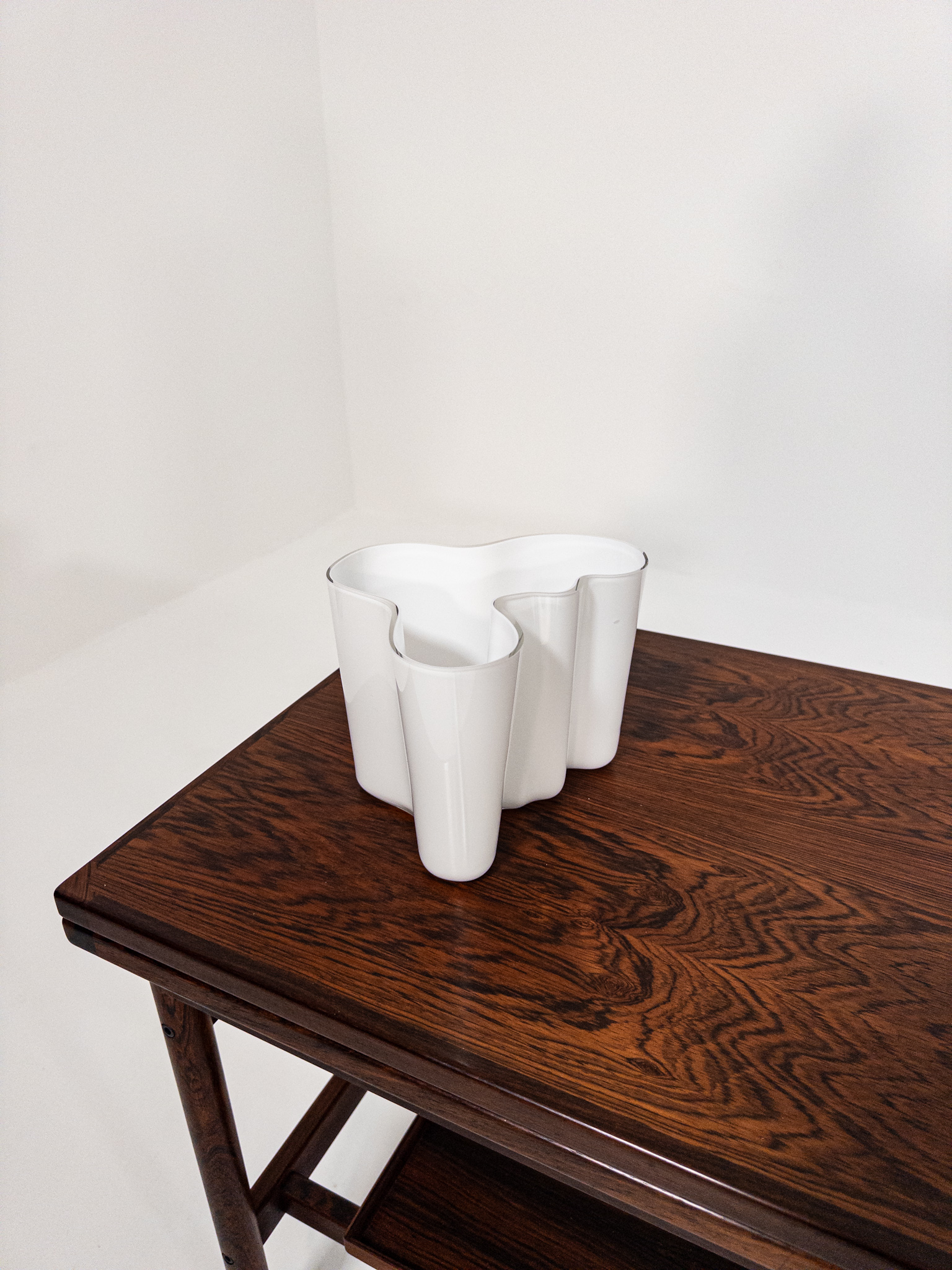 Detta exemplar i vit opalglasering är i mycket fint skick och bär den präglade signeringen “Alvar Aalto” undertill. En perfekt detalj för den stilmedvetna som söker ett klassiskt men samtidigt skulpturalt inslag i hemmet. Passar lika bra som vas som solitär designskulptur.