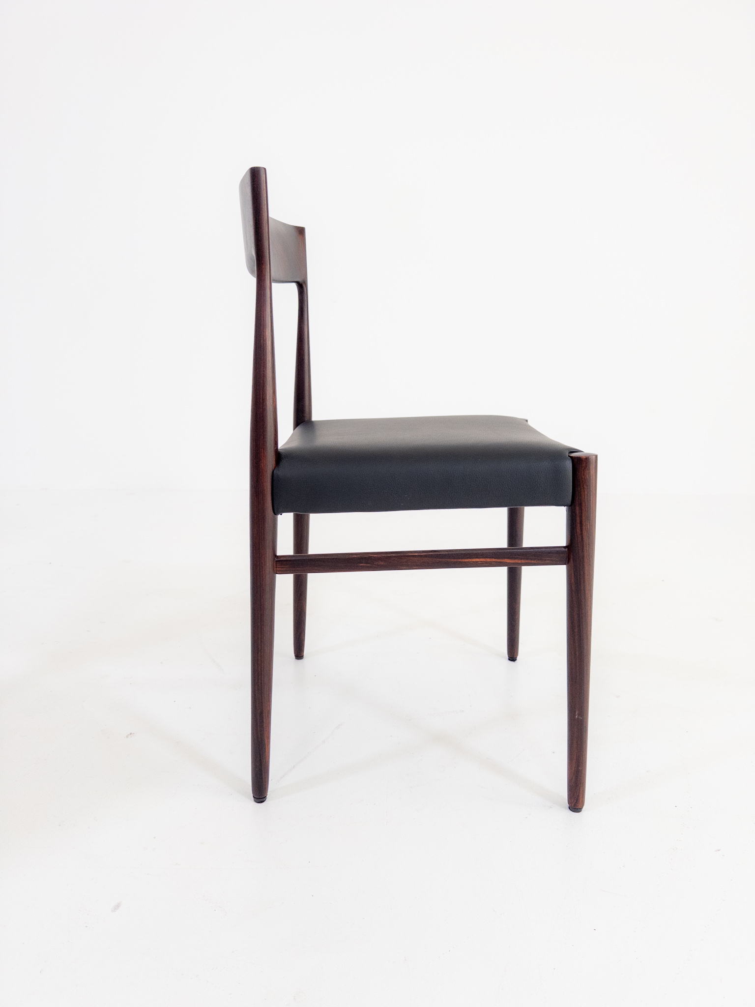 Professionellt restaurerade av vårt team av snickare och tapetserare. Nyslipade och omklädda i svart skinn, vilket ger en exklusiv kontrast till det mörka träet och gör dem redo för många års användning.