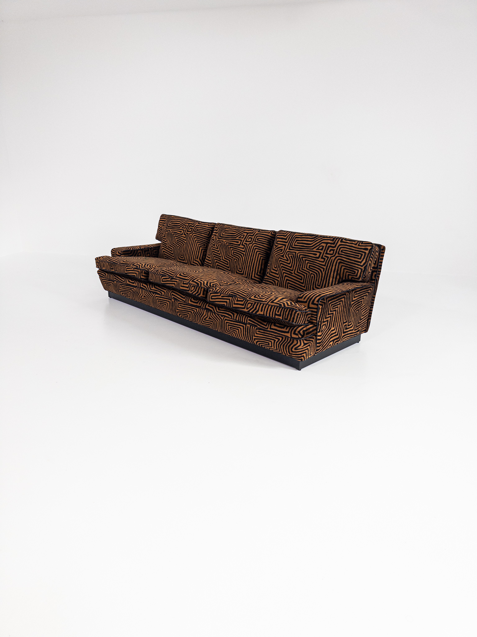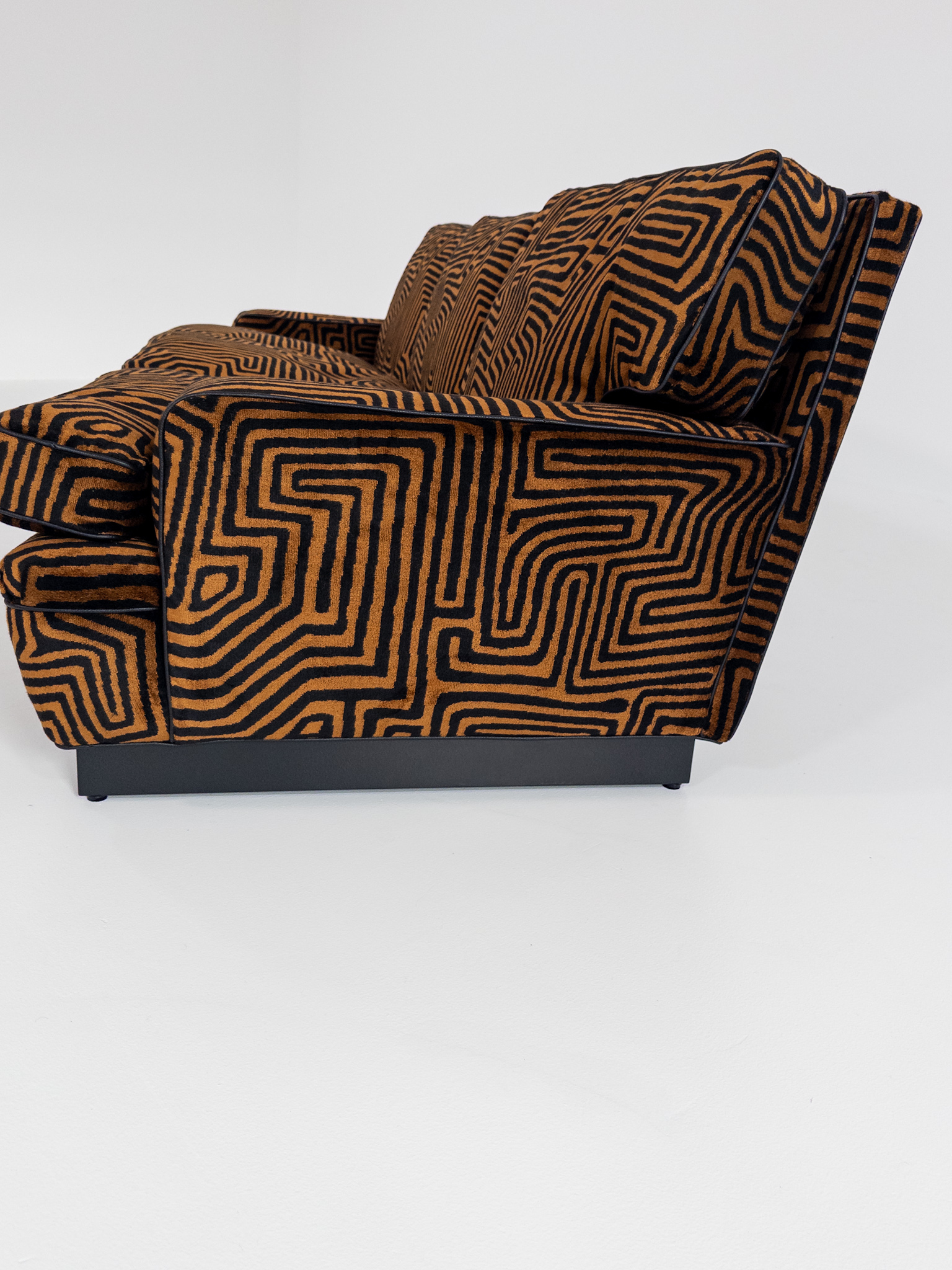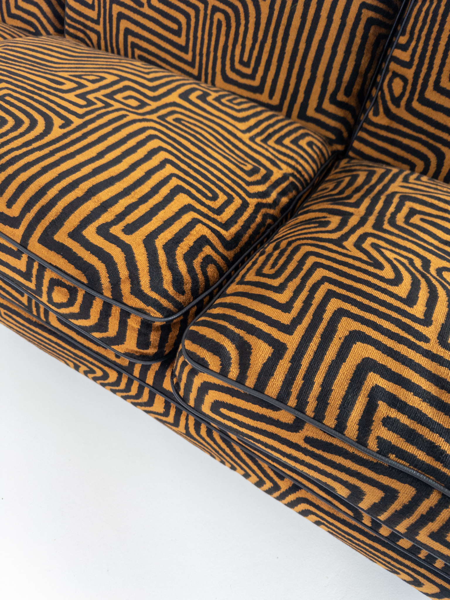 Denna unika To-Die-For Edition är klädd i ett spektakulärt labyrintmönstrat tyg från finska Lauritzon, där varm cognac och ockra möter djupaste svart. Ett konstverk i textil som förvandlar soffan till ett visuellt statement – och rummet till en scen.