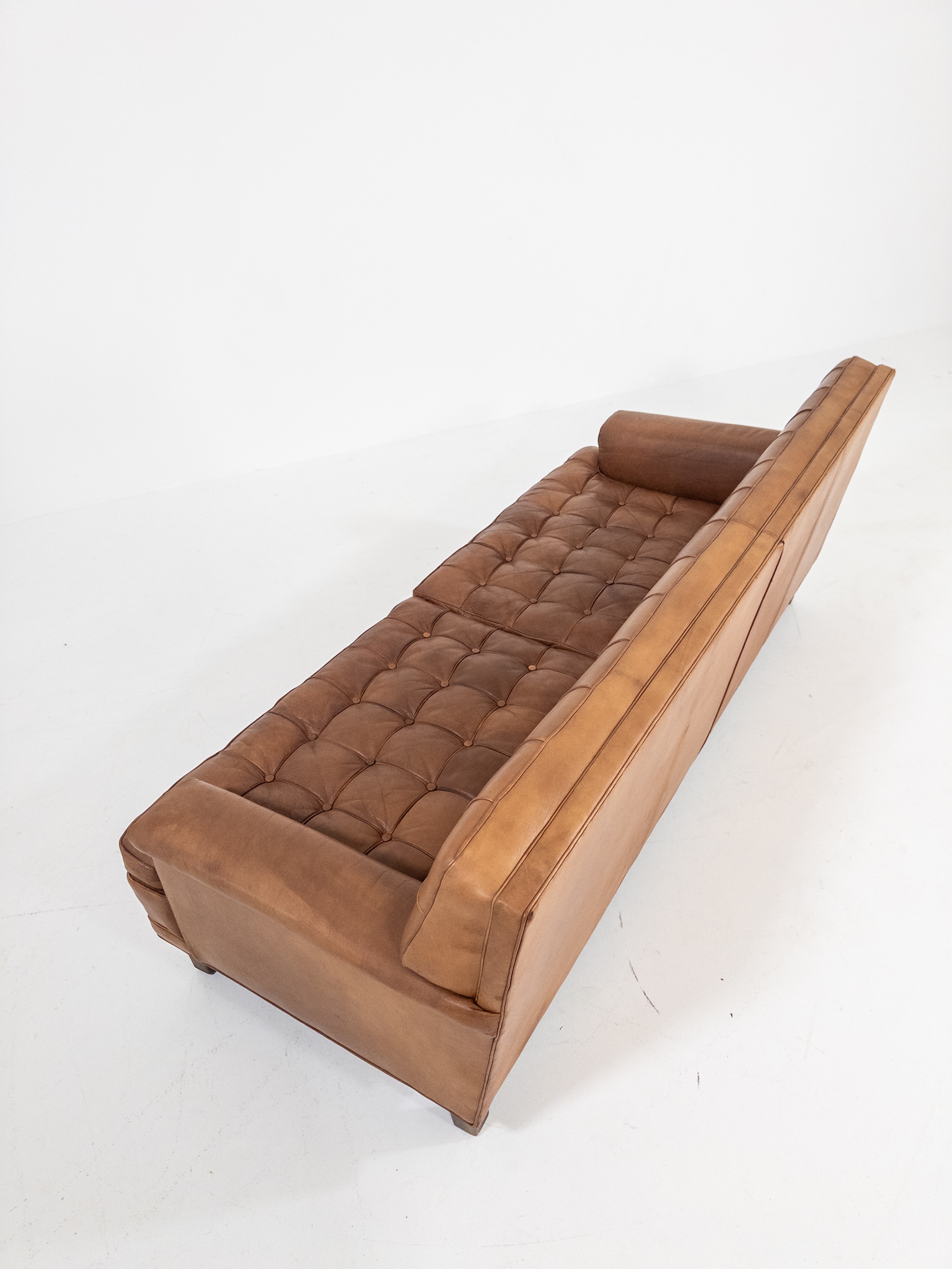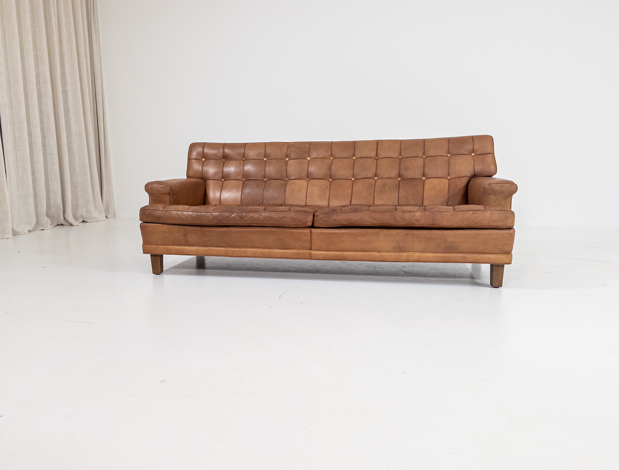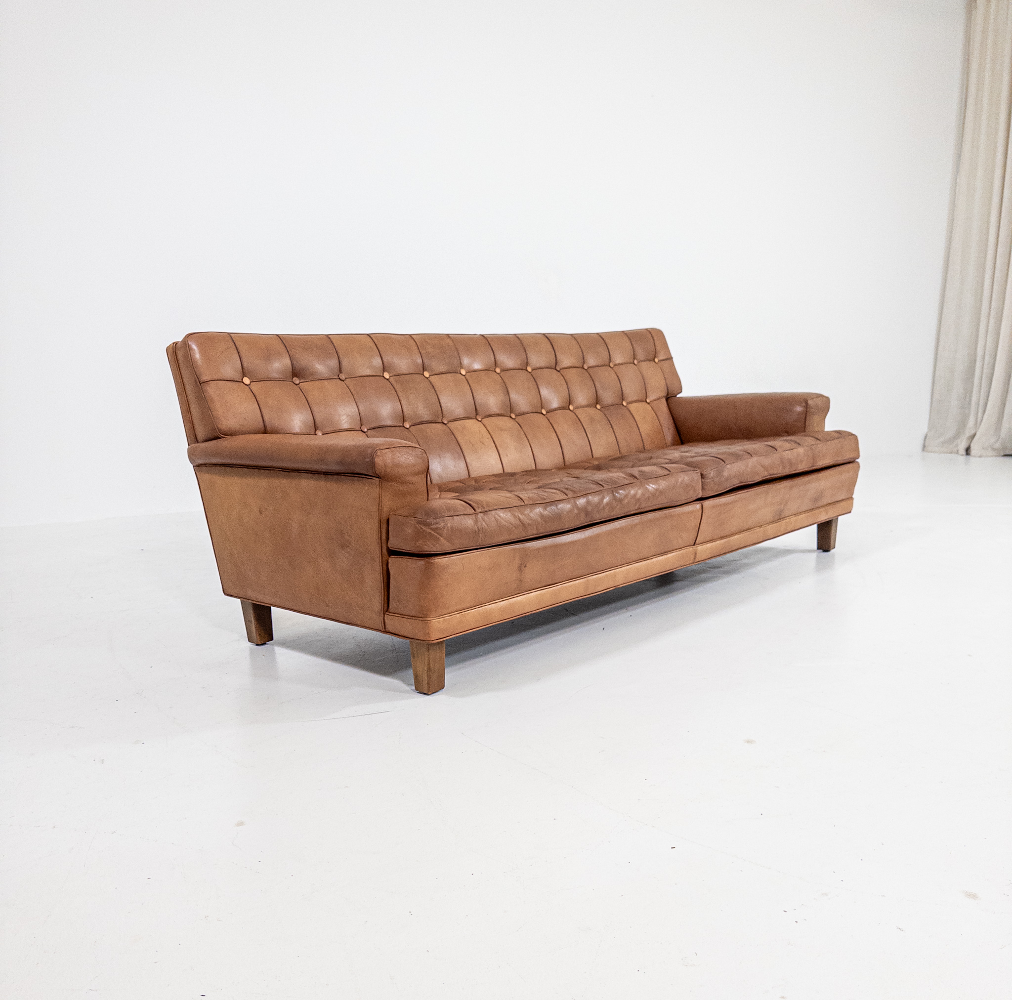 Soffan har en fantastisk karaktär med sin djuphäftade rygg och sitt dynparti, där varje knapp och söm skapar ett levande uttryck. Klädd i ett varmt cognacsfärgat skinn med en vacker, naturlig patina som bara blivit finare med åren.