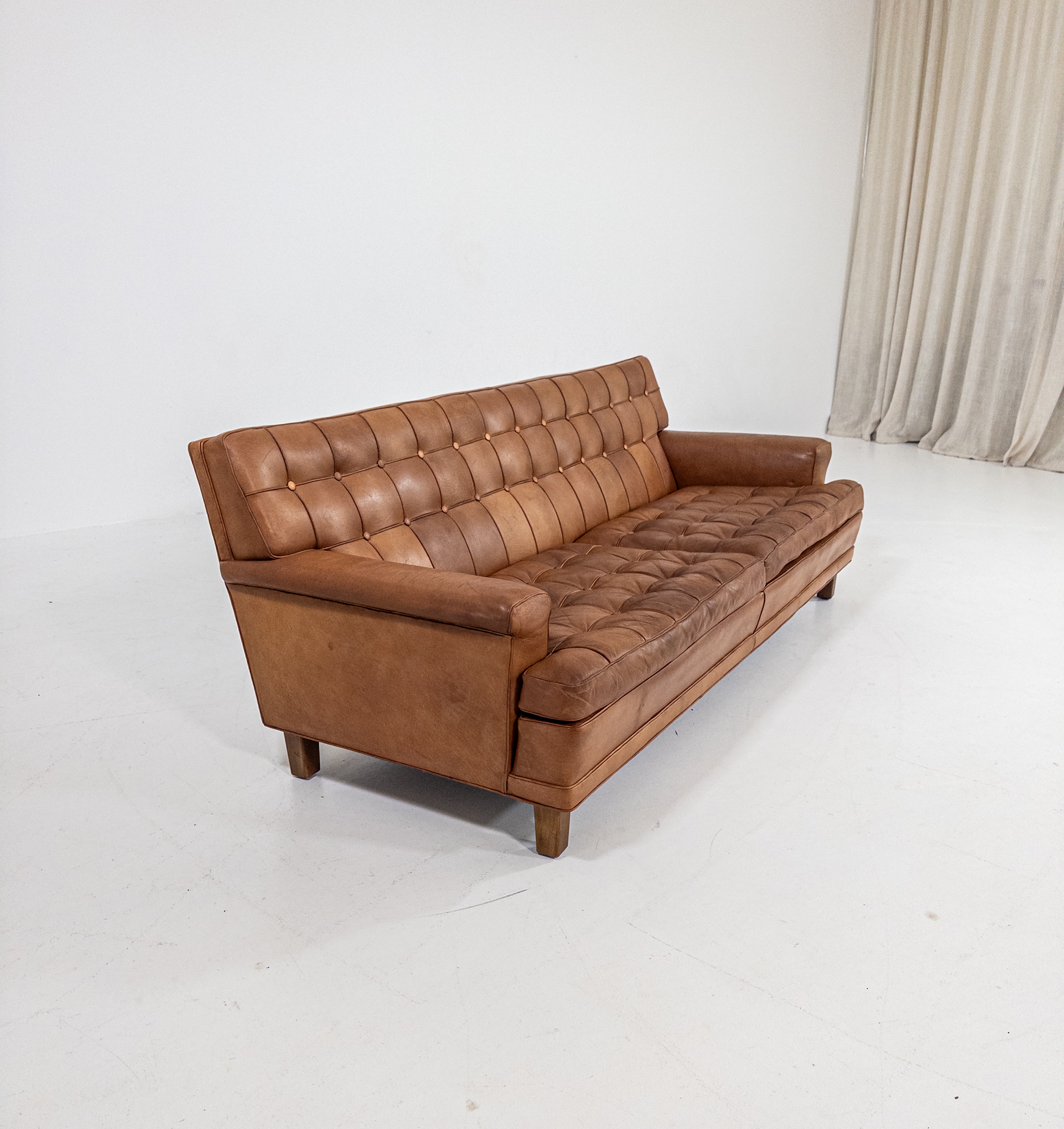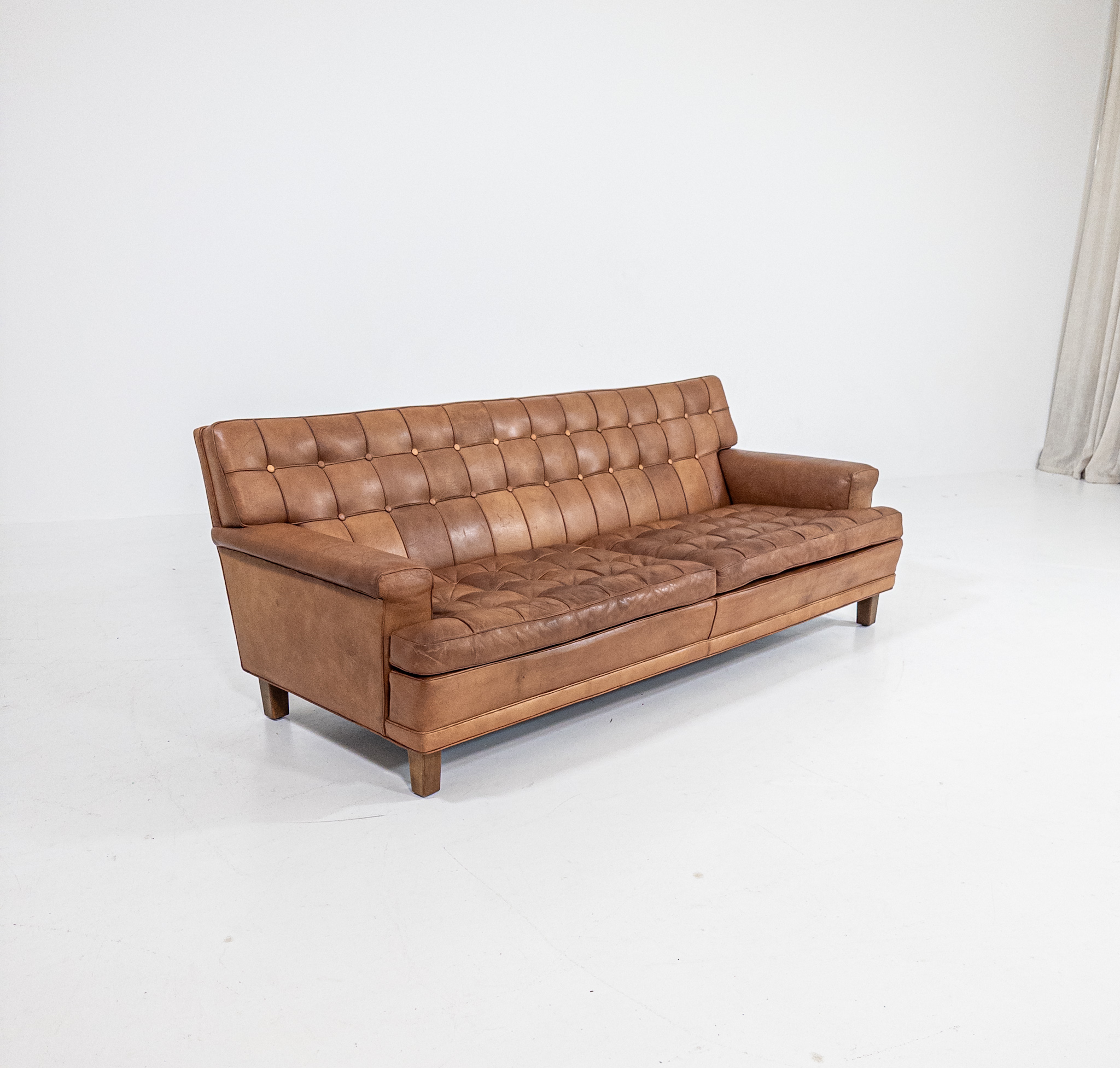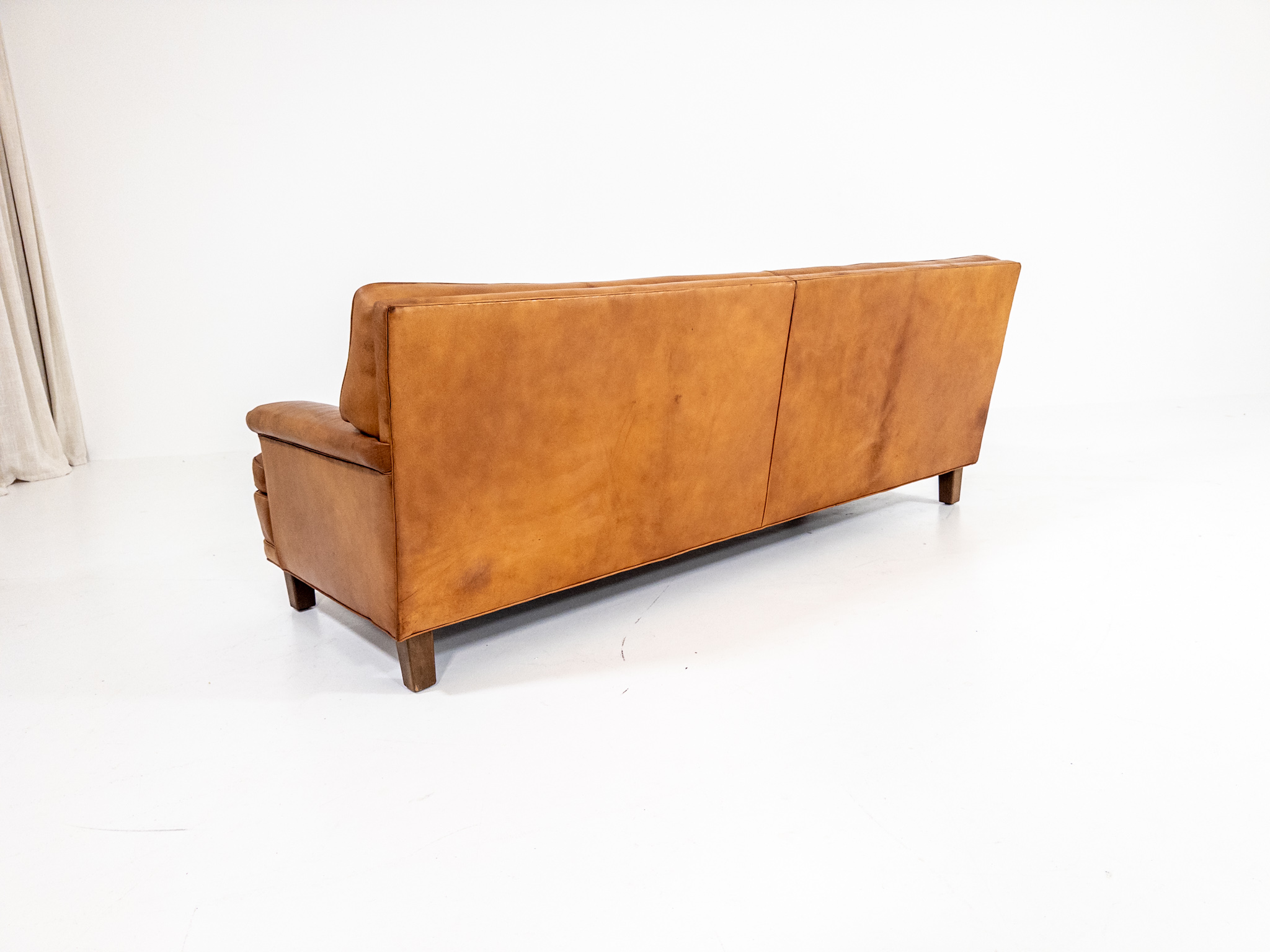 Soffan har en fantastisk karaktär med sin djuphäftade rygg och sitt dynparti, där varje knapp och söm skapar ett levande uttryck. Klädd i ett varmt cognacsfärgat skinn med en vacker, naturlig patina som bara blivit finare med åren.