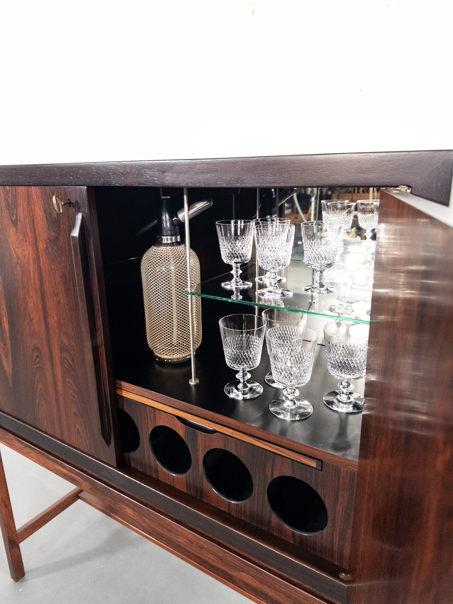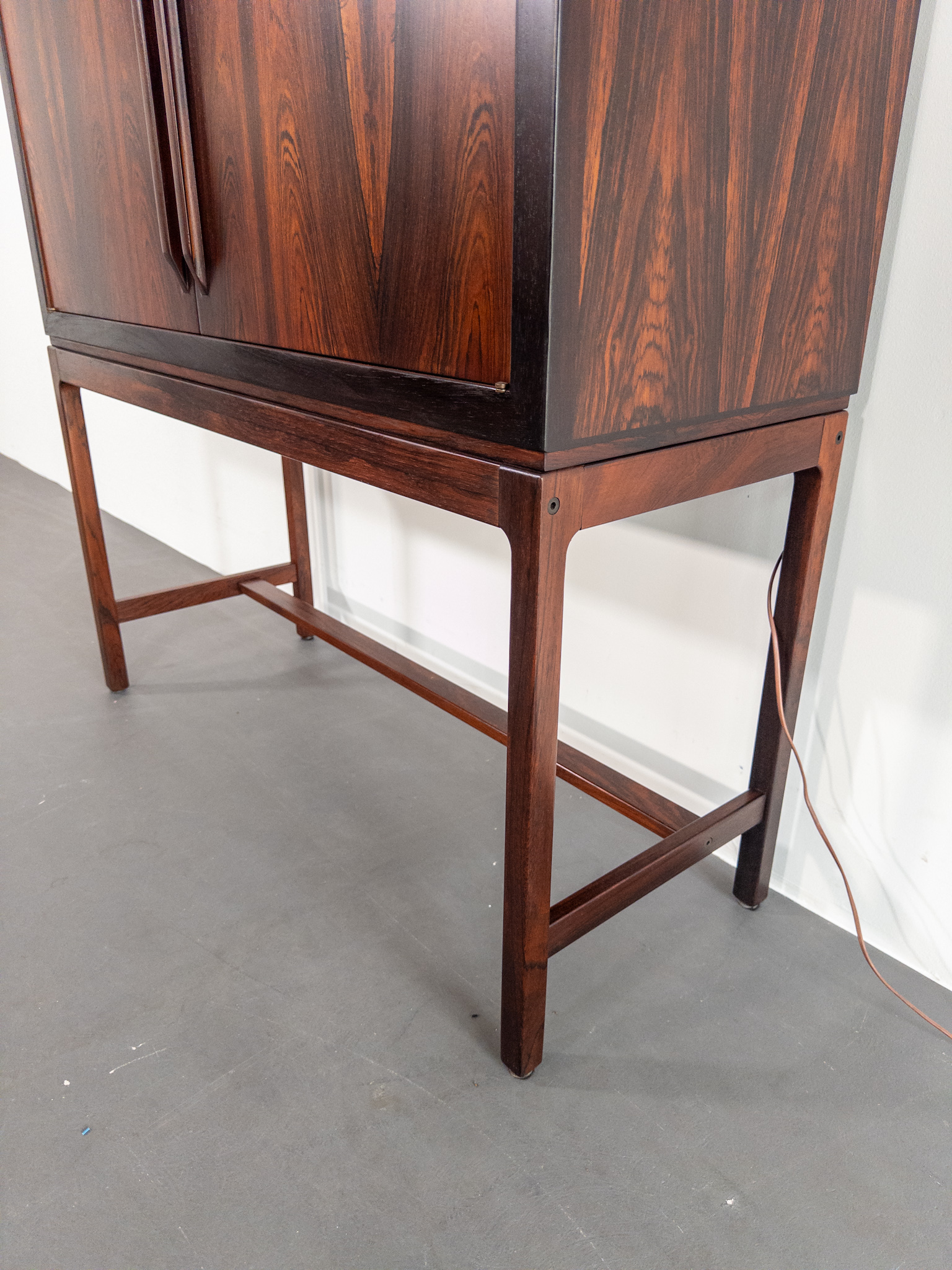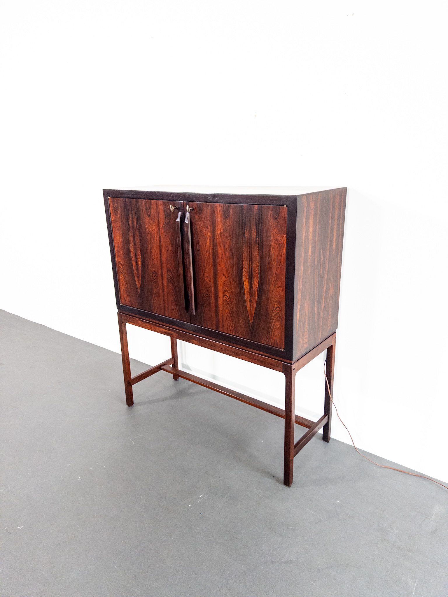 Skåpet vilar på ett lätt och stramt underrede med raka linjer, vilket kontrasterar mot den djupa och levande ådringen i jakarandan. Invändigt döljer sig en välplanerad barinredning med spegelglas, hyllplan i glas, flaskhållare samt en utdragbar avlastningsyta – perfekt för drinkblandning. Detaljerna i mässing och den sofistikerade designen vittnar om högkvalitativt nordiskt hantverk.