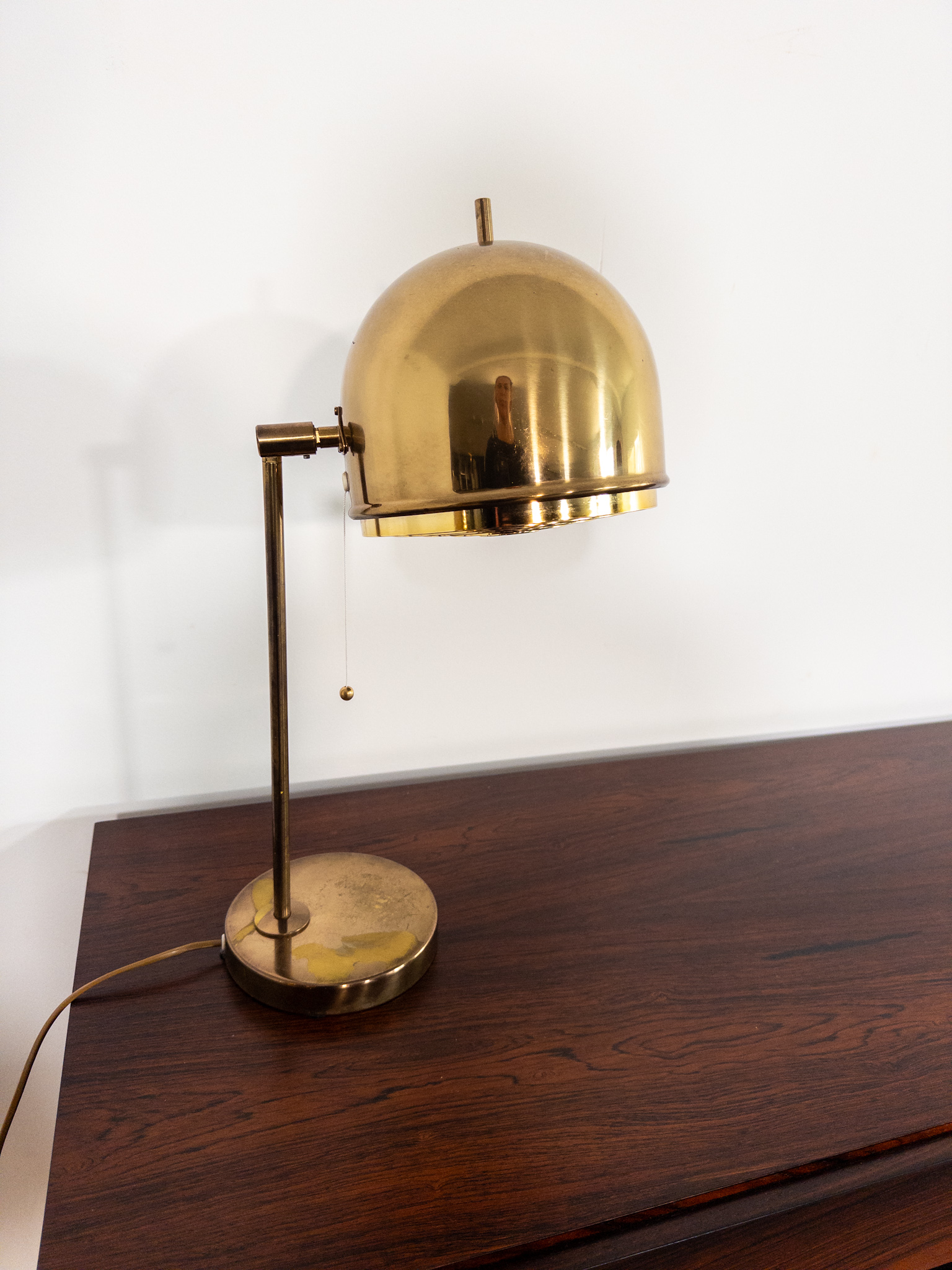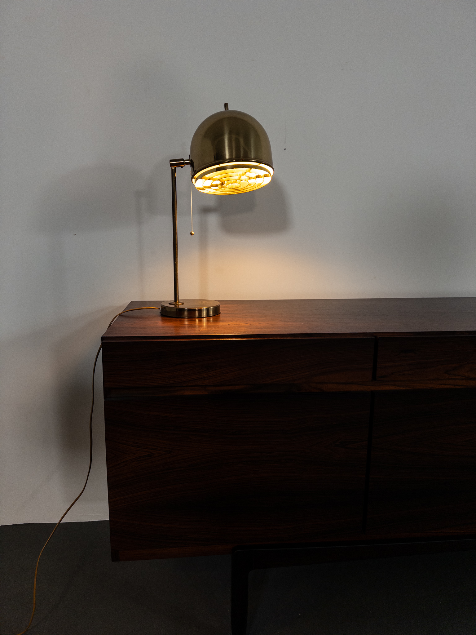 Elegant bordslampa i patinerad mässing med karakteristiskt kupolformat skärmhuvud och ett vackert guldfärgat raster som sprider ett mjukt, riktat sken. Typisk för Bergboms kvalitativa belysning där funktion möter tidlös design.