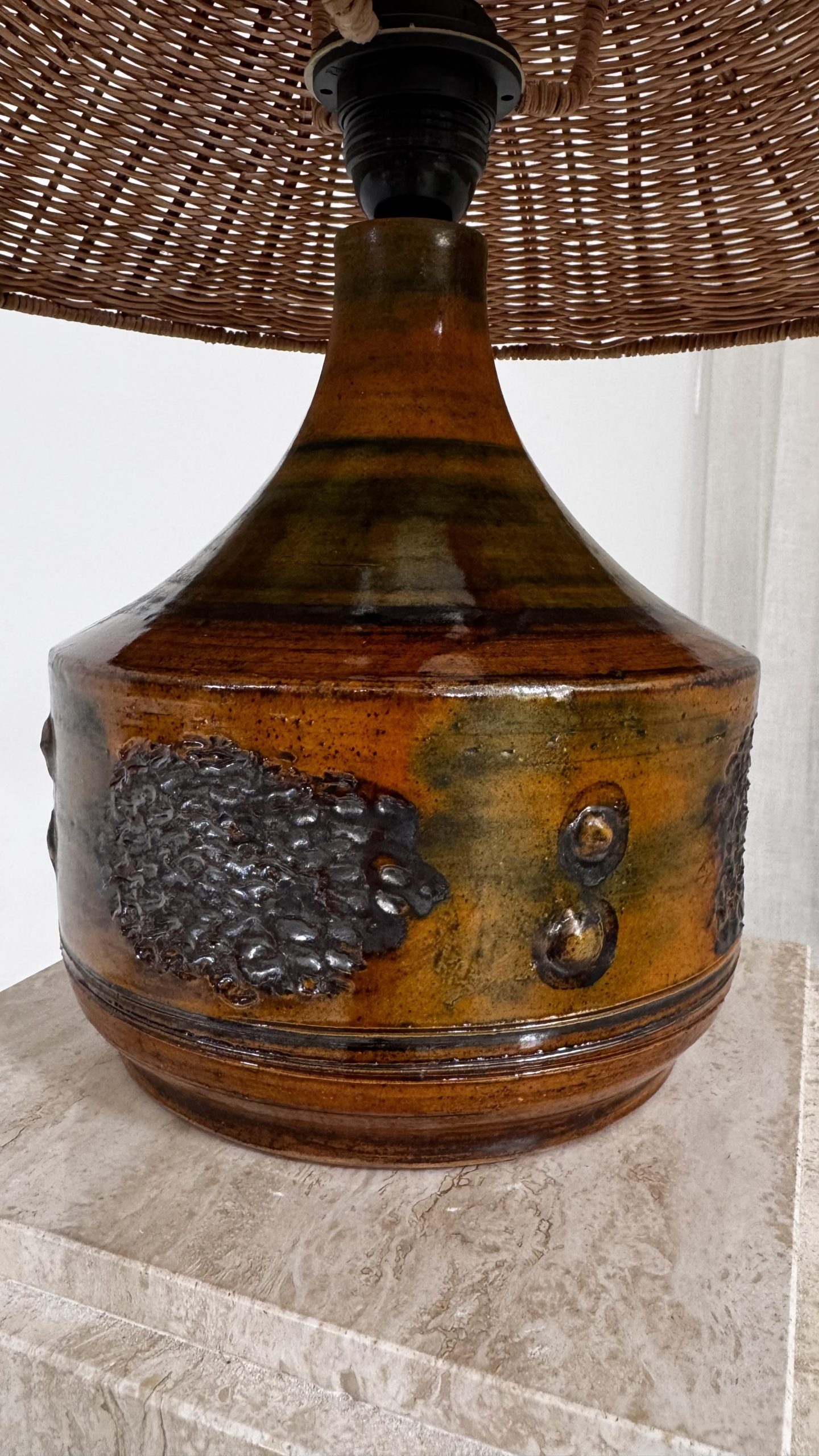 Vackert brunglaserad med djupa toner i honung, oliv och mörkbrunt. Den rustika reliefdekoren ger lampan karaktär och ett levande uttryck – ett fint exempel på den danska studiokeramikens formspråk under perioden.