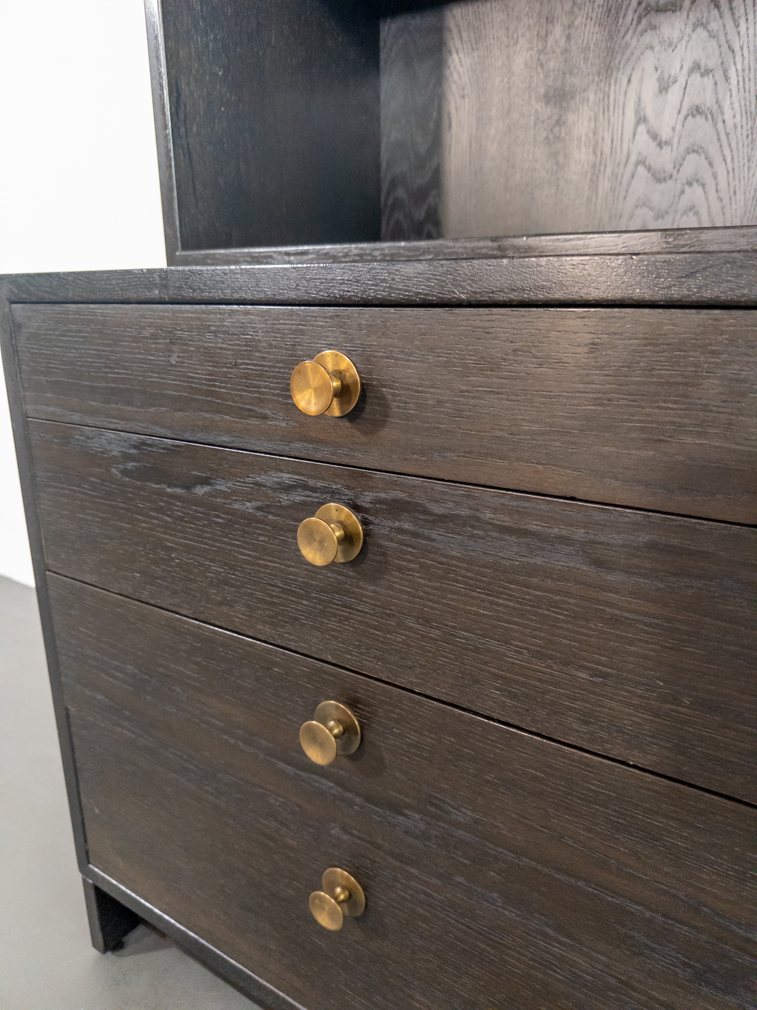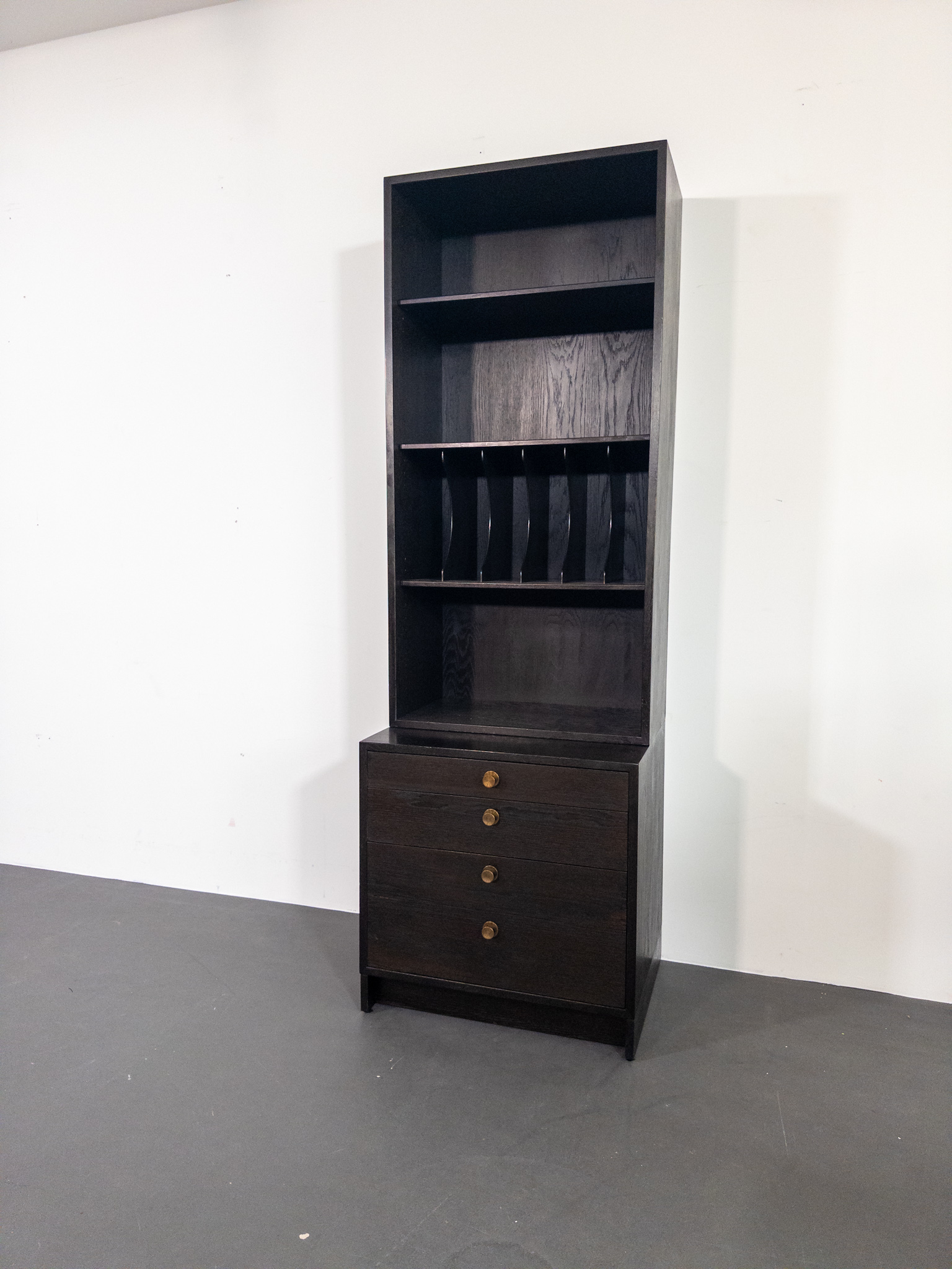 Elegant hög hylla i original svartbetsad ek, med mässingsdetaljer och klassiskt Mogensen-formspråk.