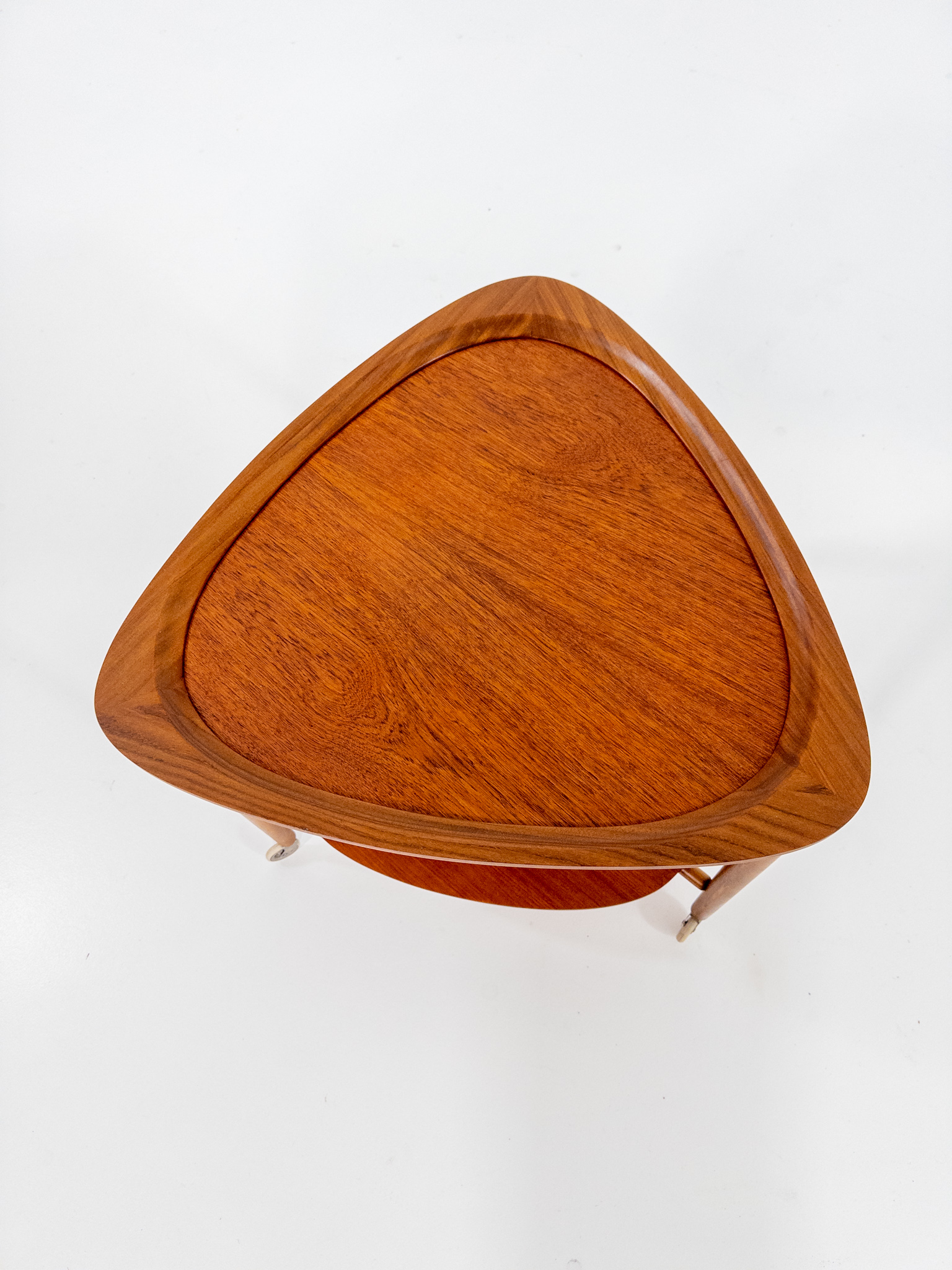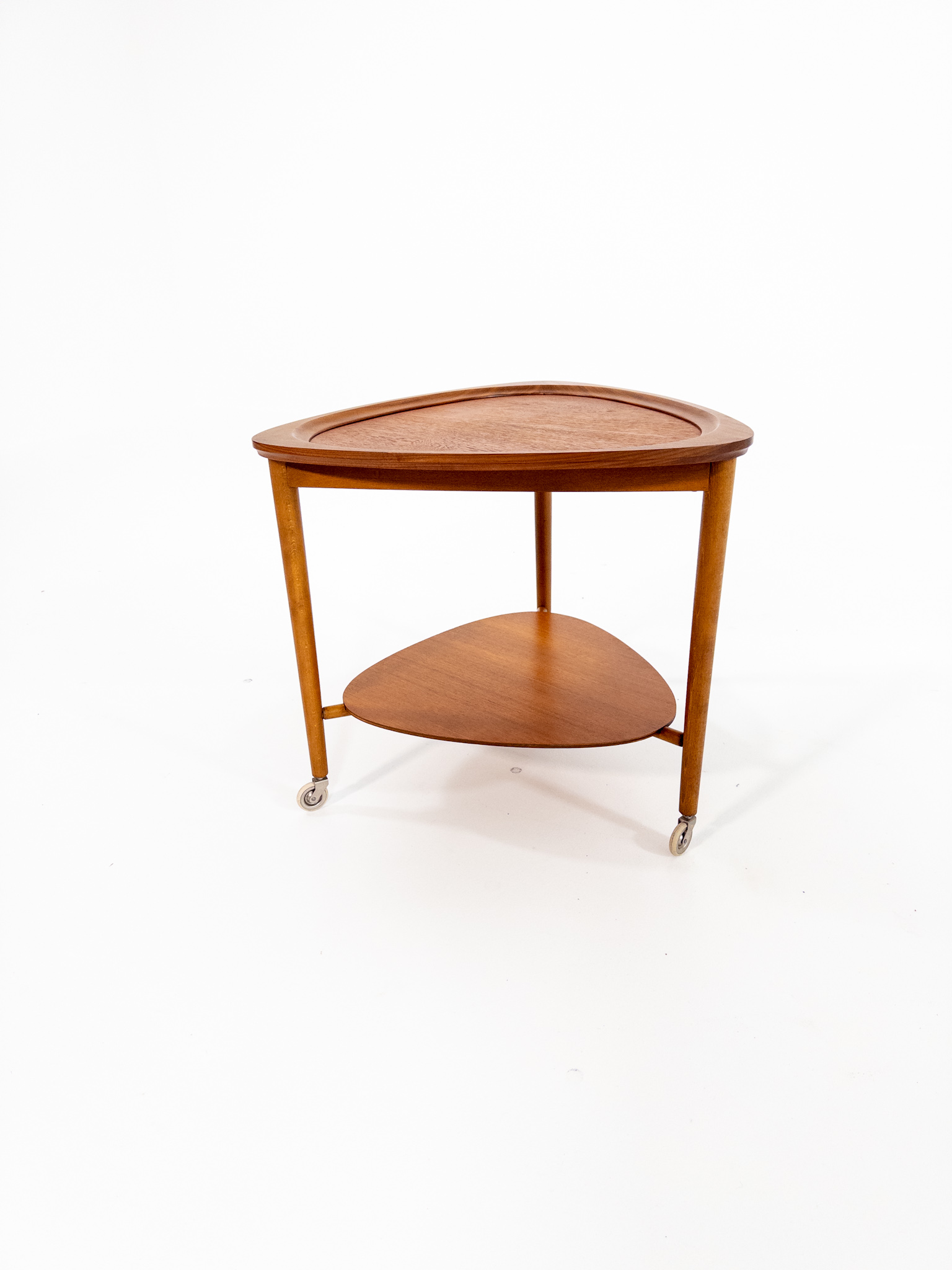 En elegant och skulptural drinkvagn i teak med ett mjukt triangulärt formspråk som är helt typiskt för dansk modernism. Det nedre hyllplanet speglar formen i en mindre skala och ger ett vackert visuellt flöde. Små originalhjul i metall/plast.