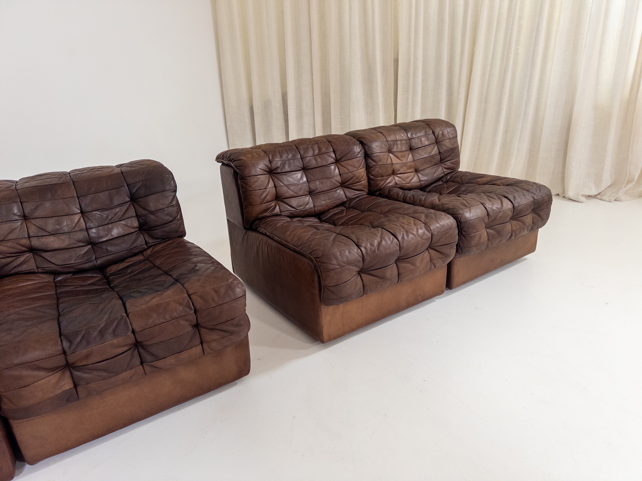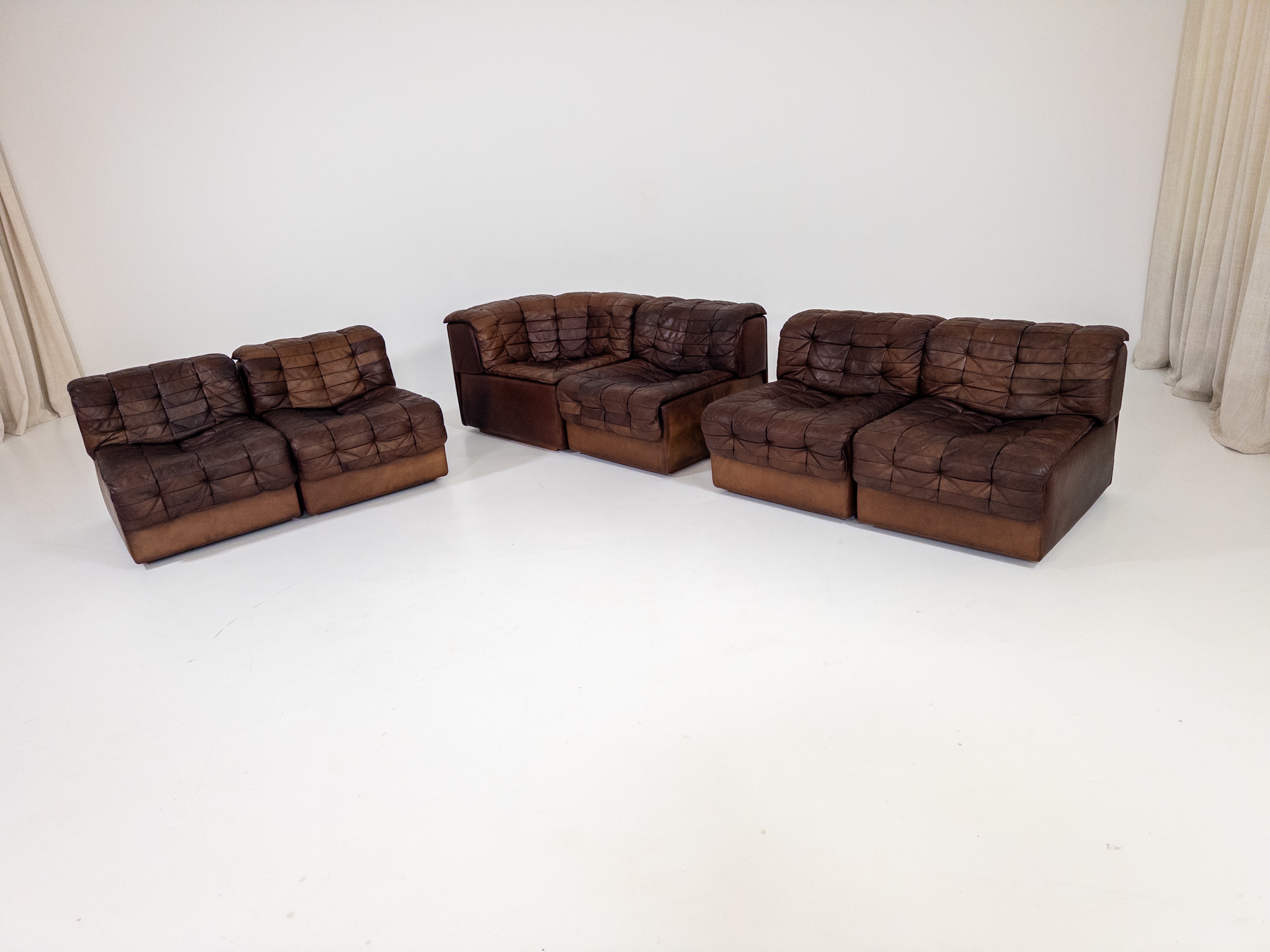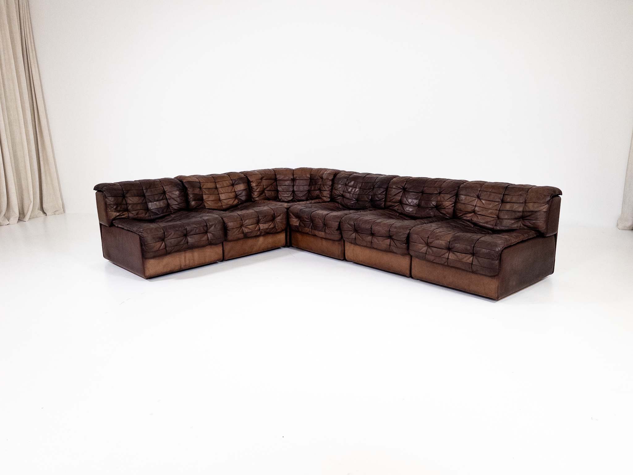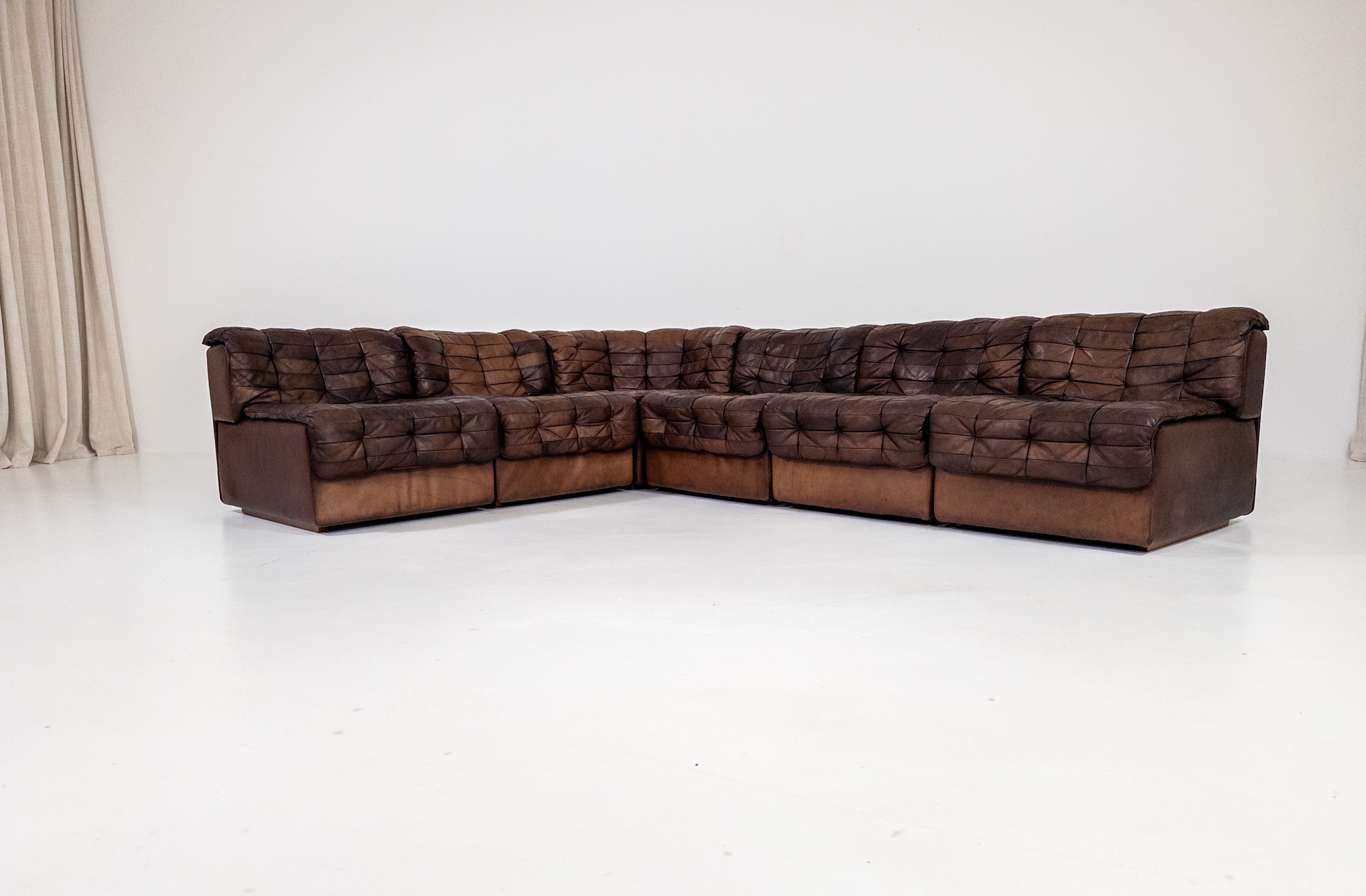 Exklusiv schweizisk modulsoffa från De Sede, tillverkad 1974, i vackert patchworkläder med fantastisk karaktär och djup patina. En riktig designklassiker med det där tunga, generösa uttrycket som De Sede är så omtyckt för.