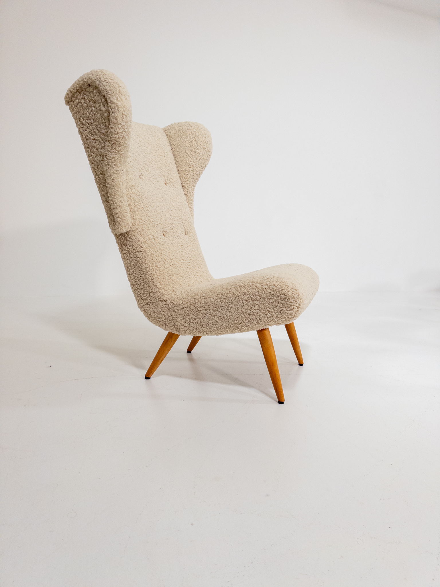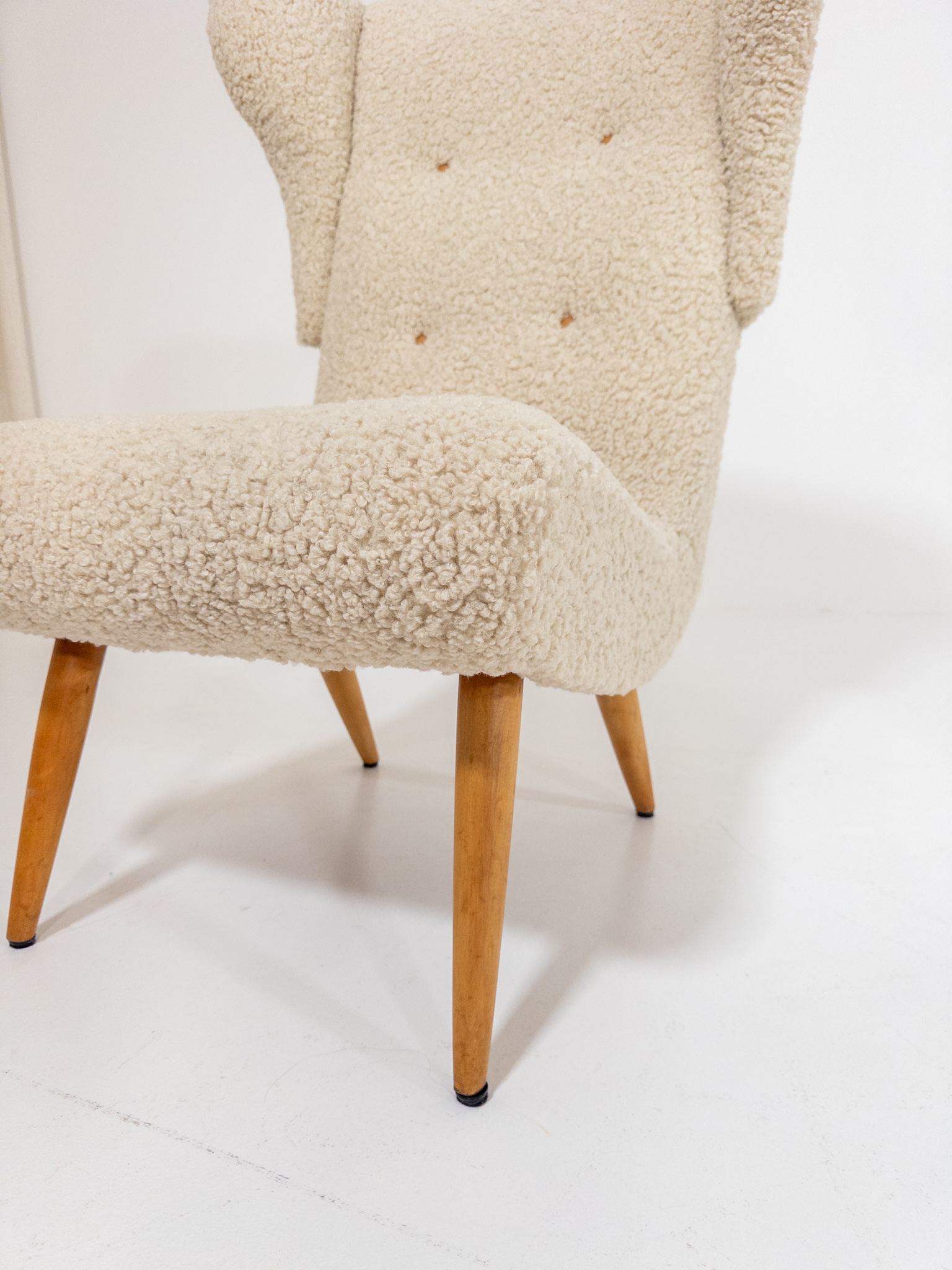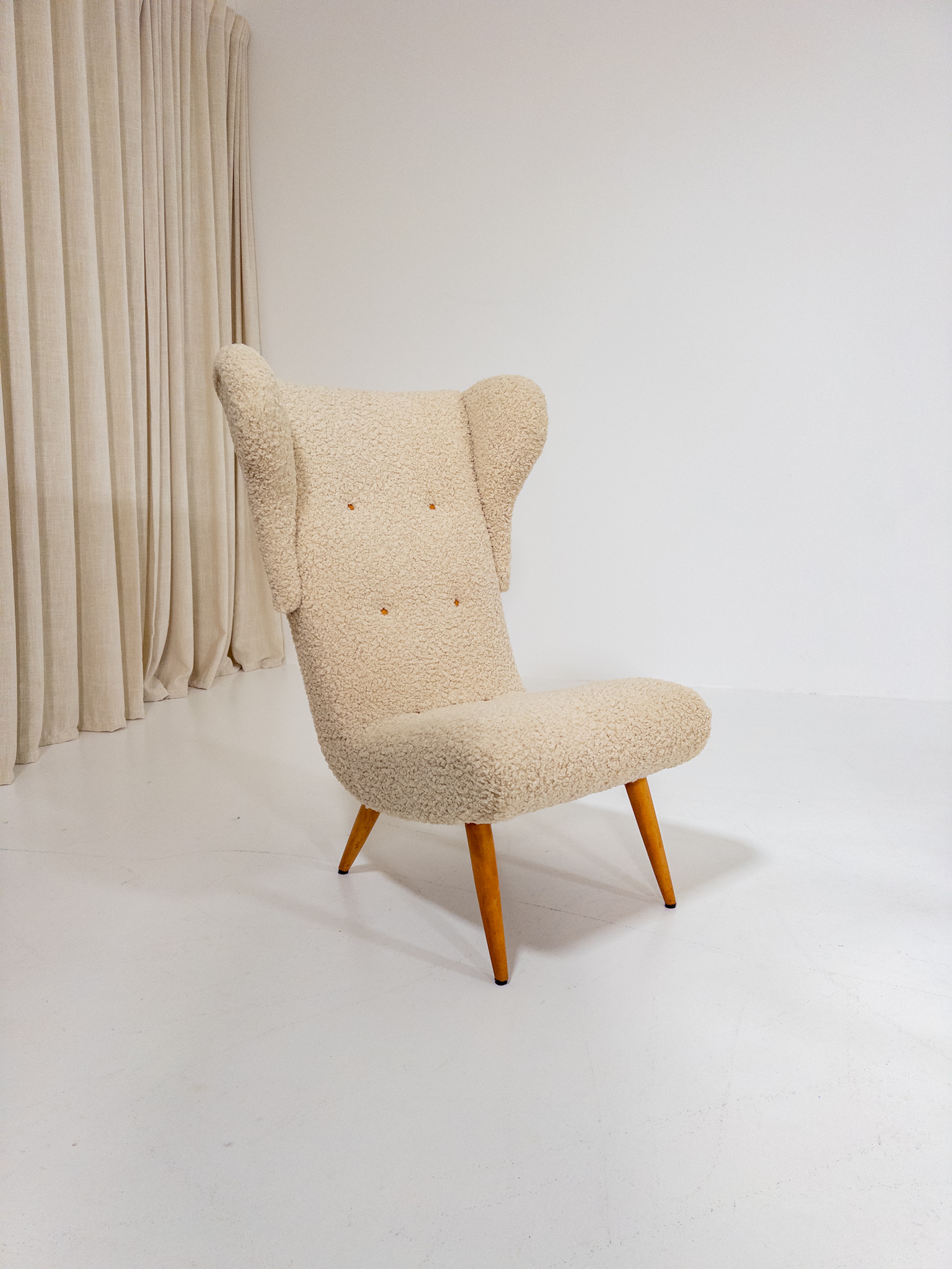 Nyomklädd i ett exklusivt, tjockare bouclétyg som påminner om fårskinn och ger en varm, mjuk och inbjudande känsla.