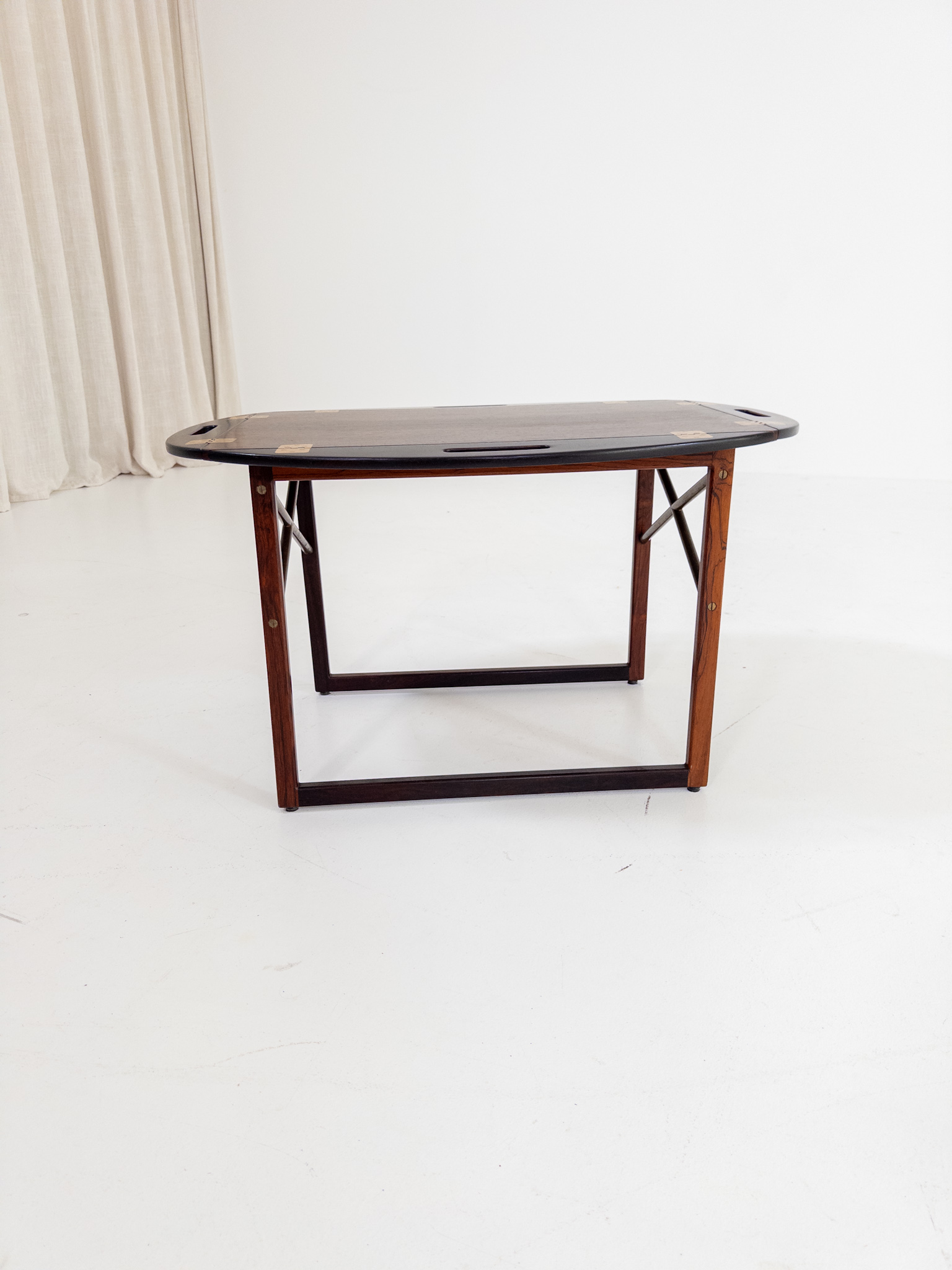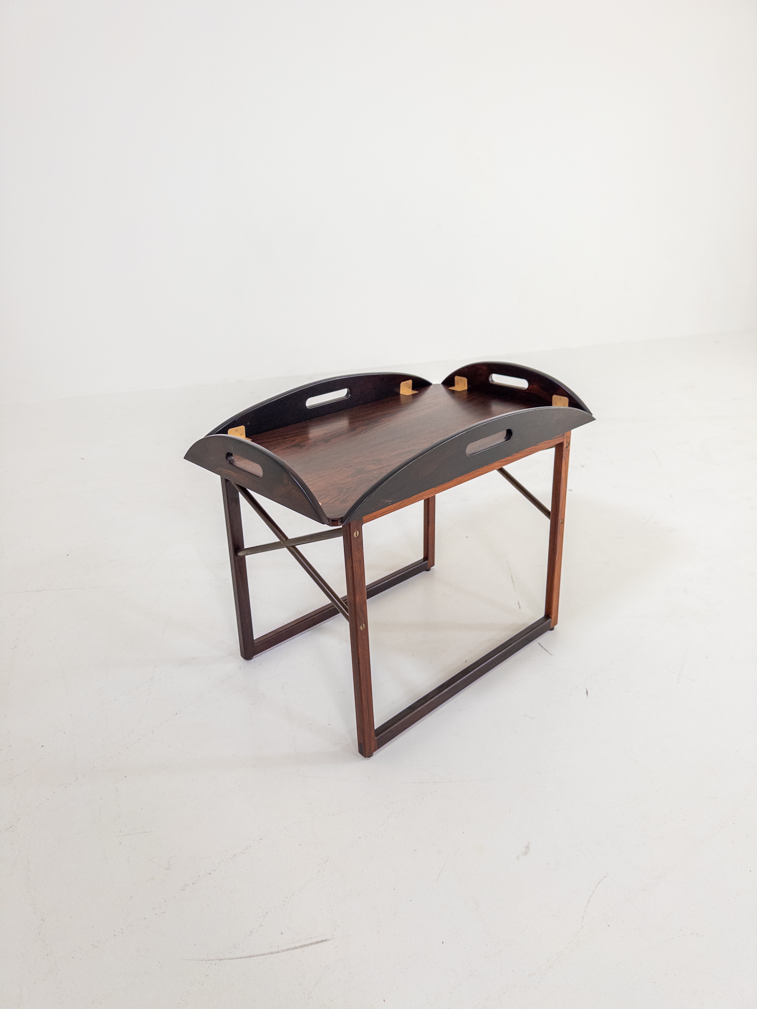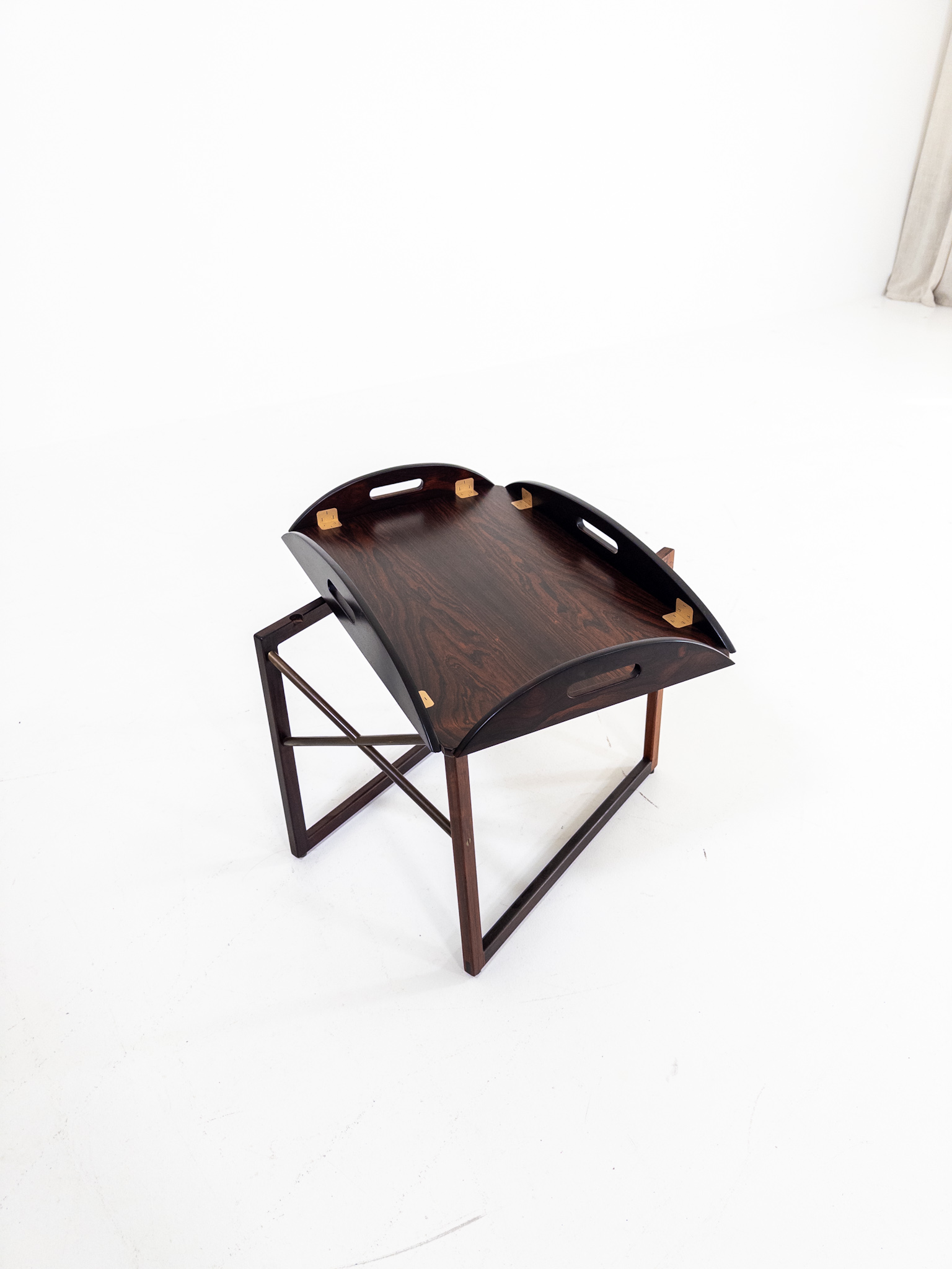 Vackert butlers brickbord formgivet av Svend Langkilde, tillverkat i Danmark under 1960-talet i exklusiv jakaranda / Santos Rosewood med fina mässingsbeslag. Ett både praktiskt och dekorativt bord med tidlös form och vacker ådring.