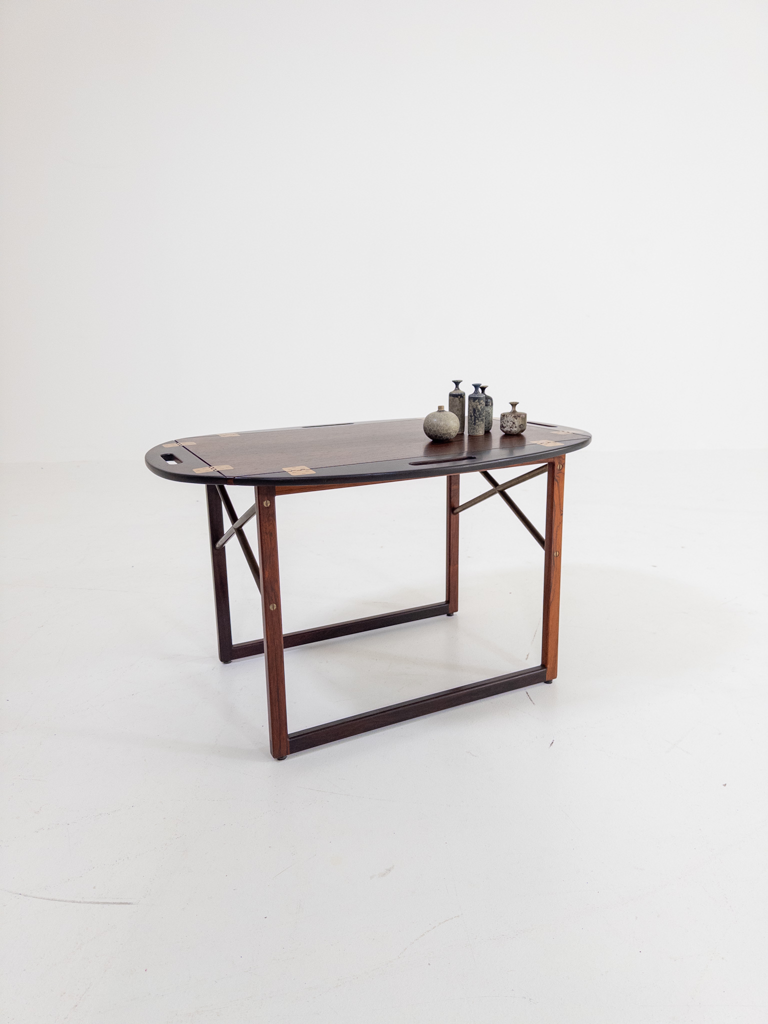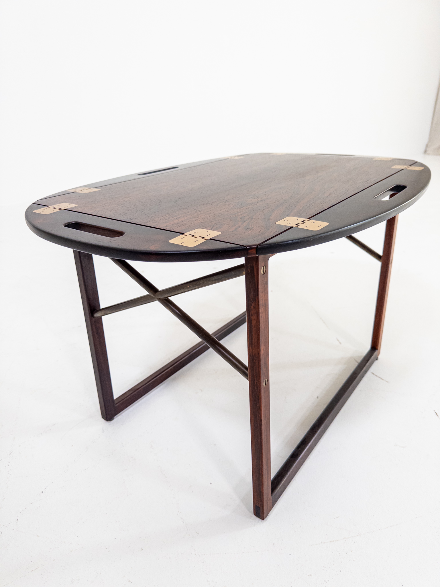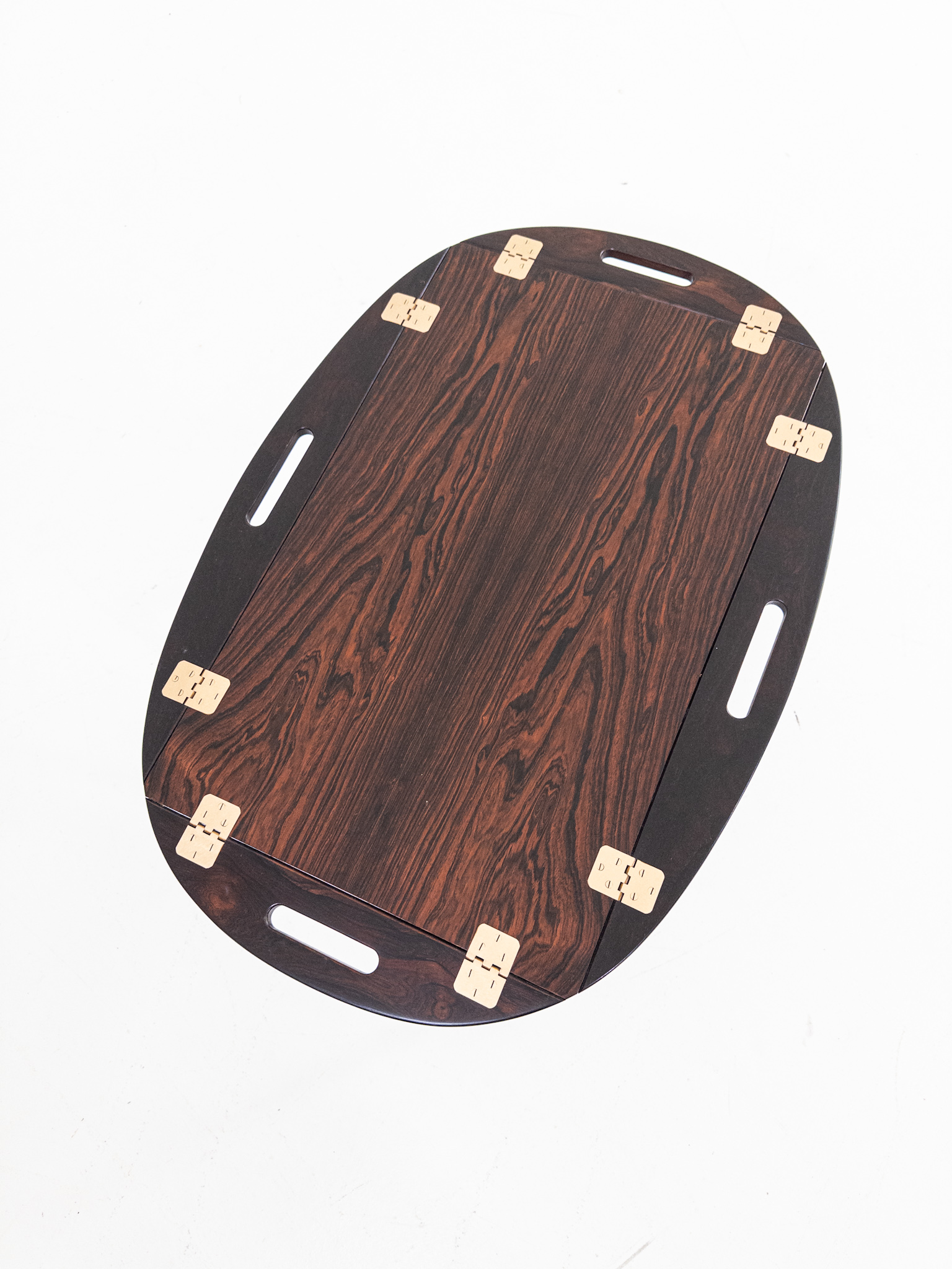 Vackert butlers brickbord formgivet av Svend Langkilde, tillverkat i Danmark under 1960-talet i exklusiv jakaranda / Santos Rosewood med fina mässingsbeslag. Ett både praktiskt och dekorativt bord med tidlös form och vacker ådring.