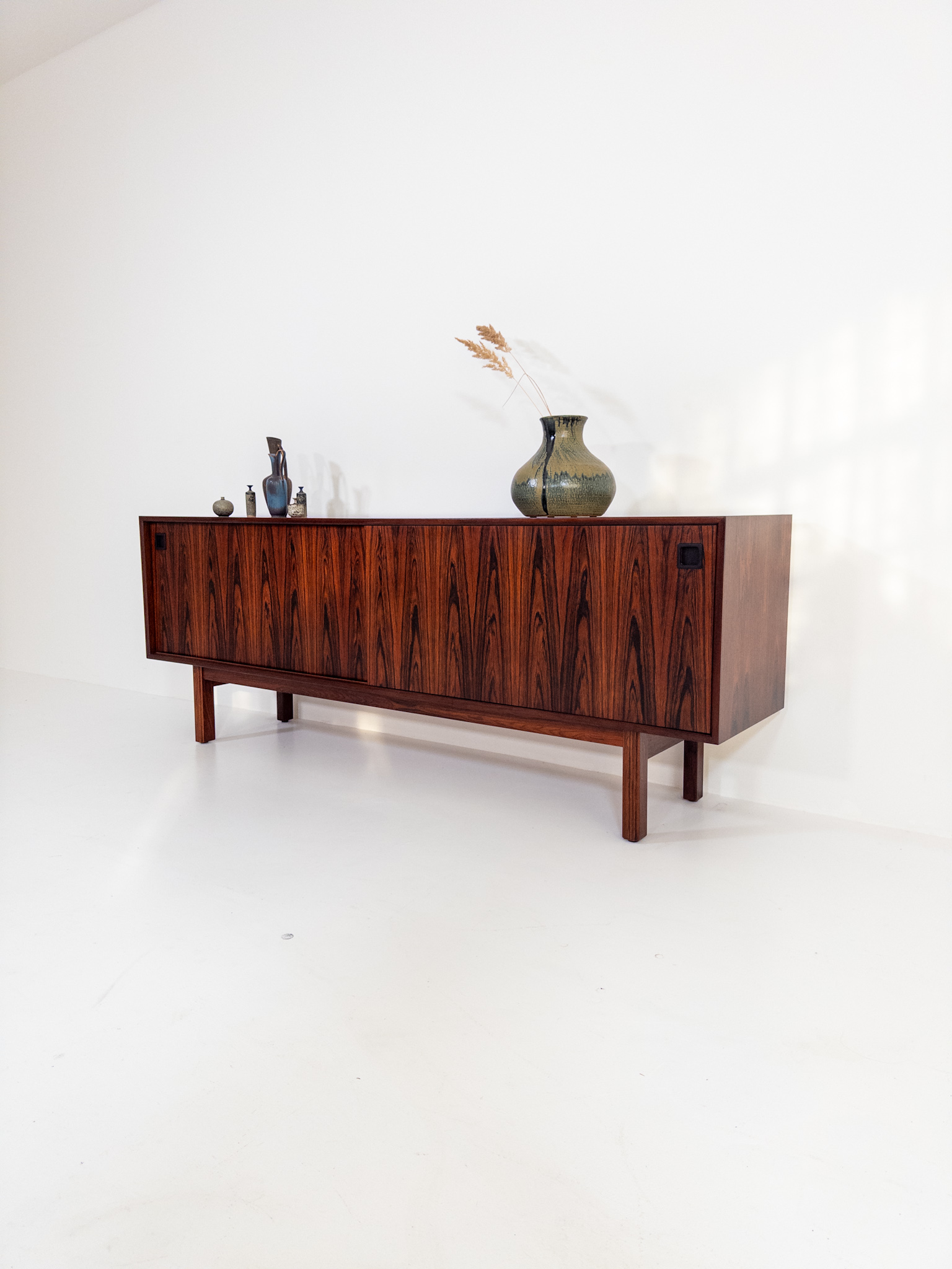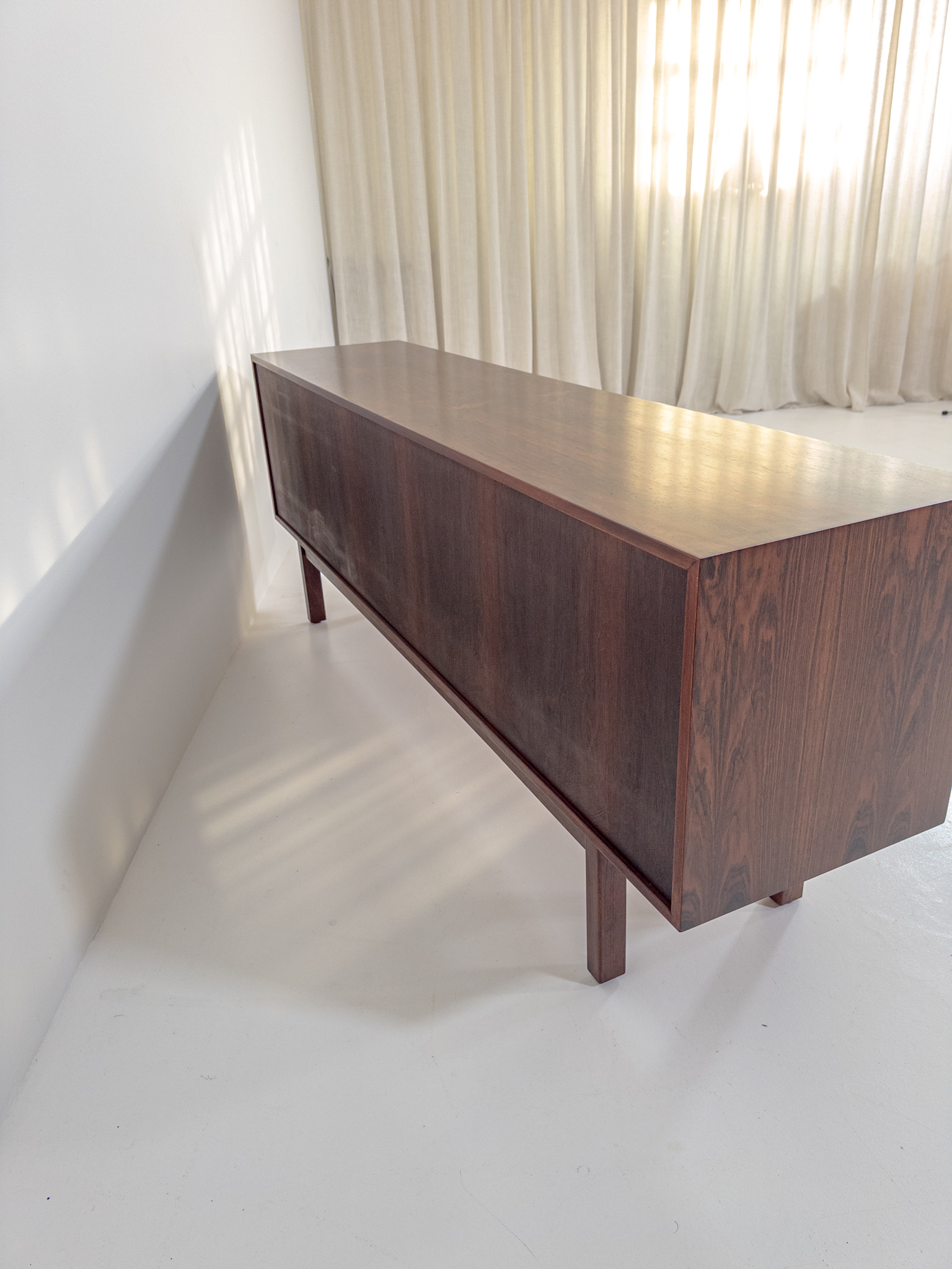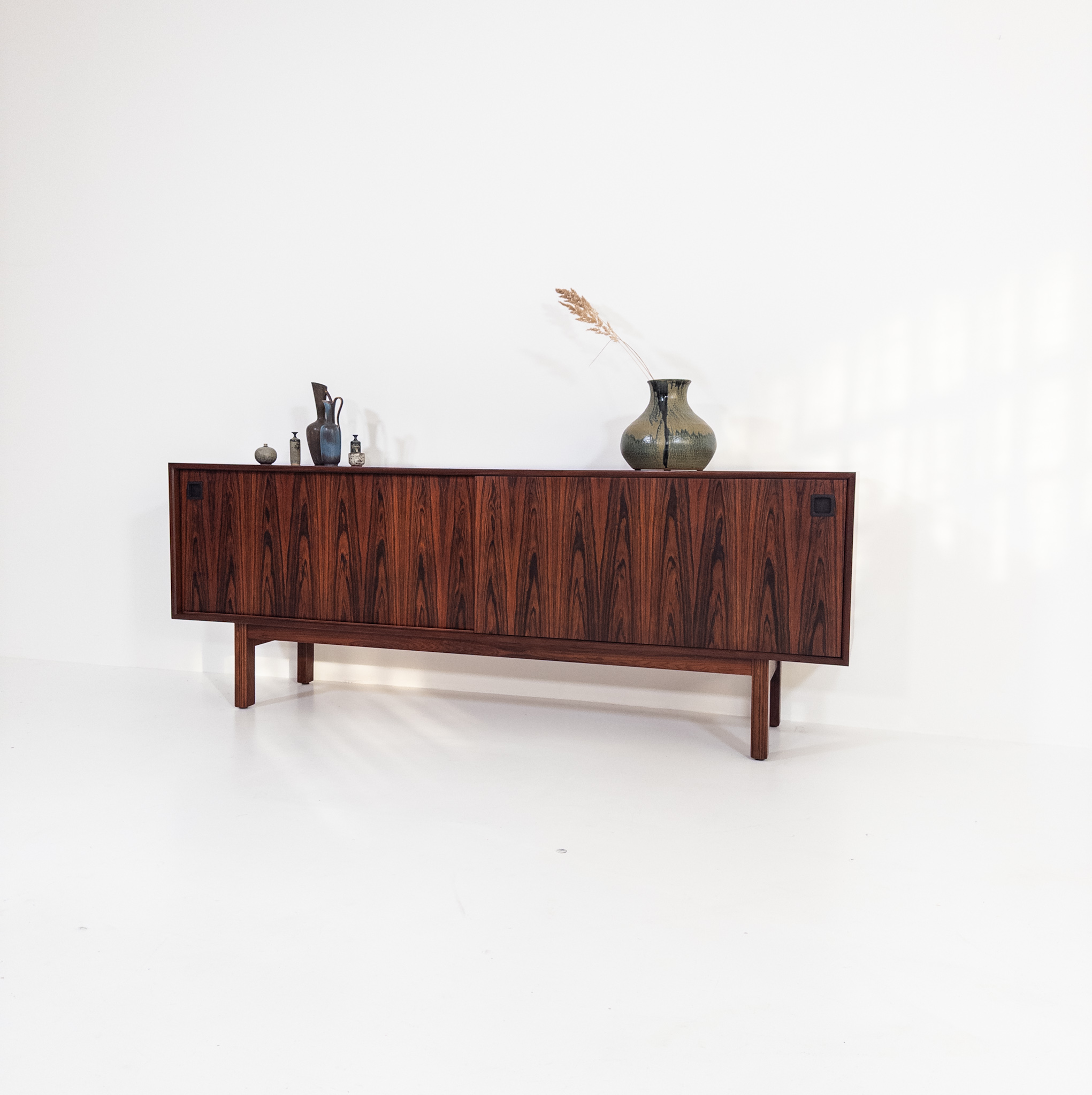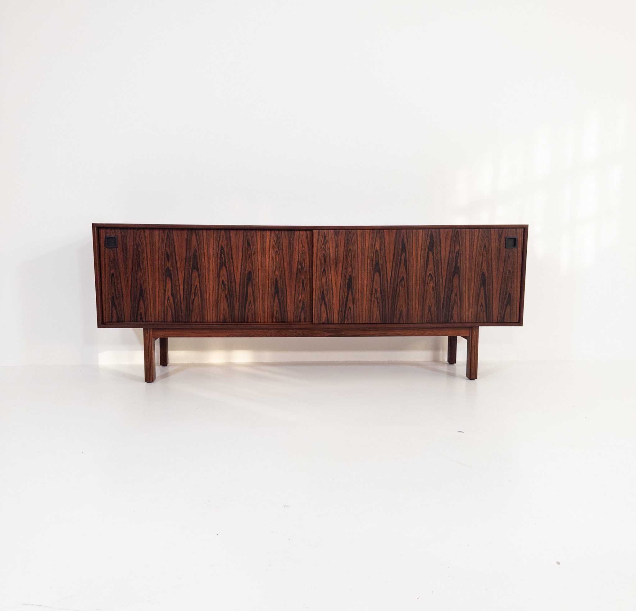 Ett stilrent och välbalanserat sideboard från Omann Jun Møbelfabrik, tillverkat i vackert ådrad jakaranda (Dalbergia Latifolia / Santos Rosewood). Den djupa tonen och det livfulla ådringsspelet ger möbeln en exklusiv och varm karaktär.
