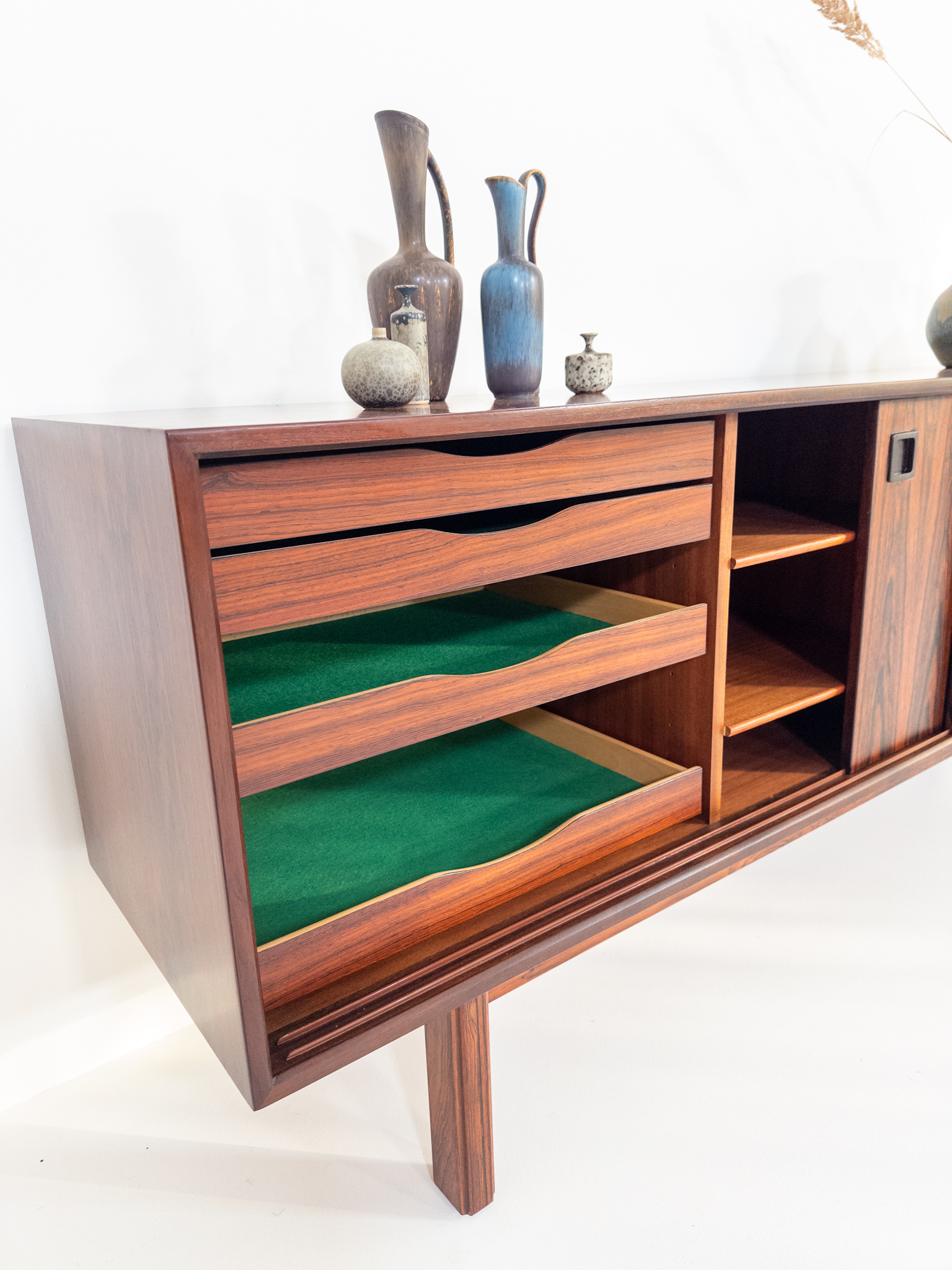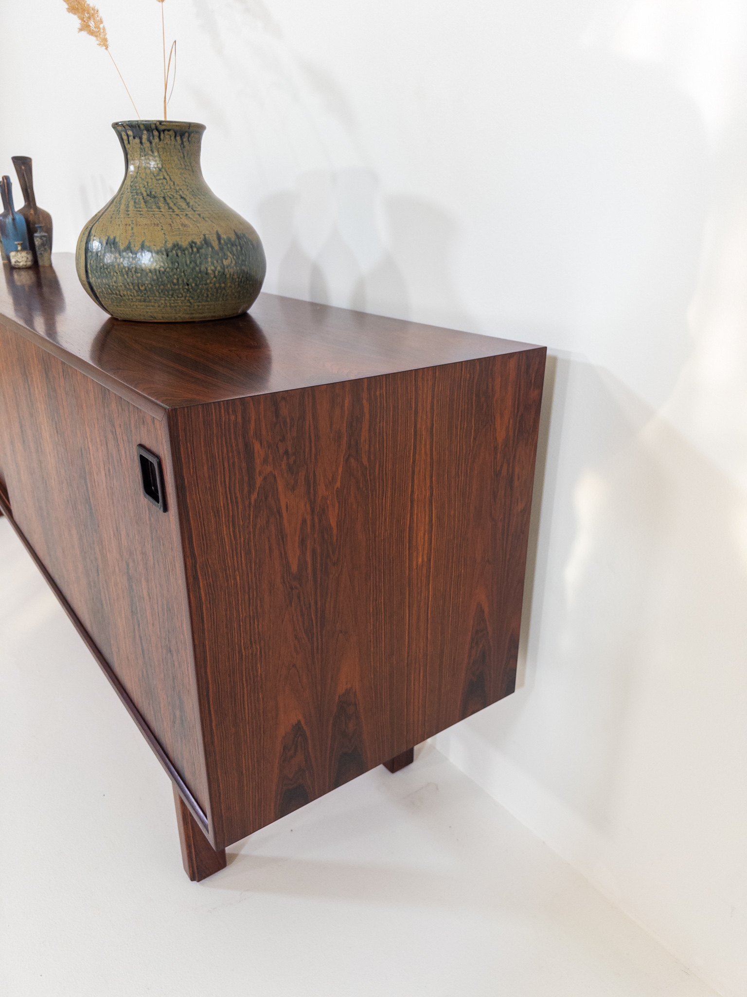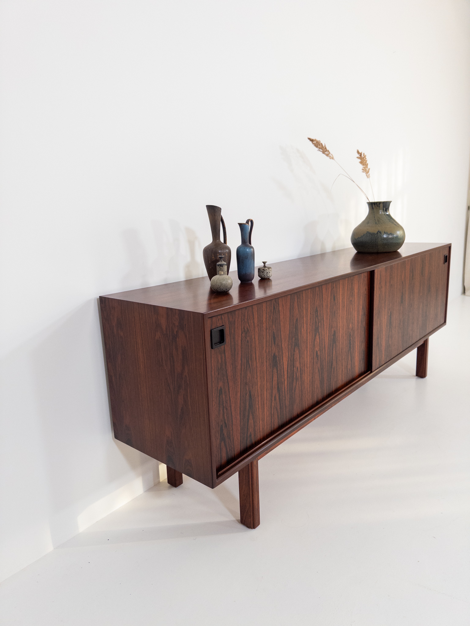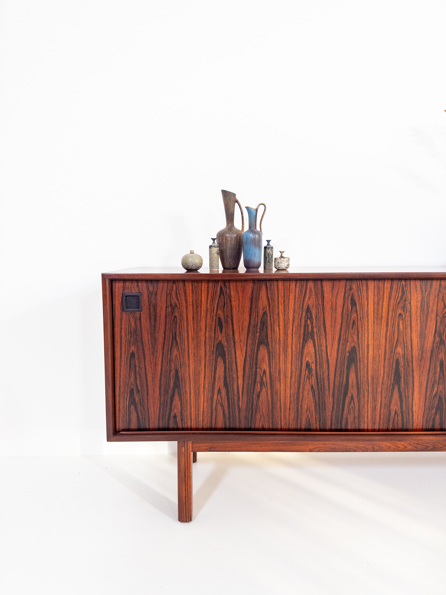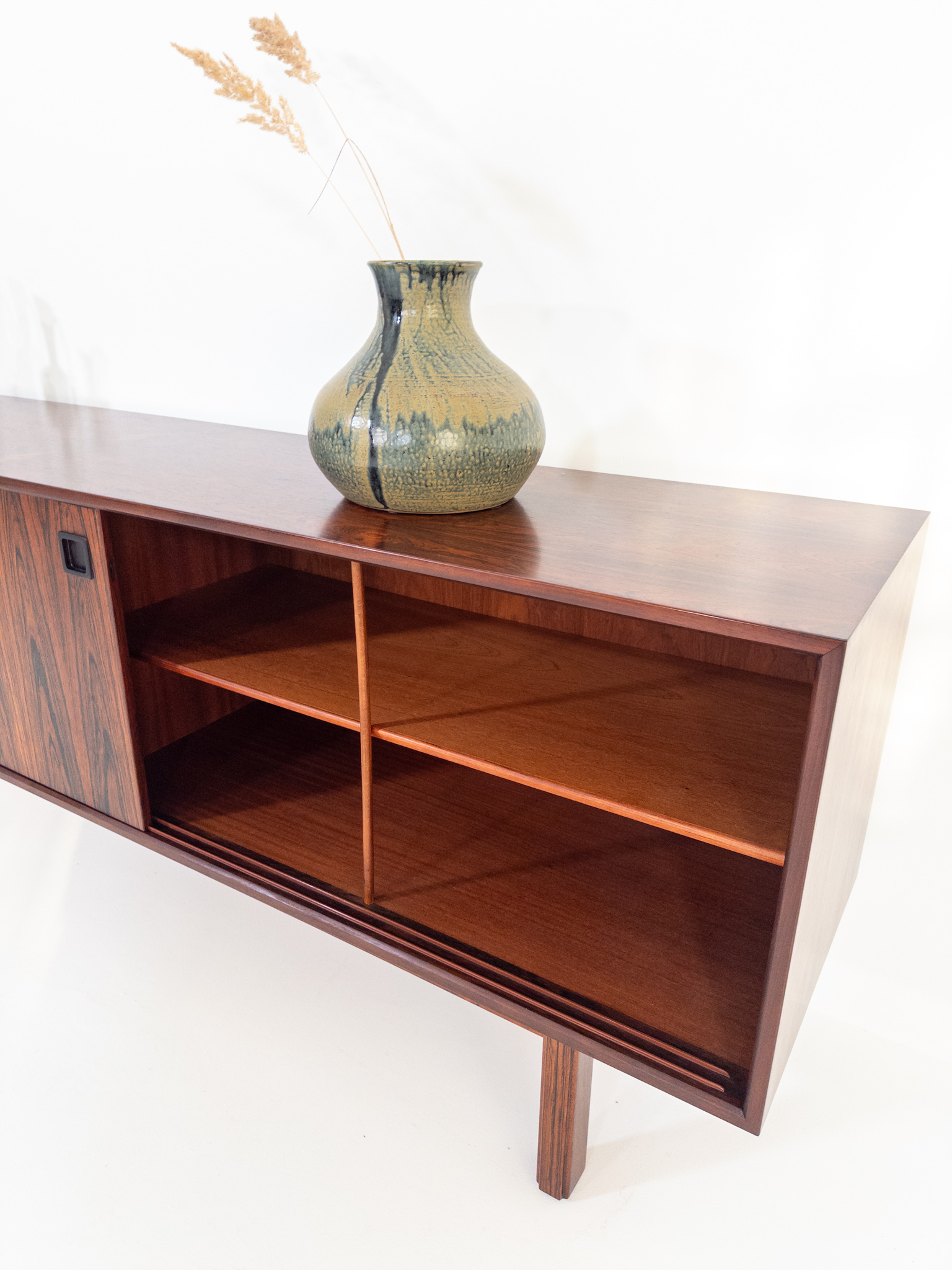 De rena linjerna och de smäckra benen är typiska för dansk design från 60-talet, medan skjutluckorna ger både funktion och ett harmoniskt uttryck.