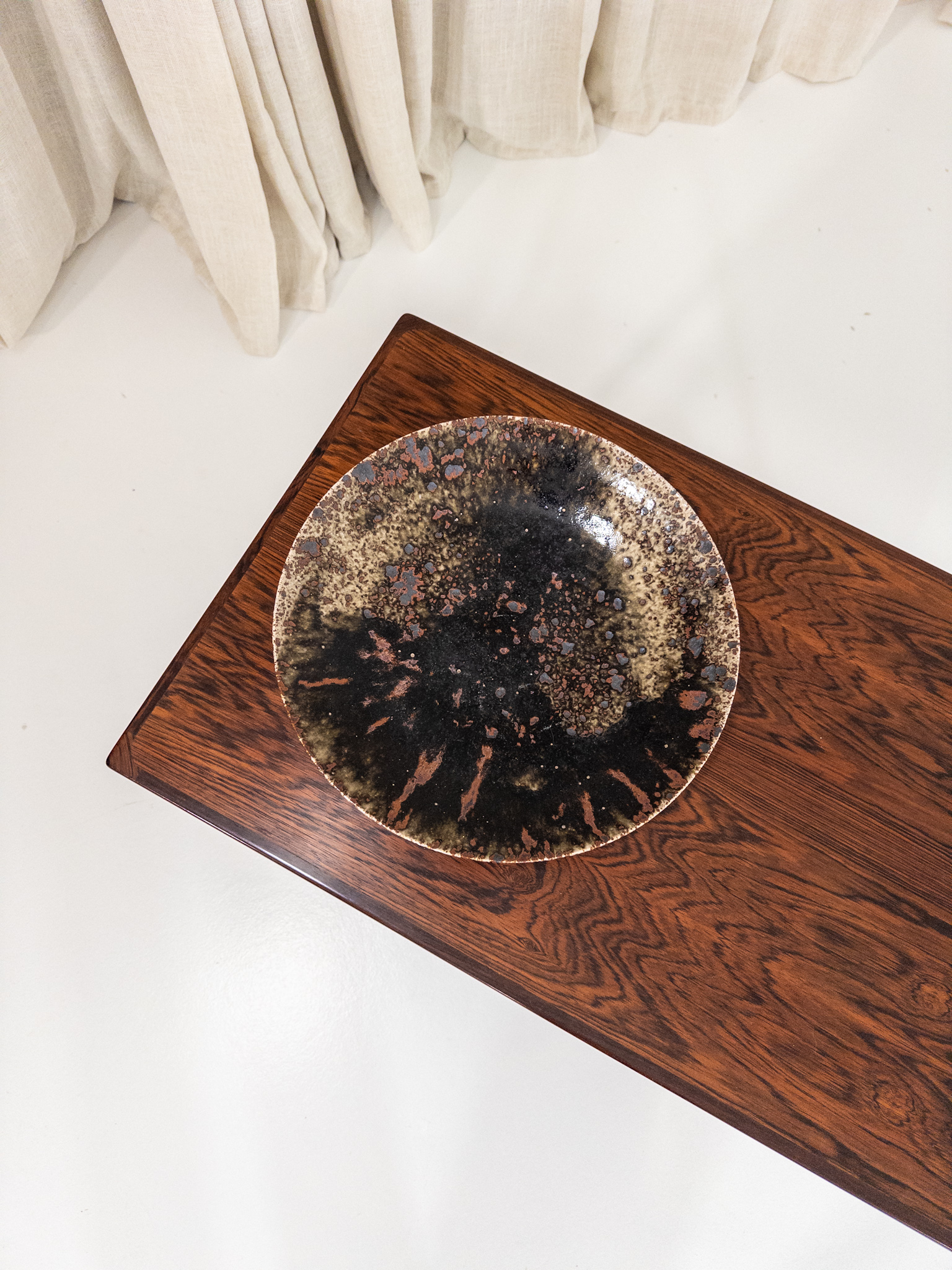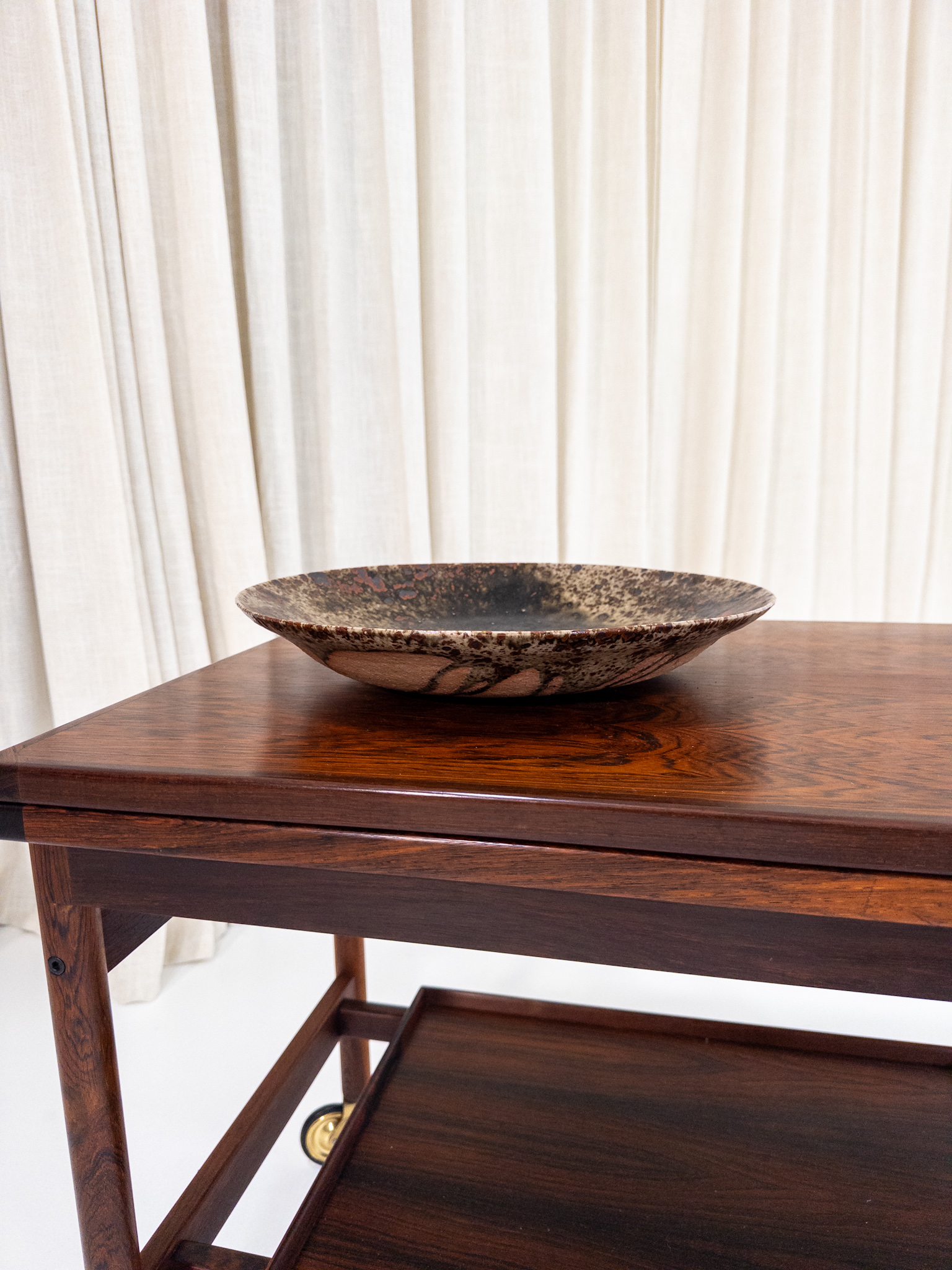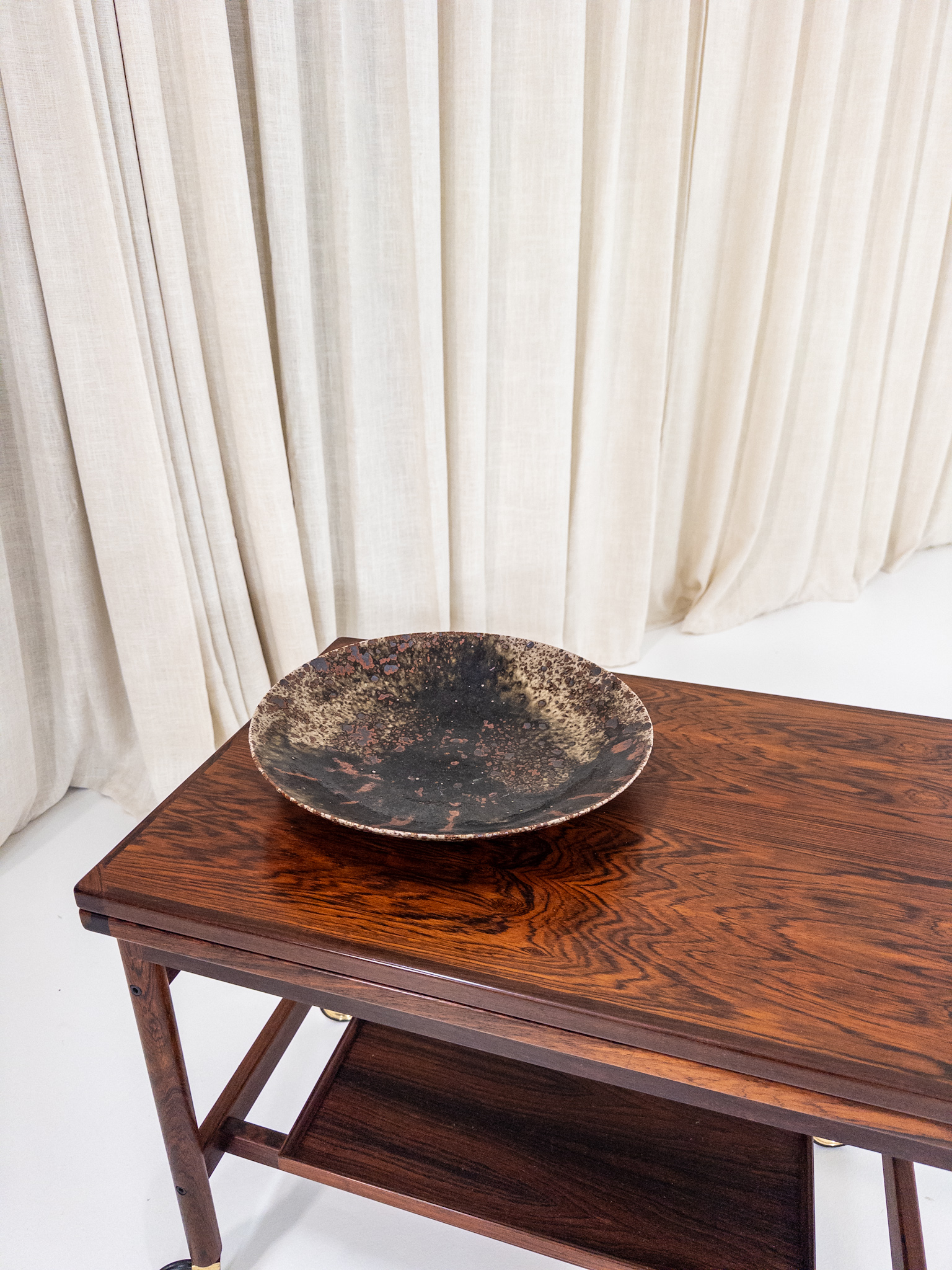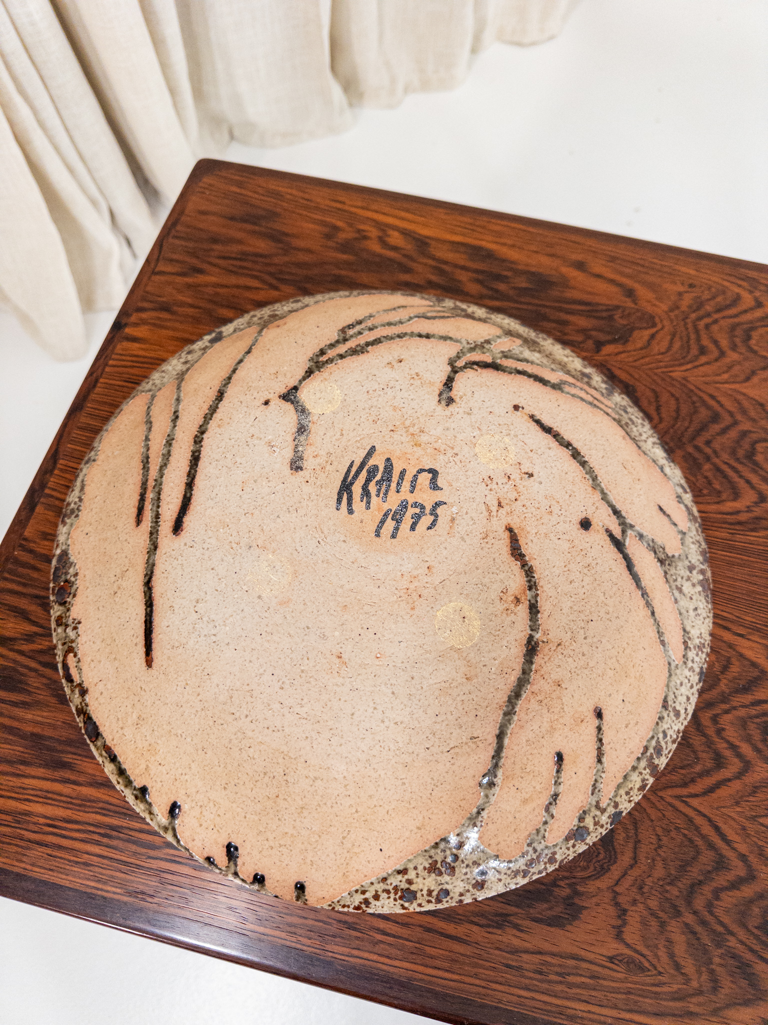 Vacker handdrejad stengodsskål av det välkända keramikerparet Ulla & Gustav Kraitz. Ett dekorativt fat med deras karakteristiska expressiva glasyr – levande struktur, djup svärta och organiska nyanser i brunt, ockra och svart.