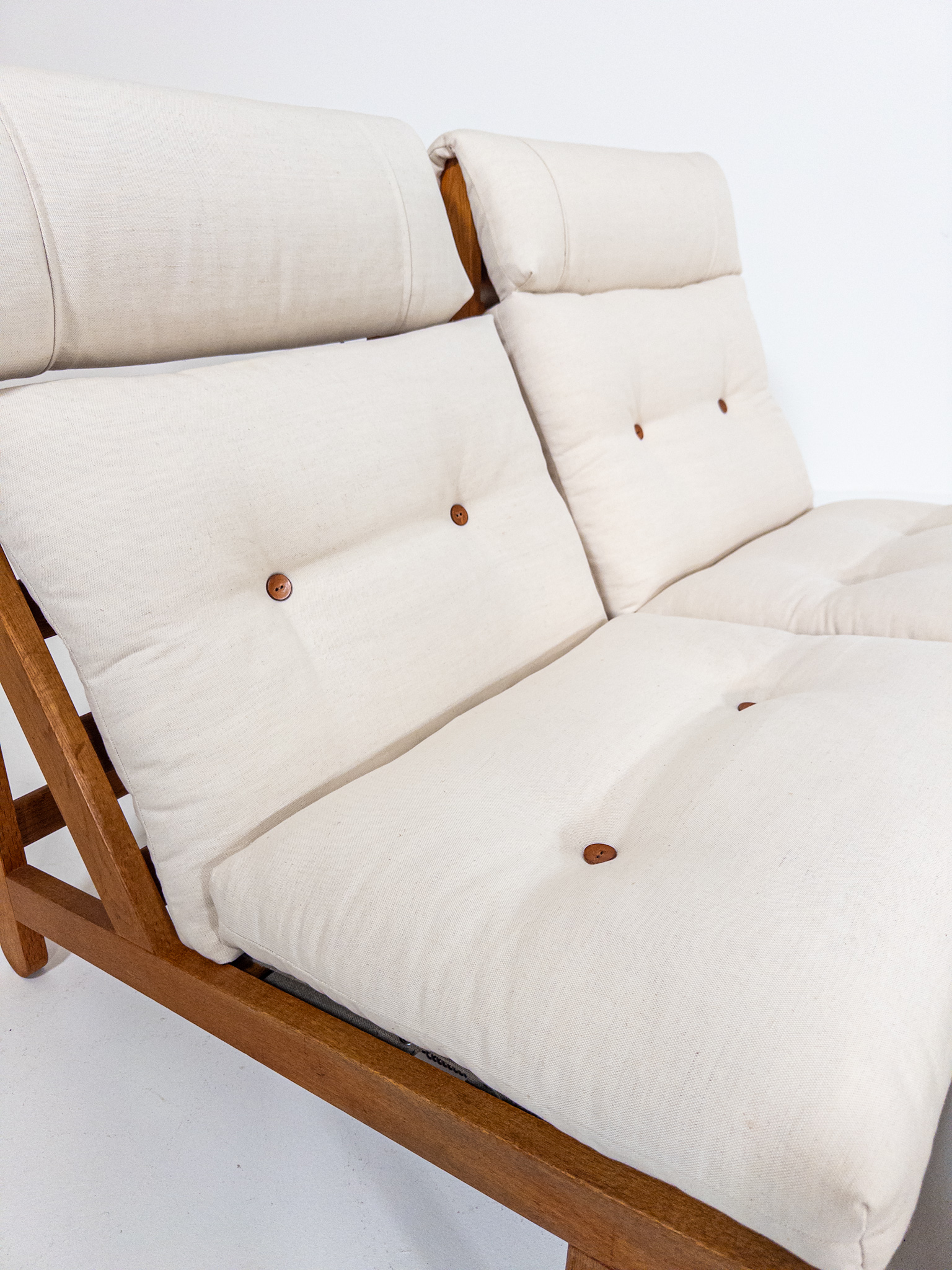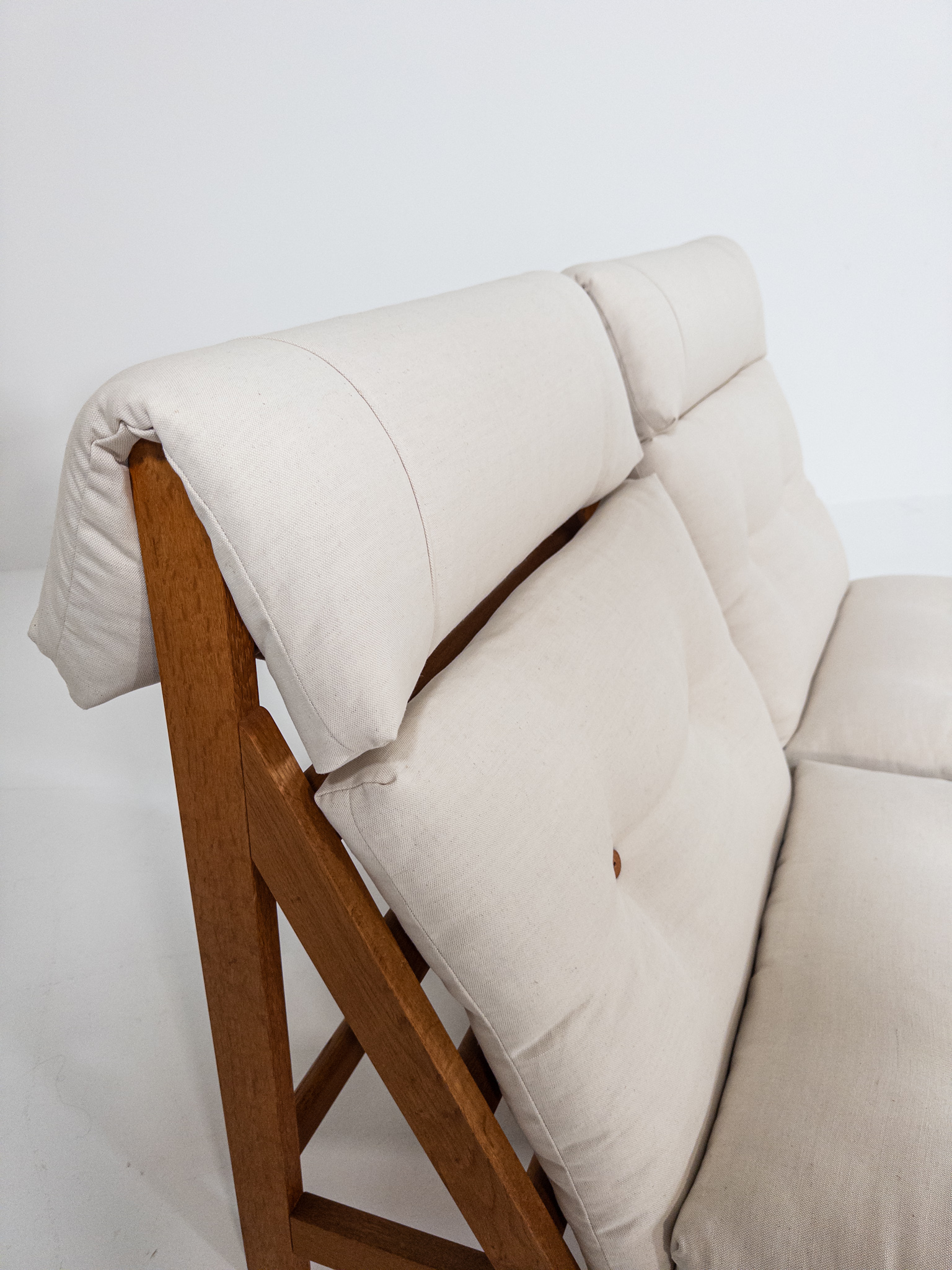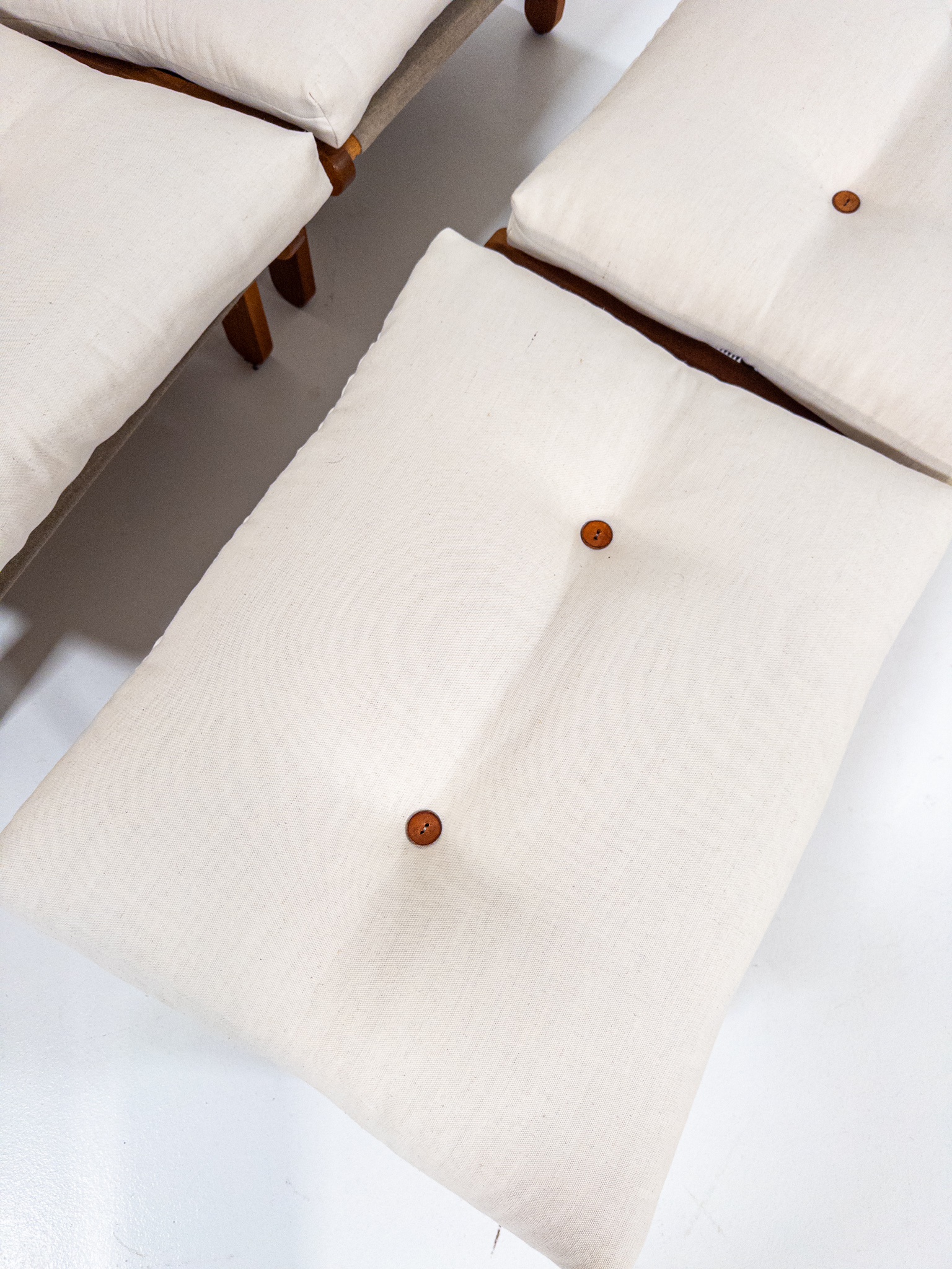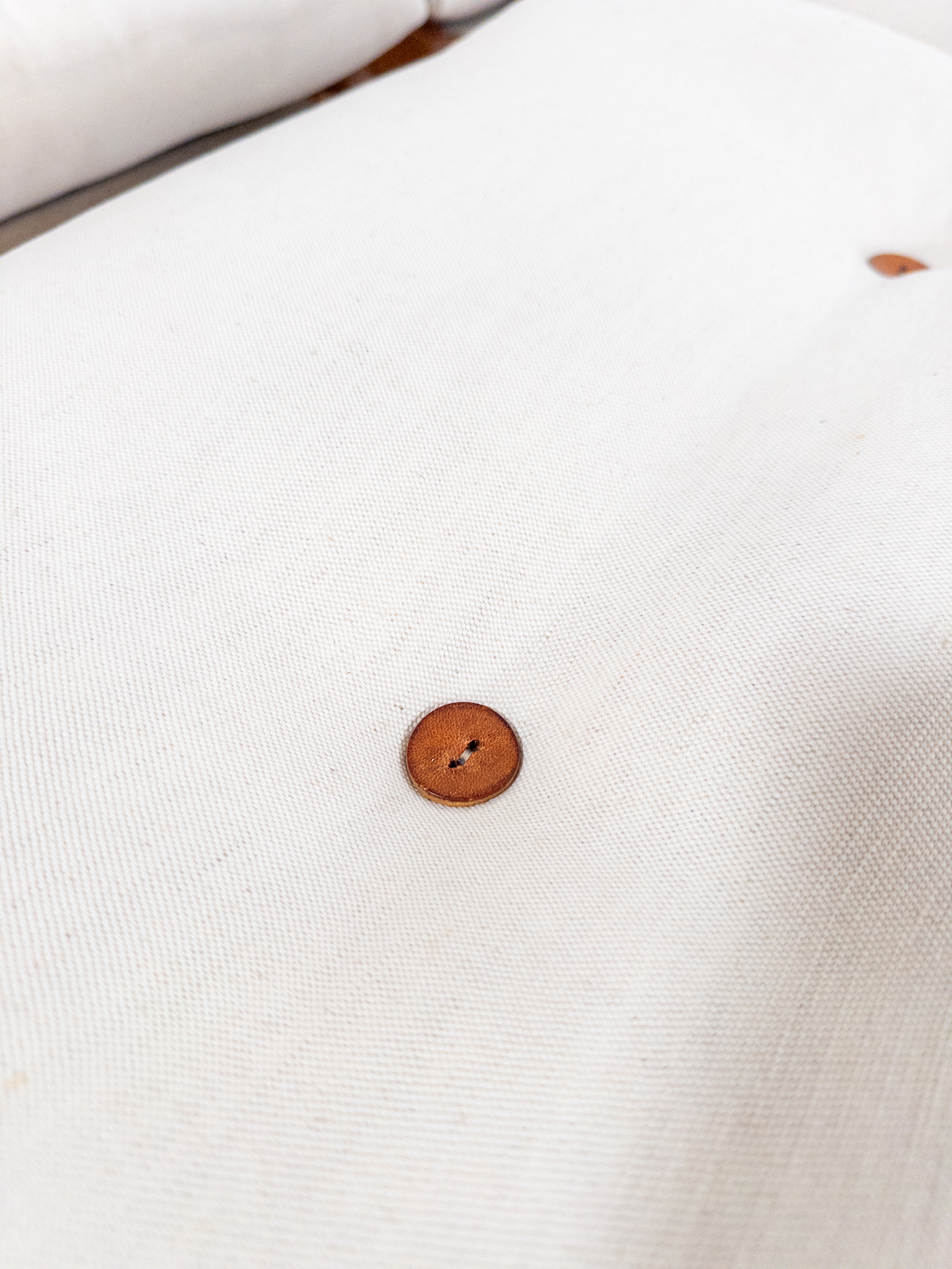 Nyomklädda i ett vackert vitt tyg med knappar i cognacsfärgat läder – en kombination som lyfter träets ton och ger ett mjukt men exklusivt helhetsintryck.