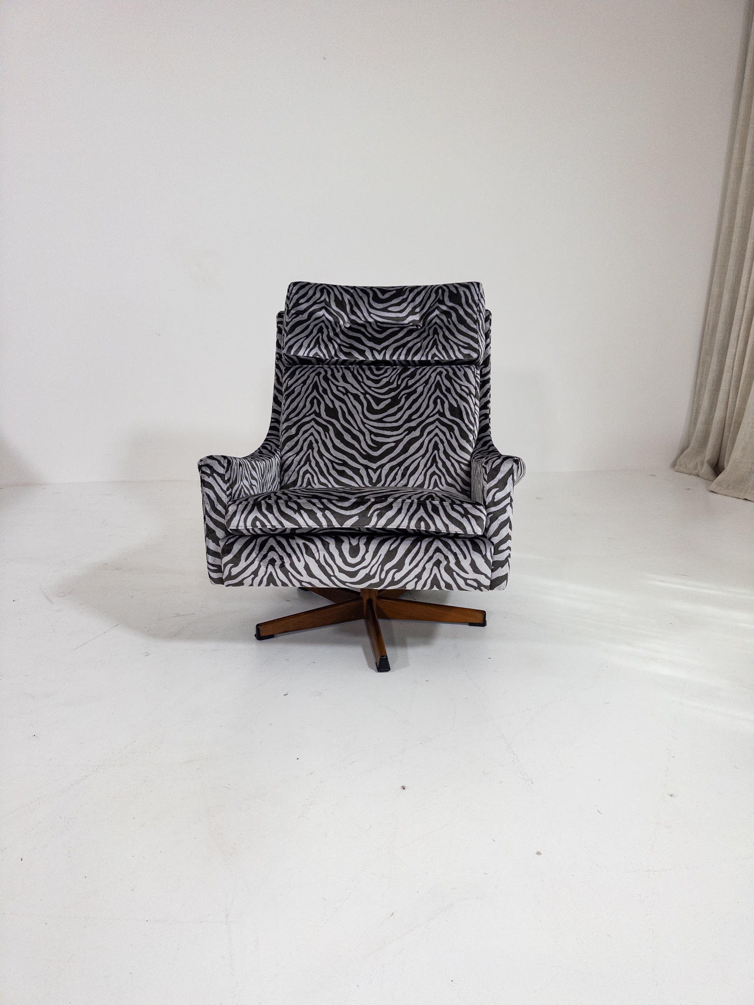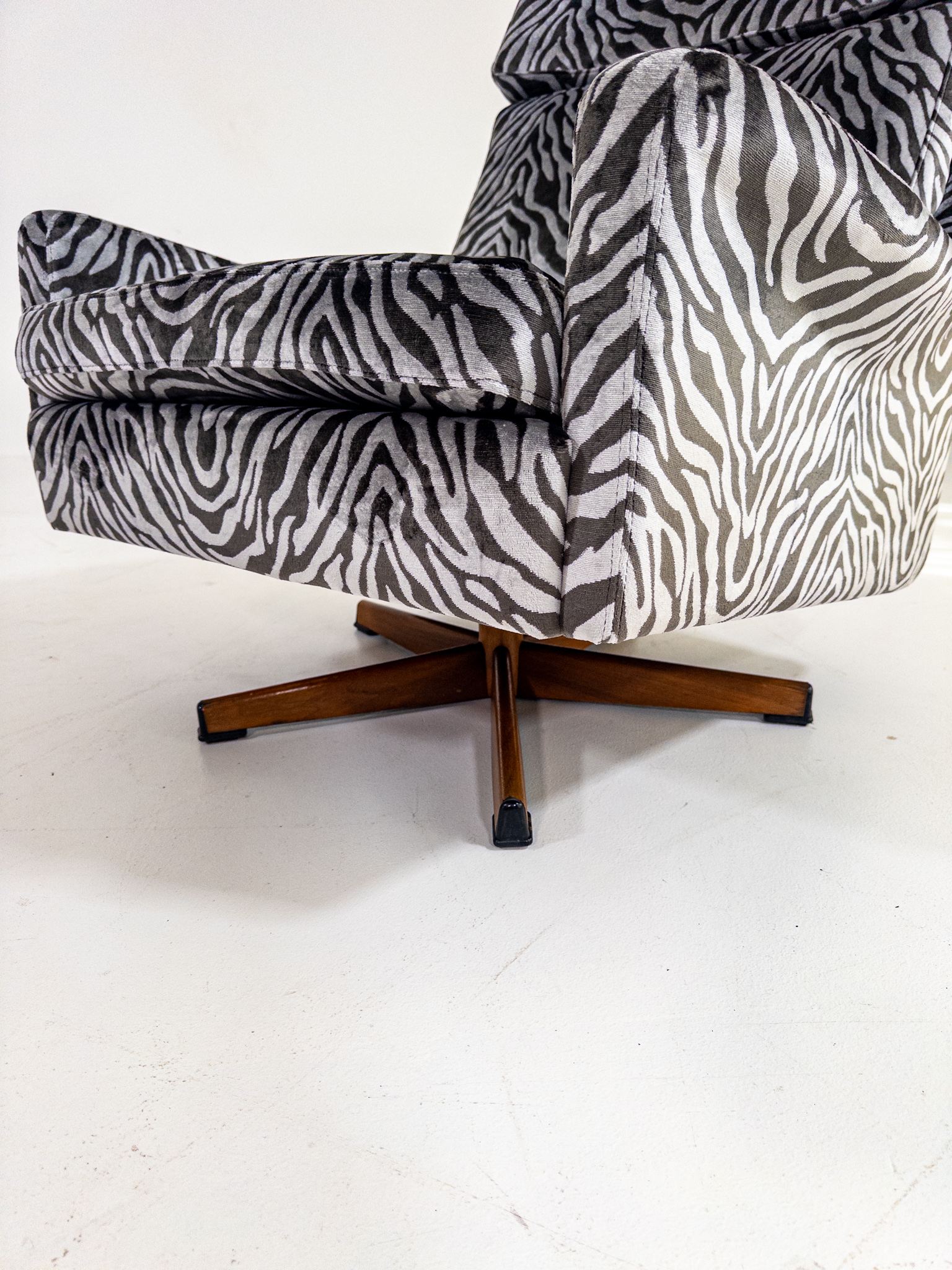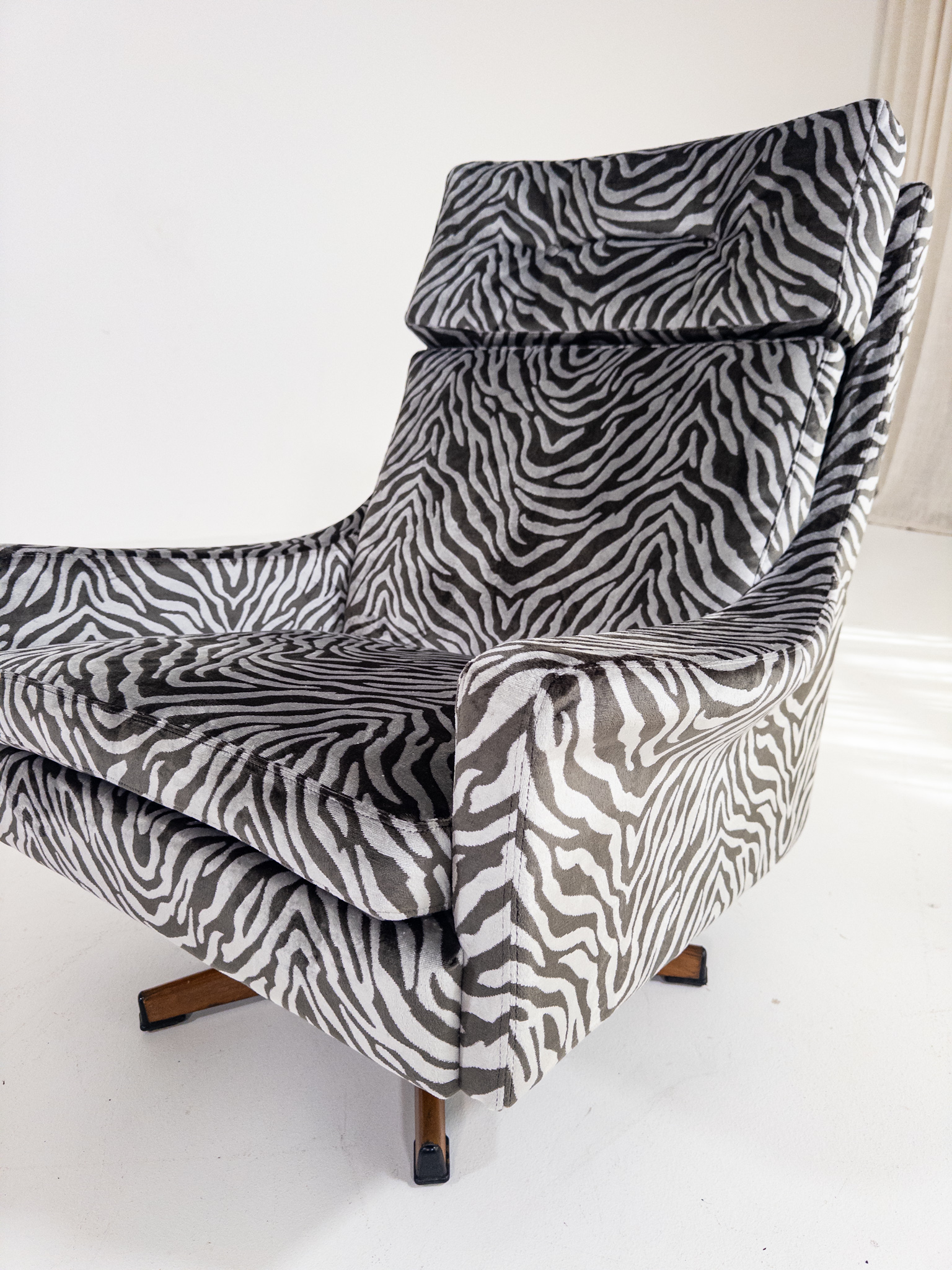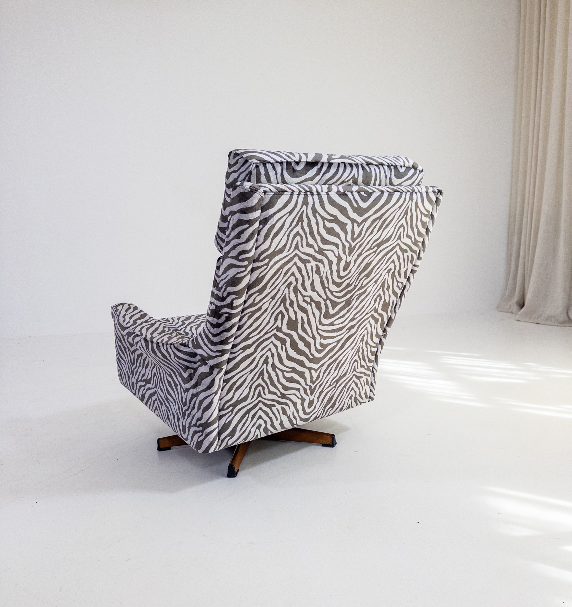 Nyomklädd i exklusivt zebratyg från finska Lauritzon, vilket ger fåtöljen ett modernt och uttrycksfullt lyft samtidigt som originaldesignen bevaras.