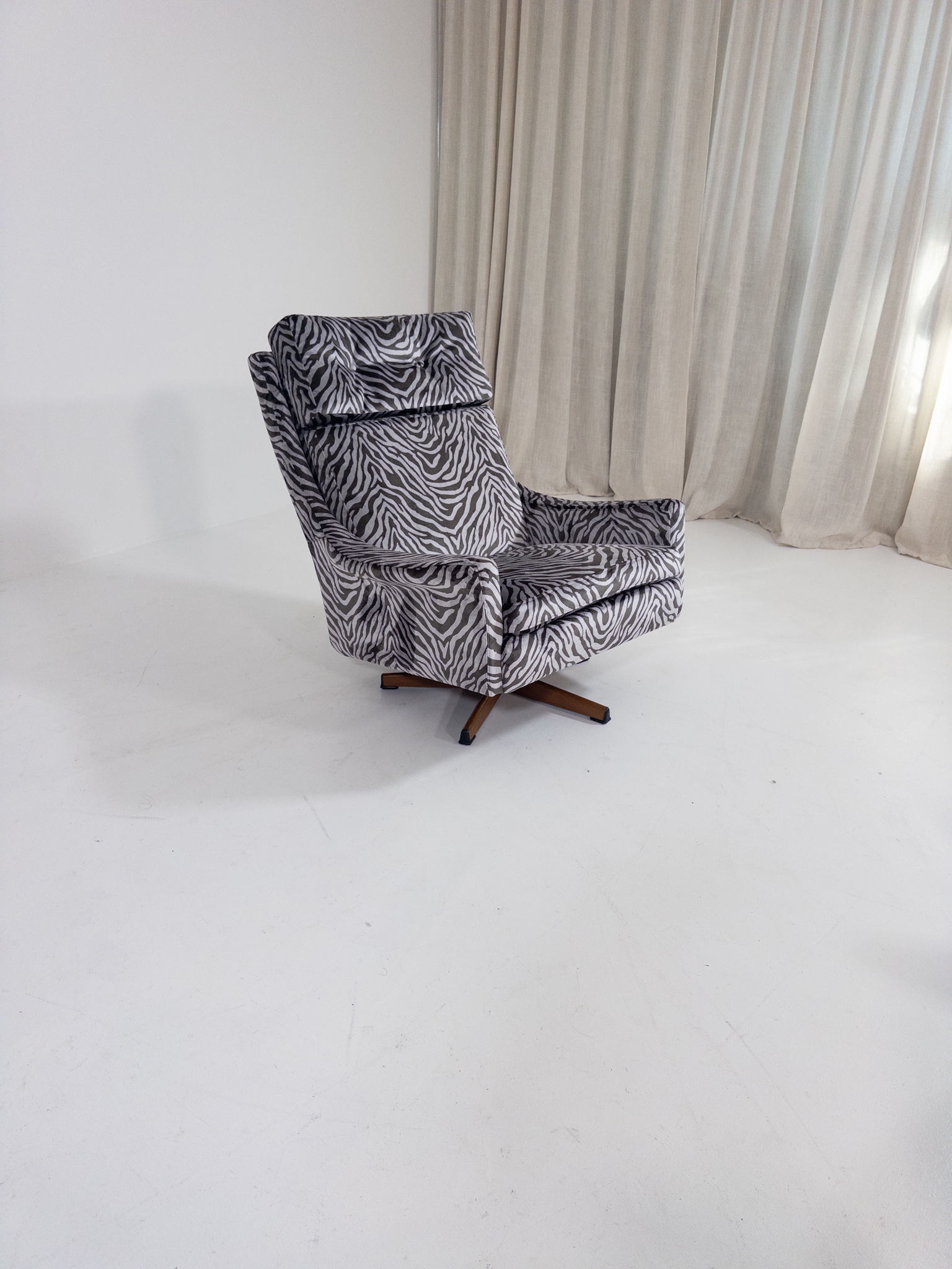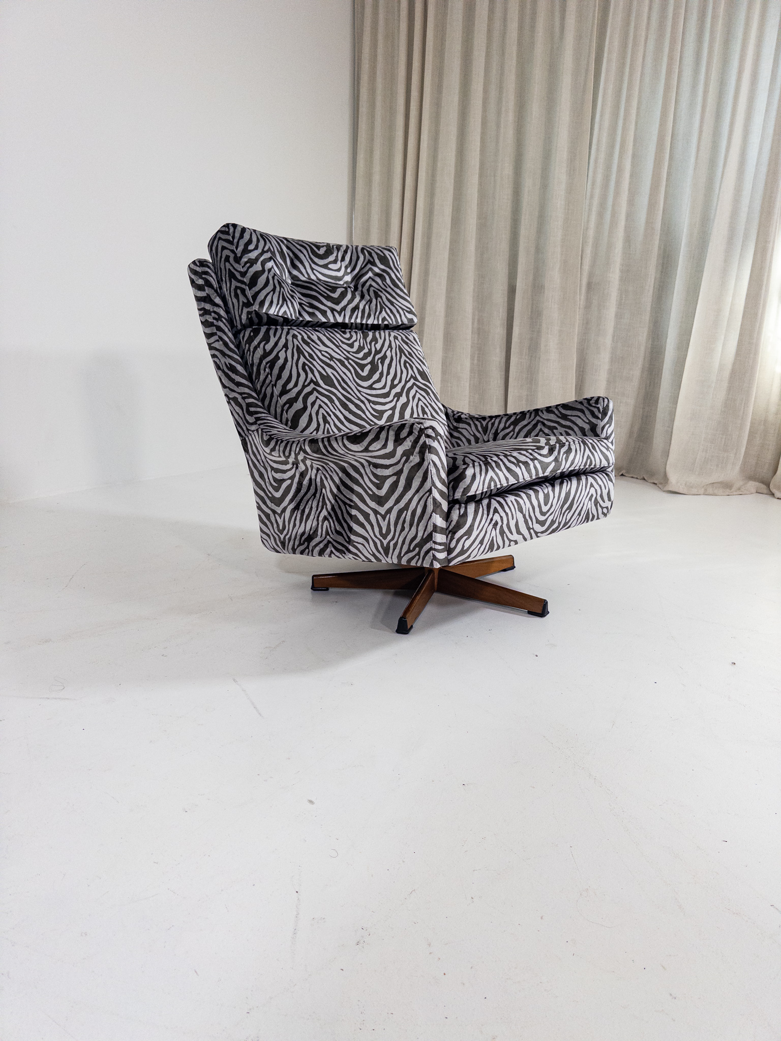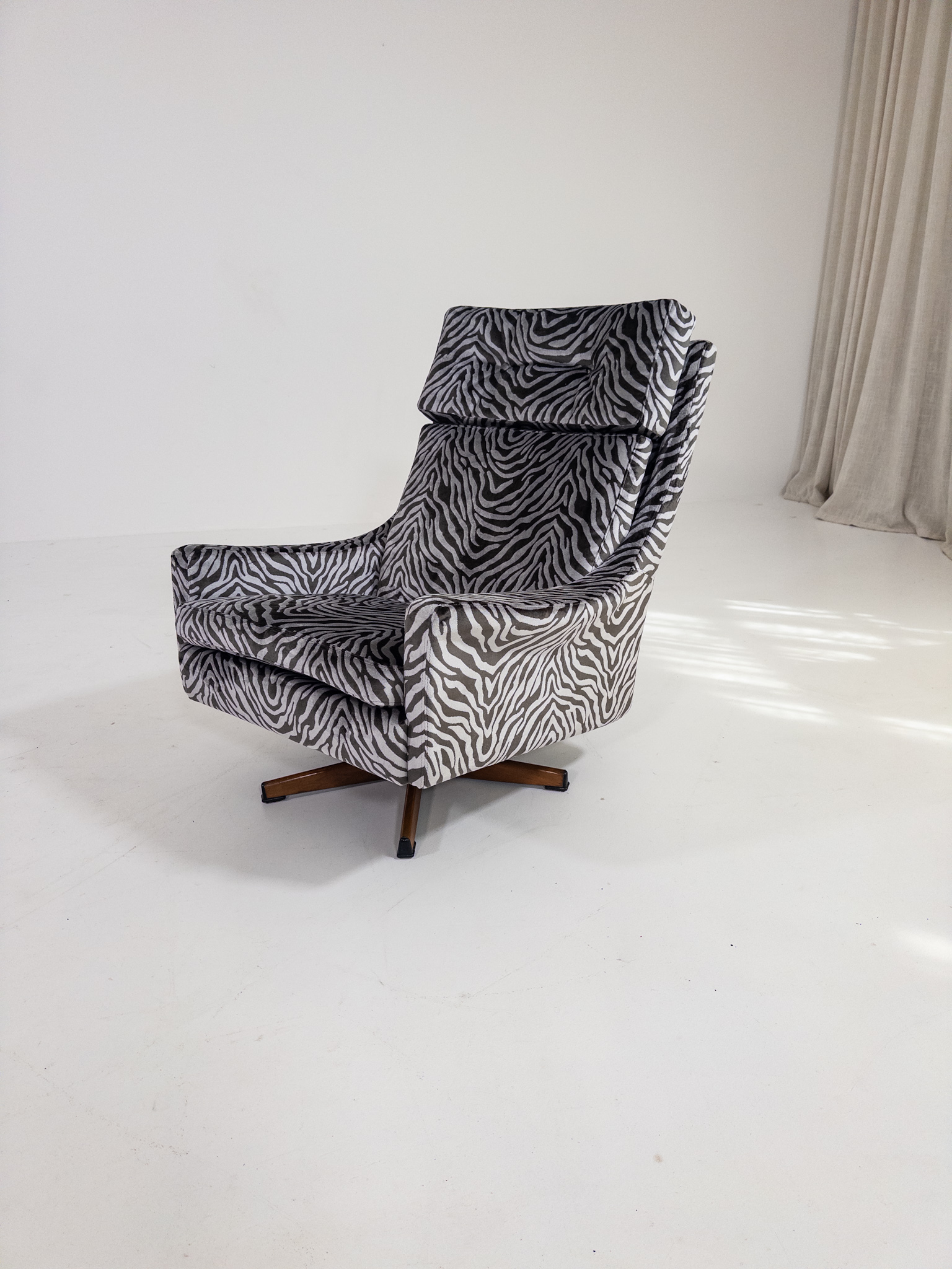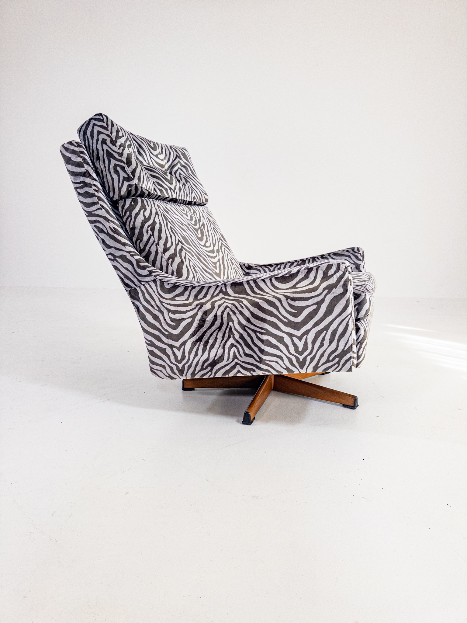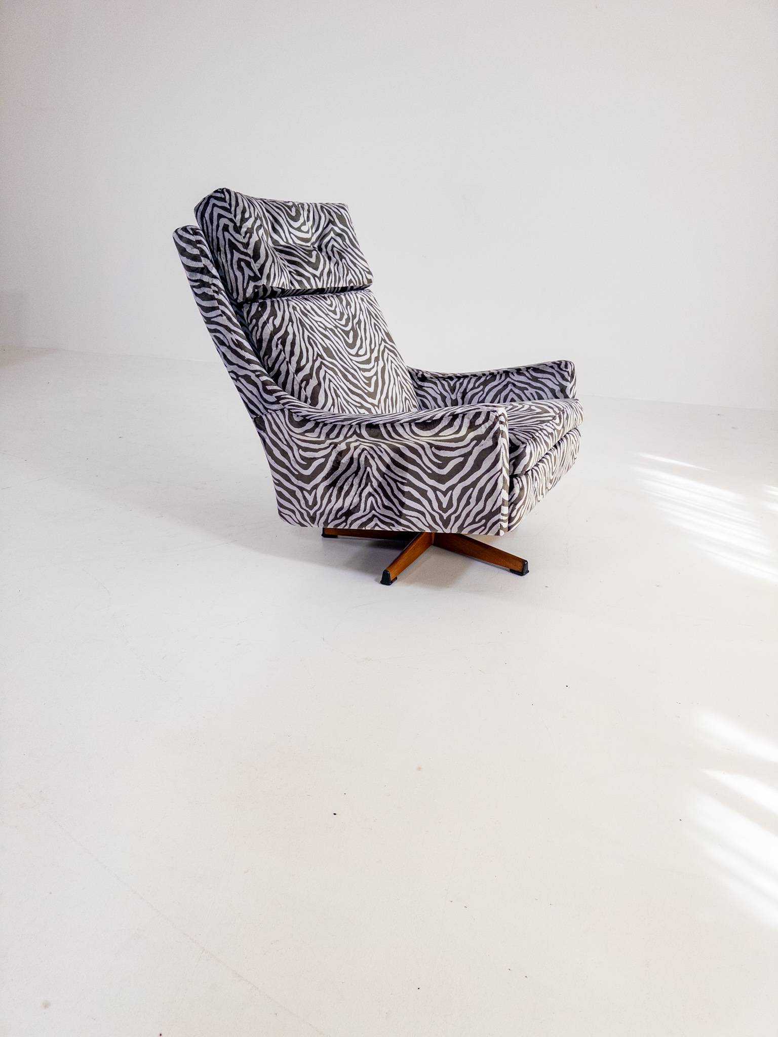 Nyomklädd i exklusivt zebratyg från finska Lauritzon, vilket ger fåtöljen ett modernt och uttrycksfullt lyft samtidigt som originaldesignen bevaras.