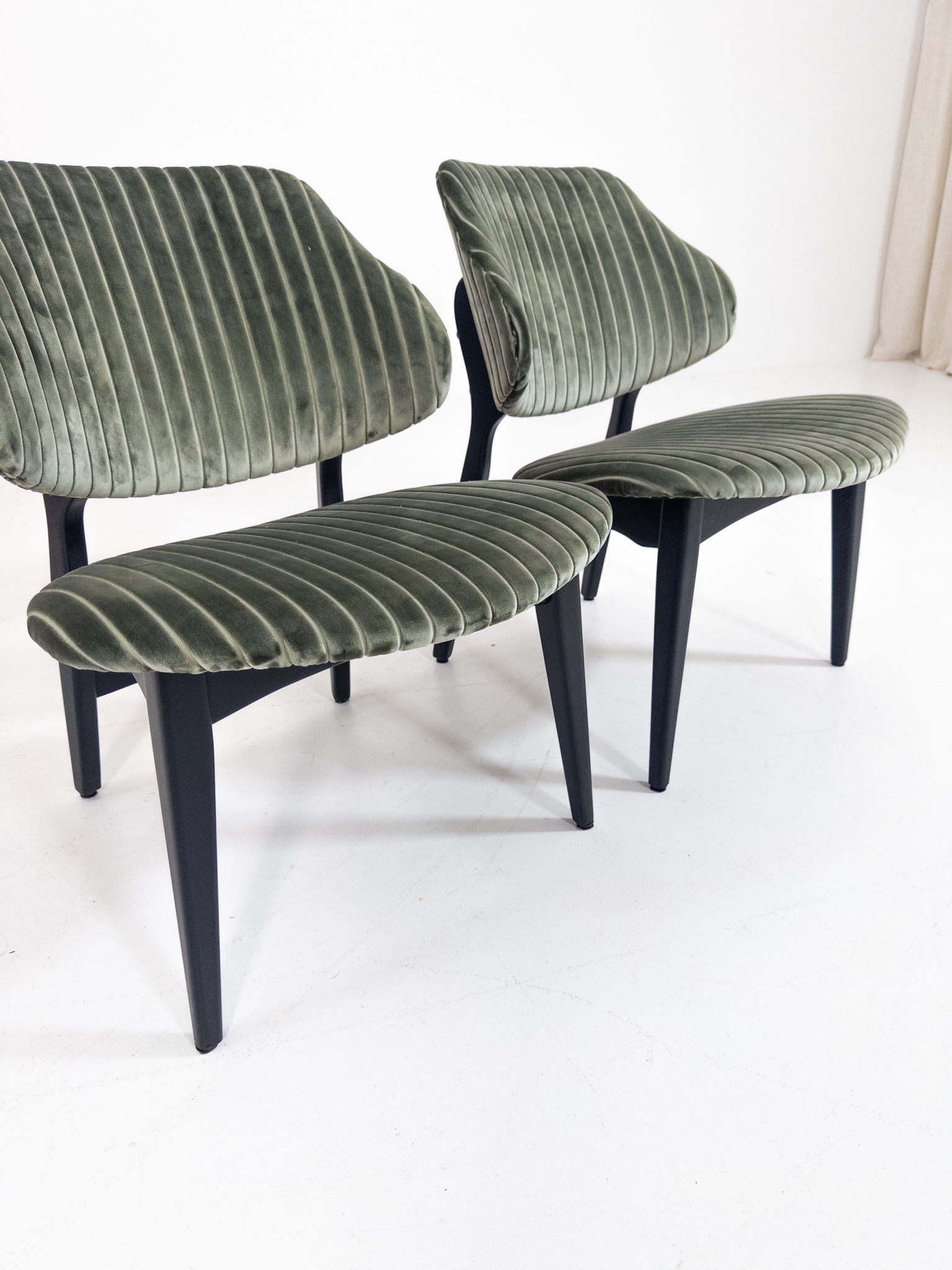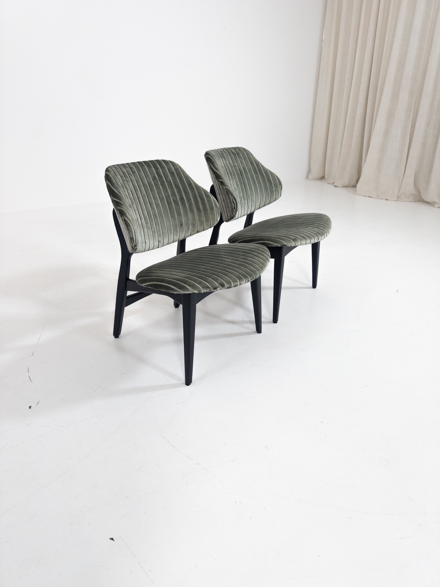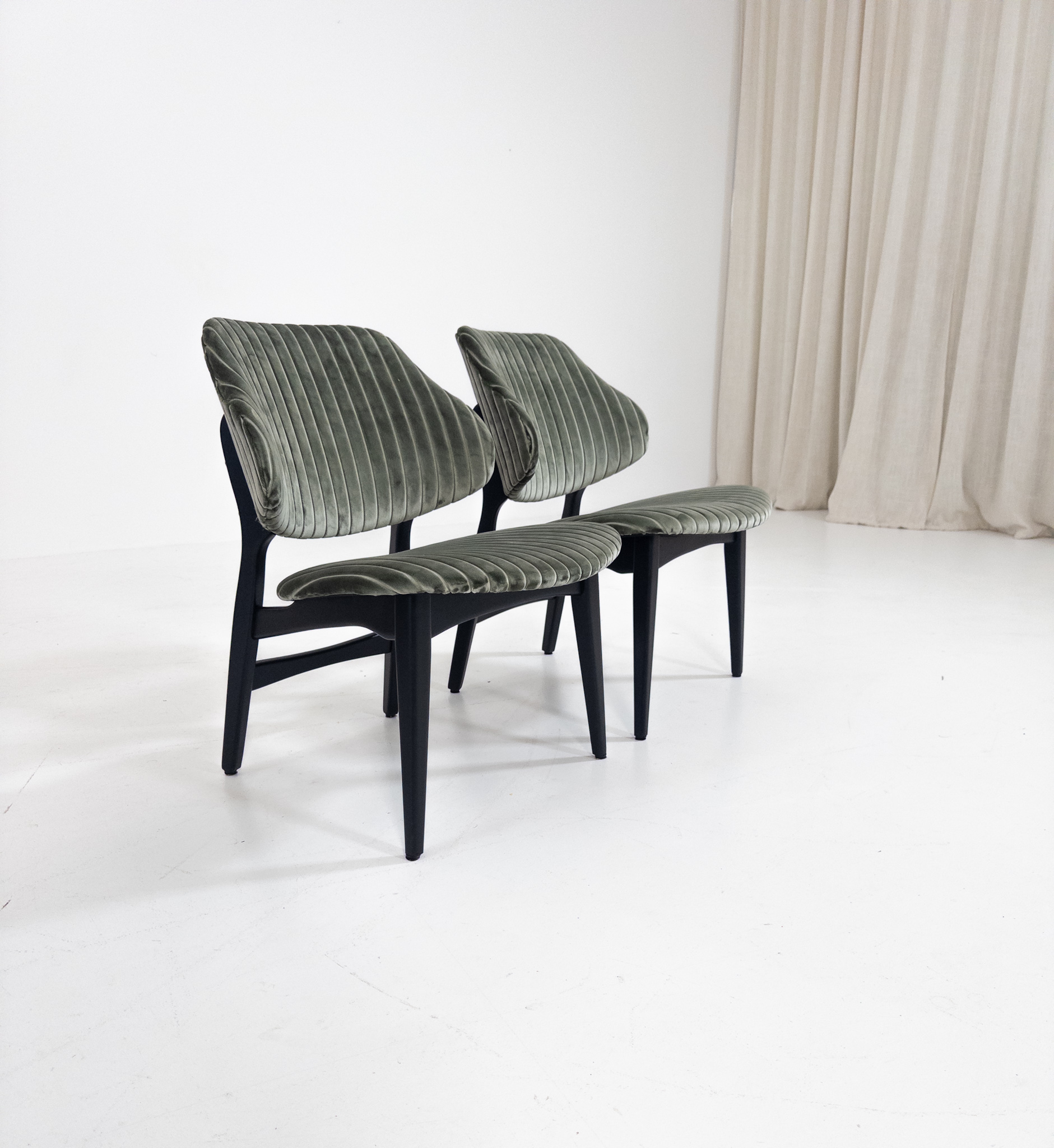Ett nätt och charmigt par fåtöljer från 1950-talet – IKEA:s modell “Winnie”. Den svarta trästommen ger en fin kontrast till den mjuka, gröna sammeten och den ribbade klädseln skapar ett elegant uttryck med tydlig vintagekänsla.