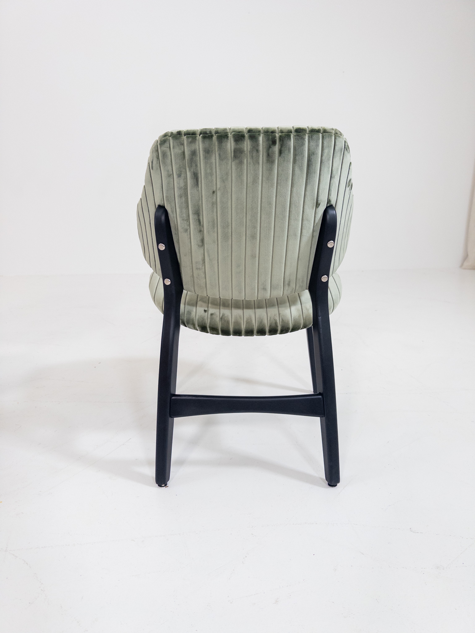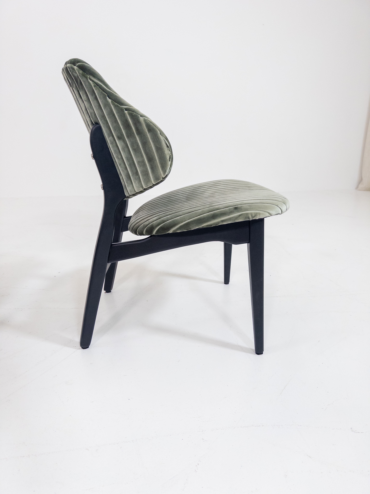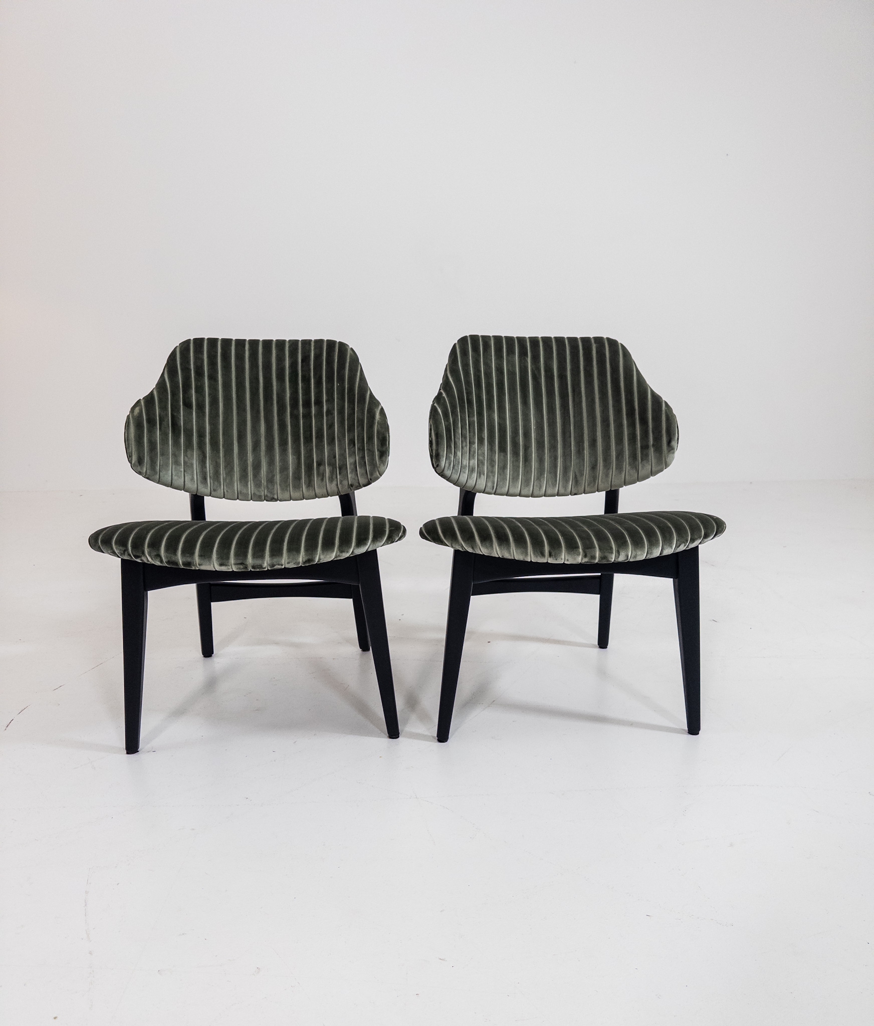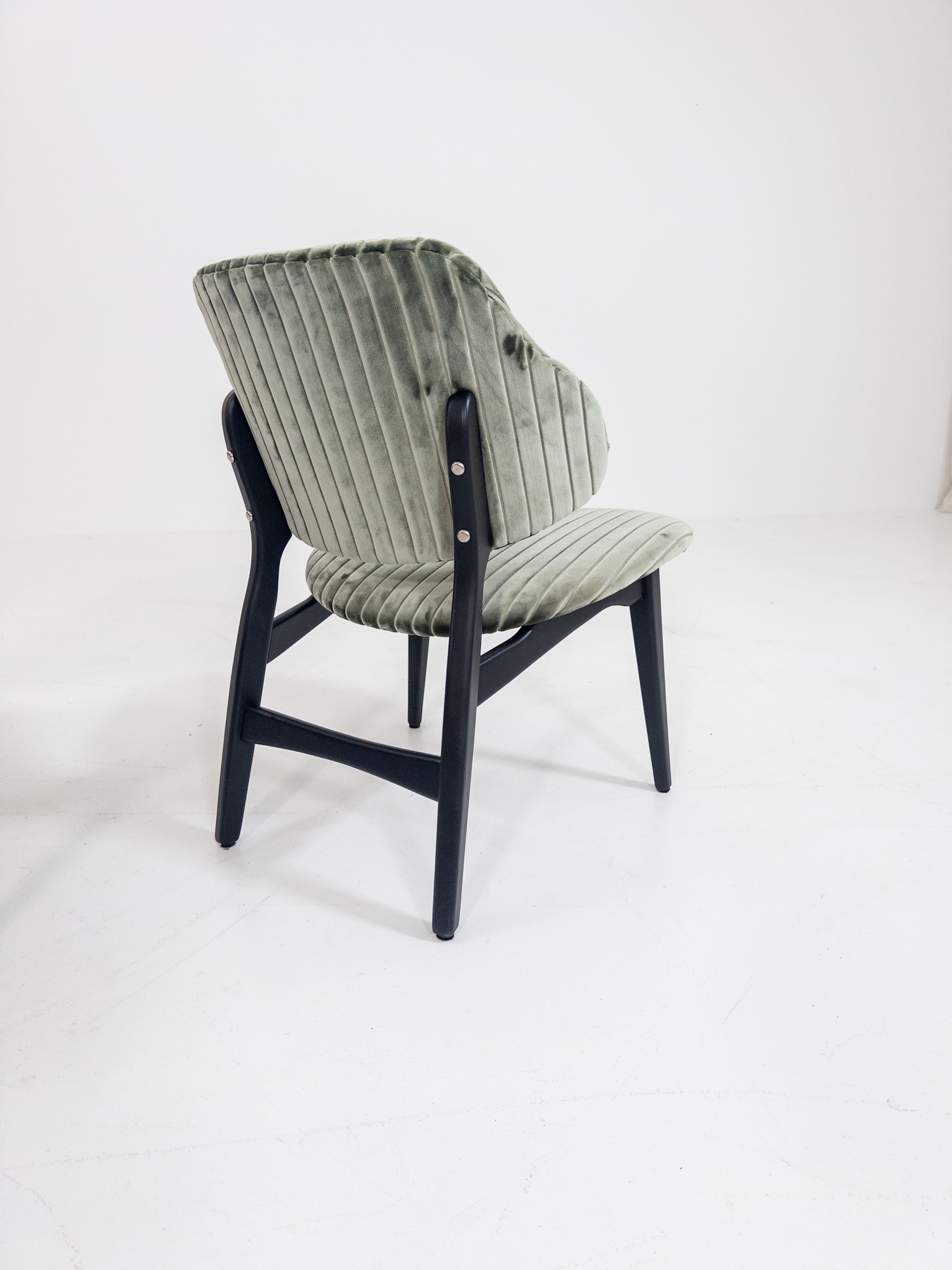 Ett nätt och charmigt par fåtöljer från 1950-talet – IKEA:s modell “Winnie”. Den svarta trästommen ger en fin kontrast till den mjuka, gröna sammeten och den ribbade klädseln skapar ett elegant uttryck med tydlig vintagekänsla.
