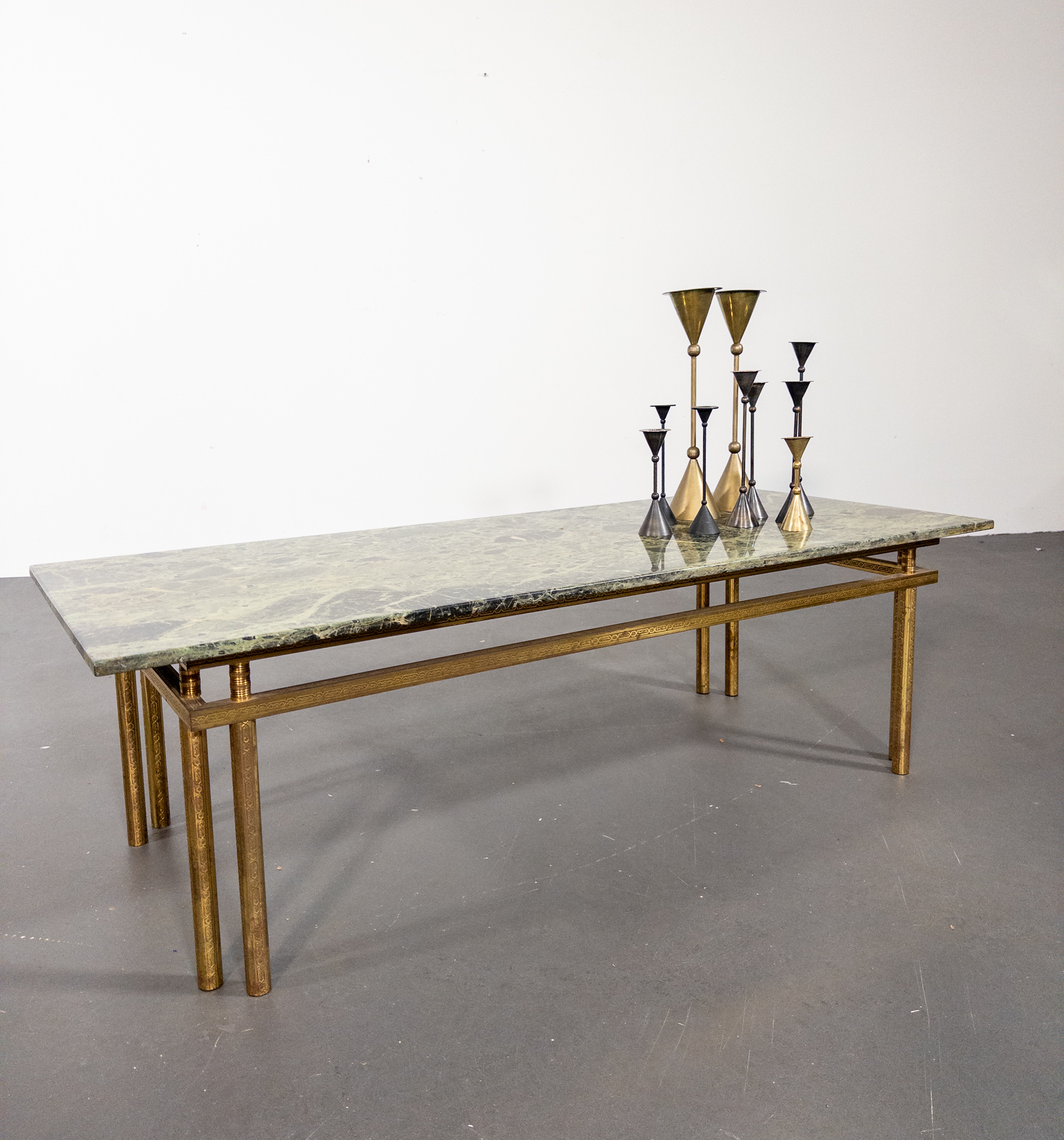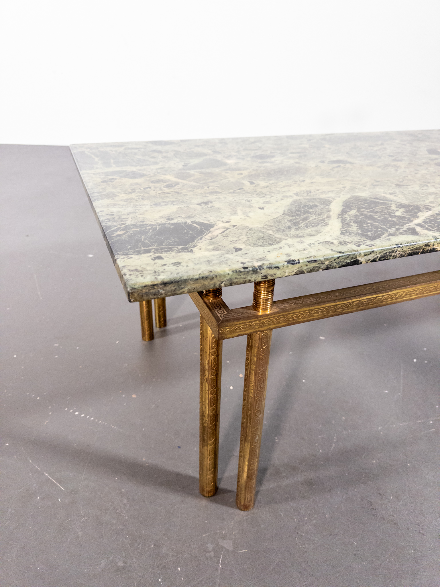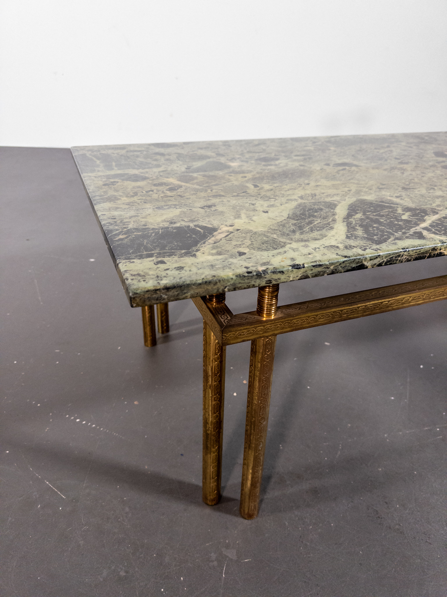 Underredet är utfört i patinerad mässing med vackra graverade detaljer och en geometrisk form som ger bordet ett lätt och sofistikerat uttryck. Kombinationen av mässing och grön marmor är typisk för den italienska designen från perioden och förknippas ofta med namn som Maison Jansen, Romeo Rega och Saporiti.
