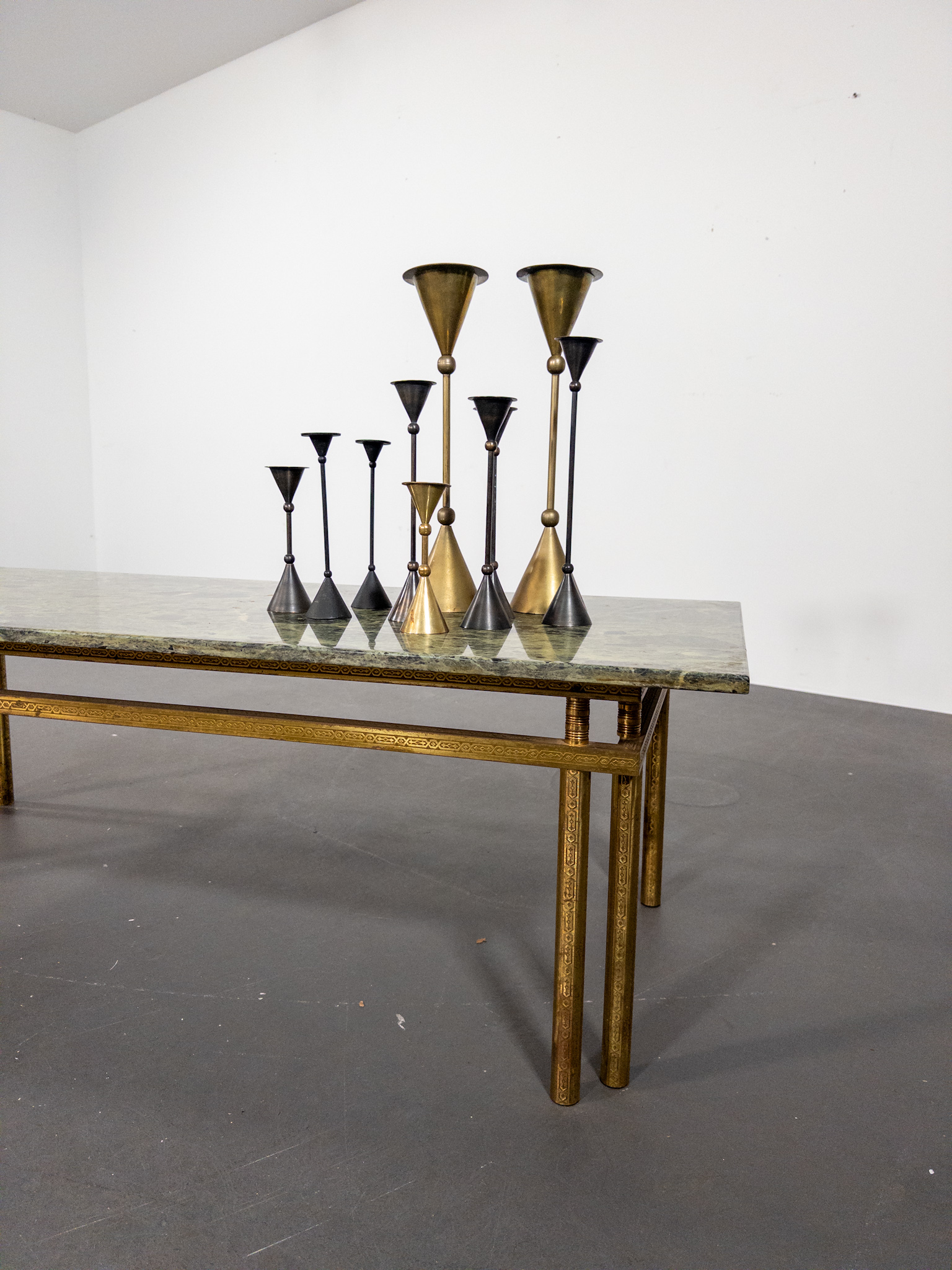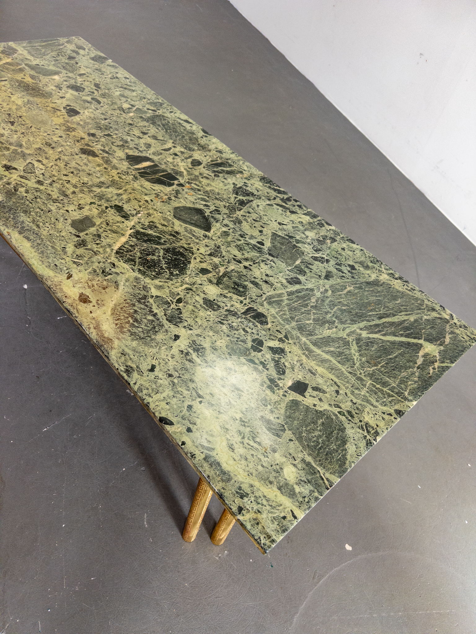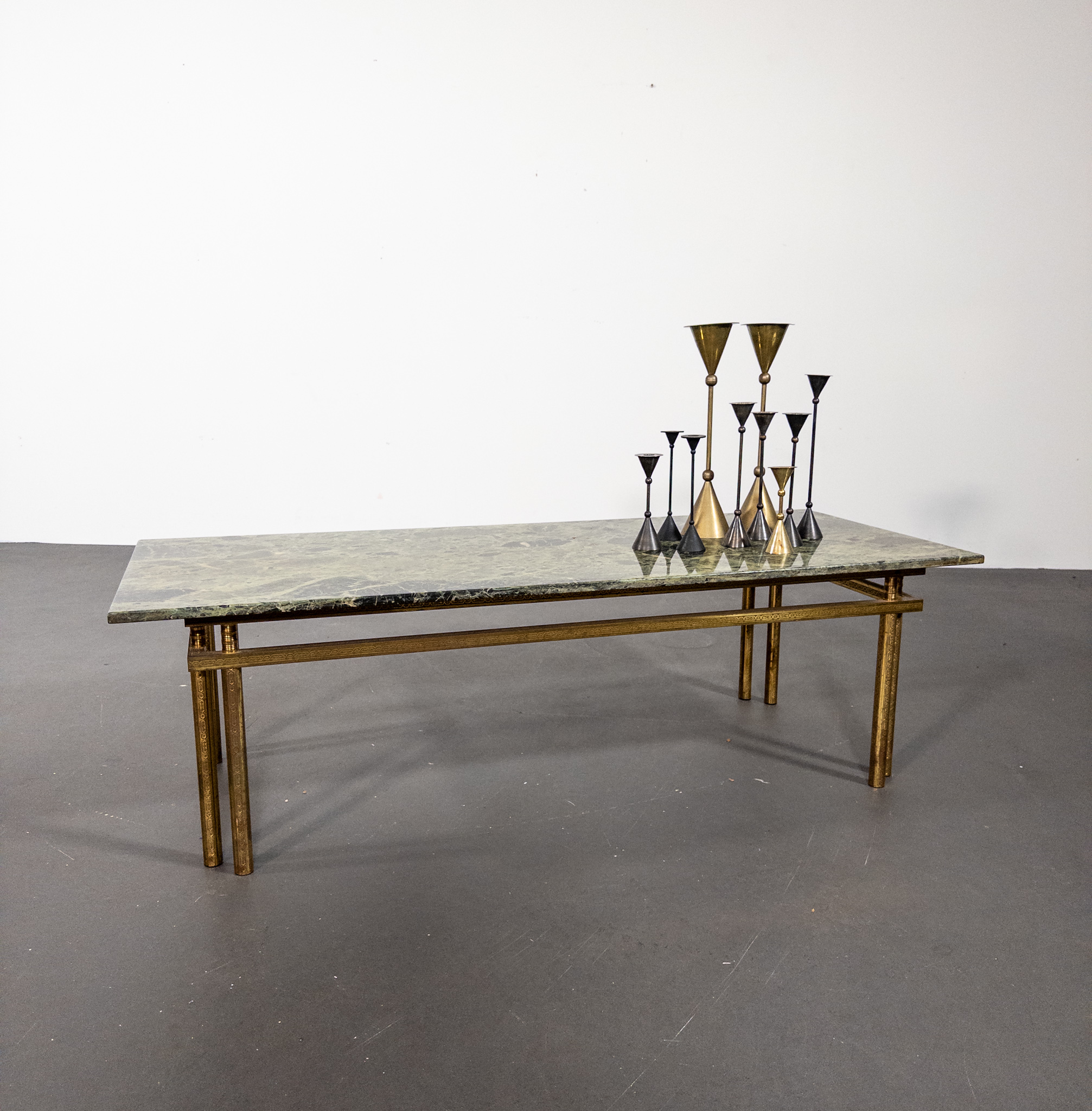 Underredet är utfört i patinerad mässing med vackra graverade detaljer och en geometrisk form som ger bordet ett lätt och sofistikerat uttryck. Kombinationen av mässing och grön marmor är typisk för den italienska designen från perioden och förknippas ofta med namn som Maison Jansen, Romeo Rega och Saporiti.