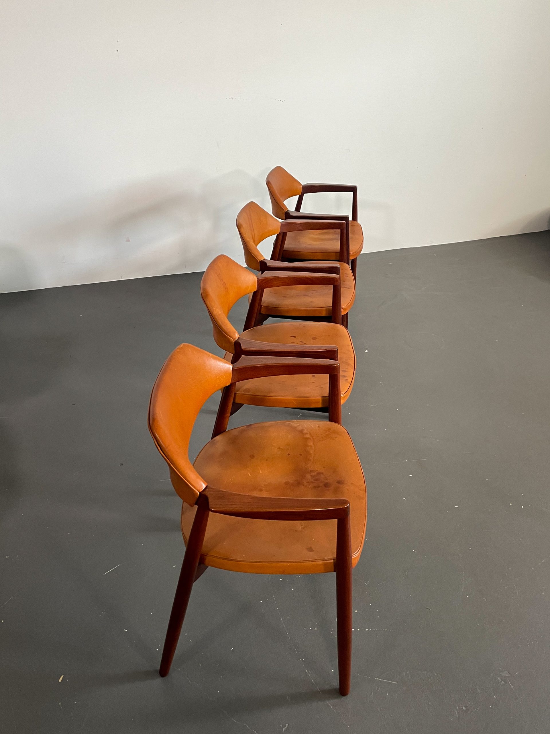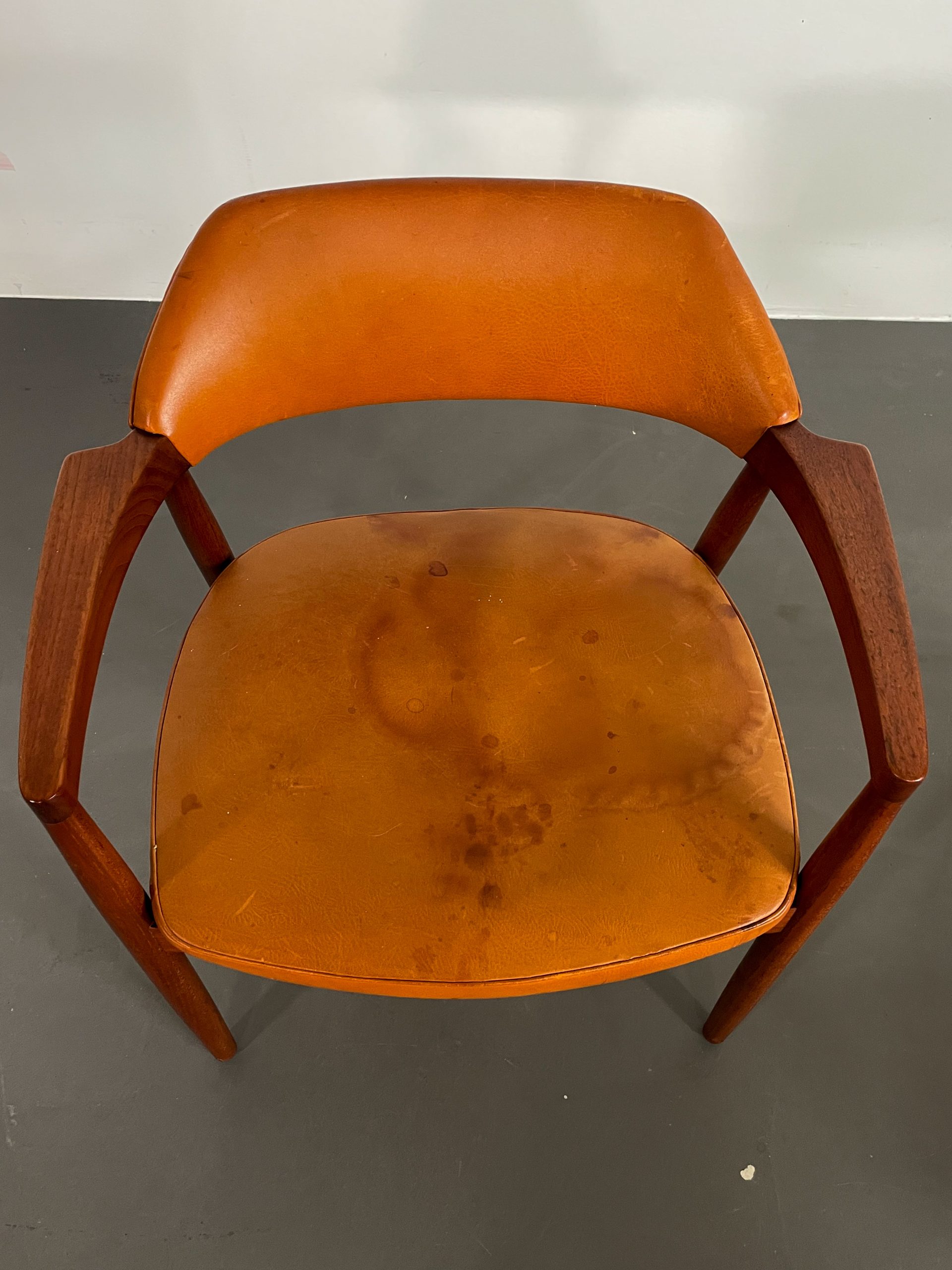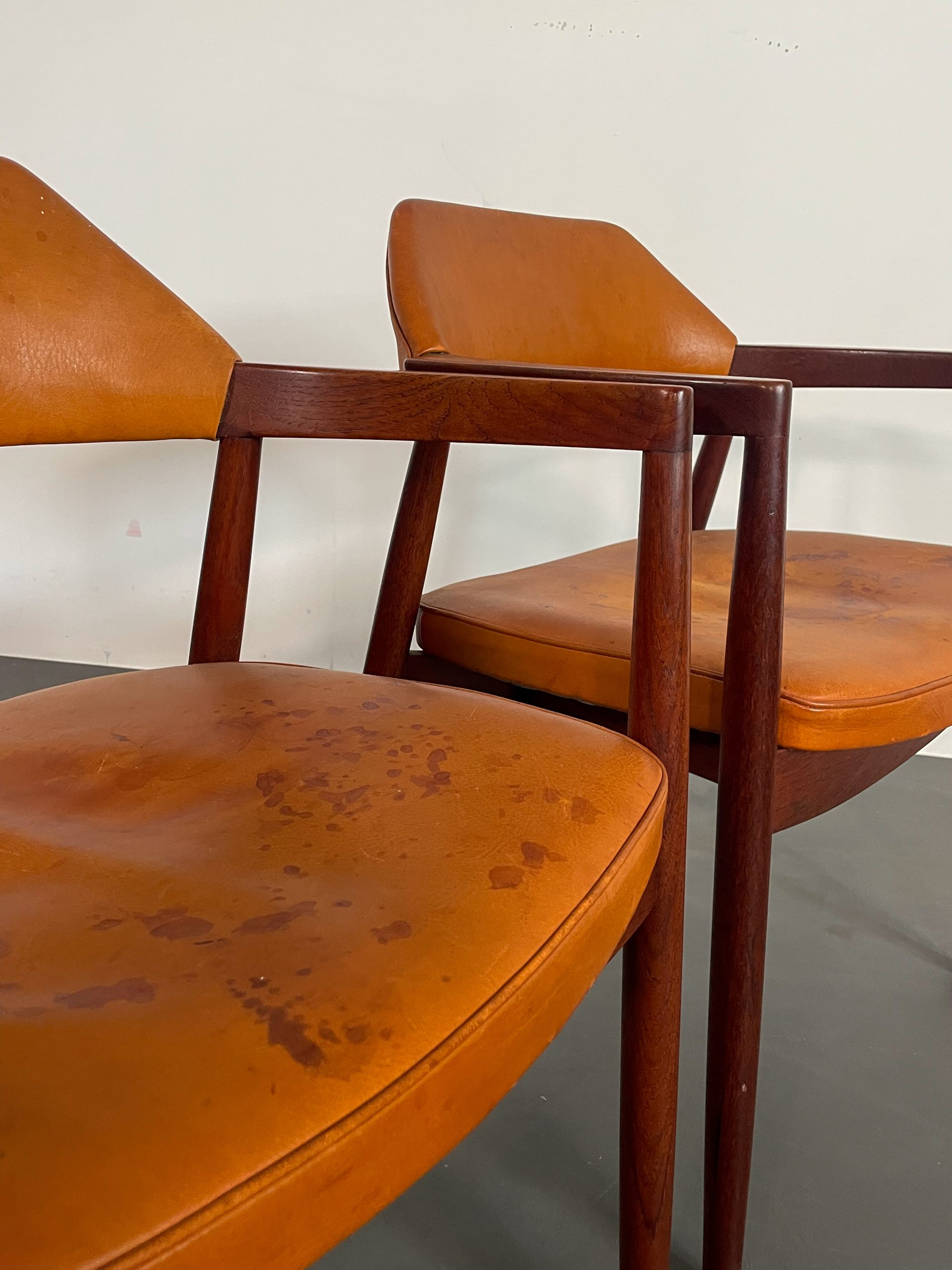 Ovanliga karmstolar i teak med orginalklädsel i cognacsfärgat läder i rygg och sits från 1957.