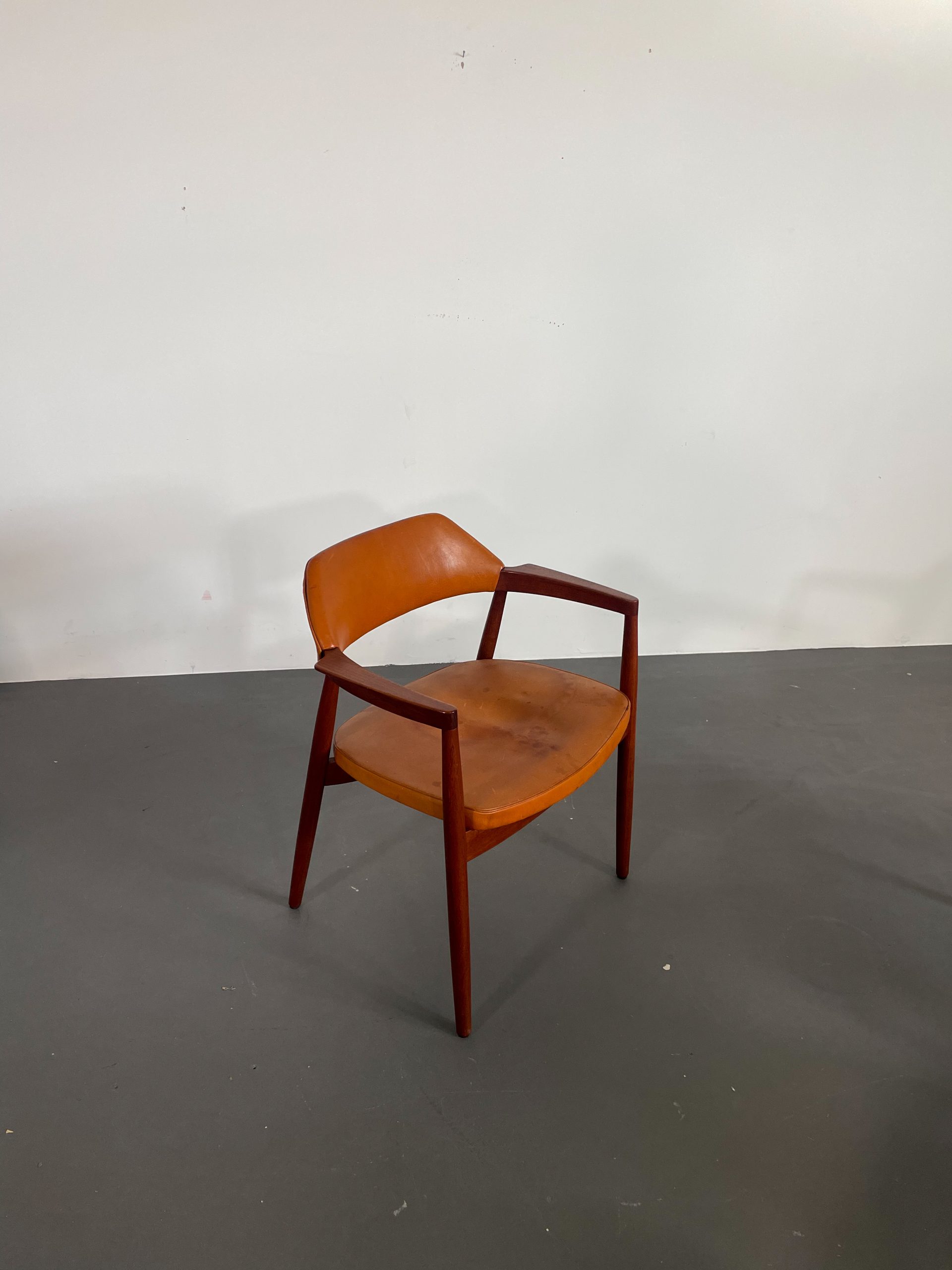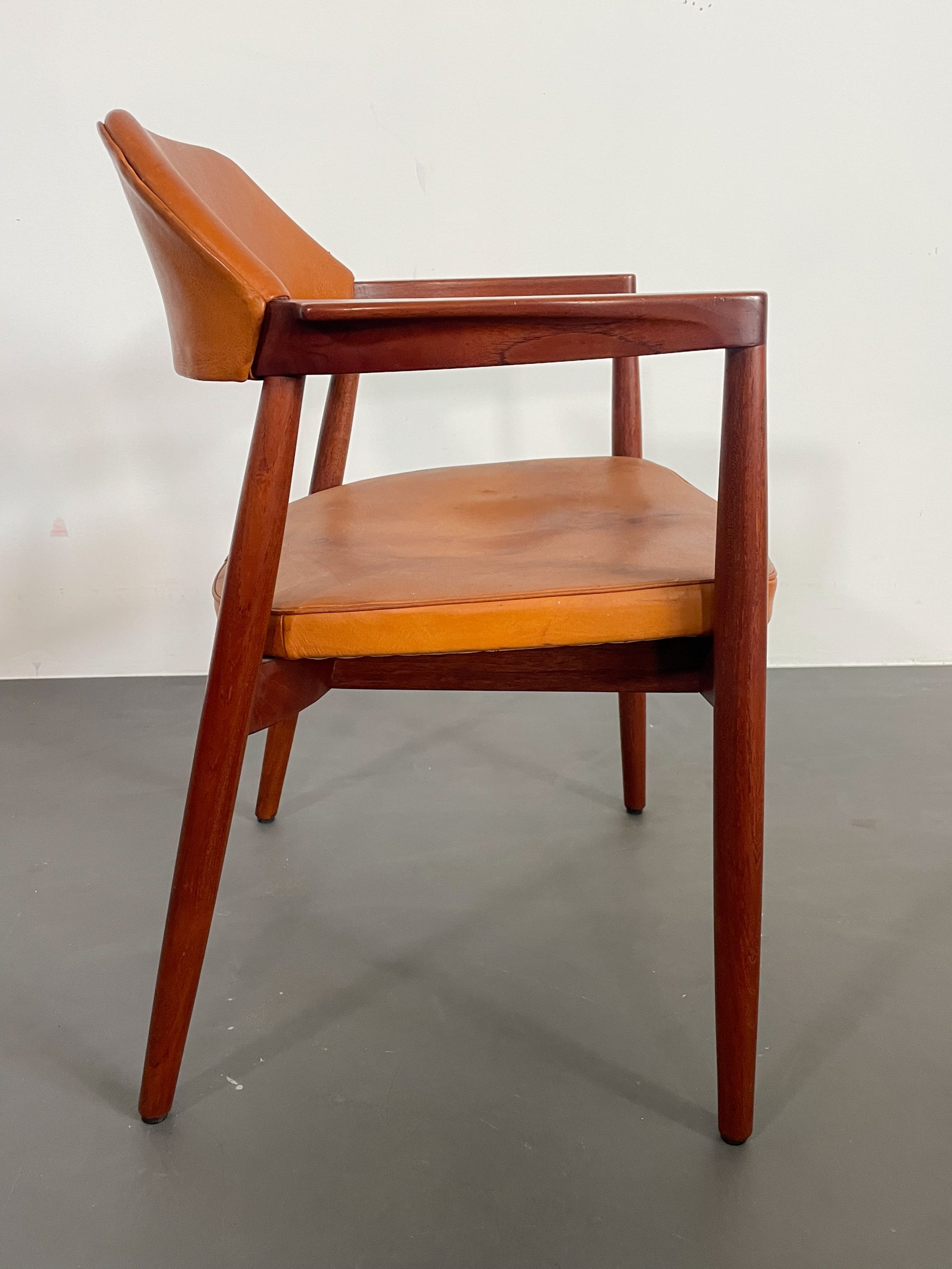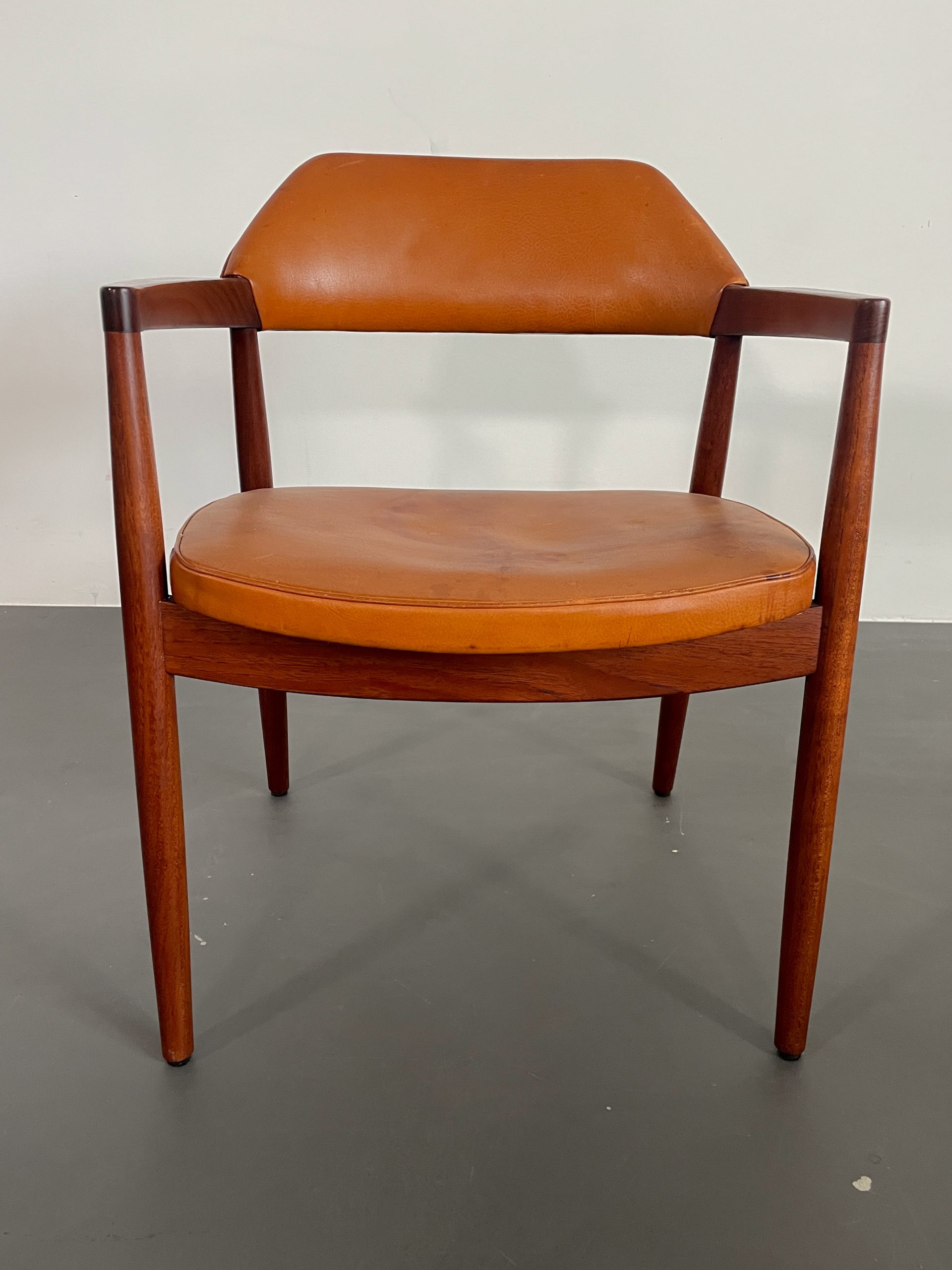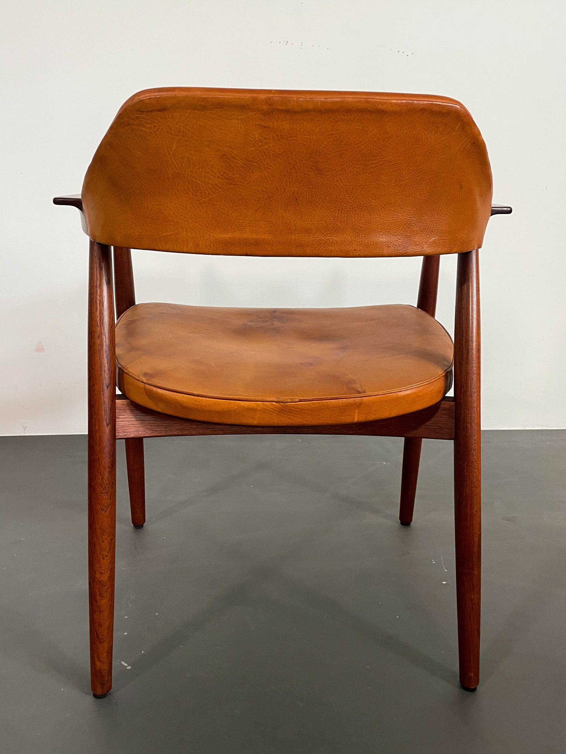 Ovanliga karmstolar i teak med orginalklädsel i cognacsfärgat läder i rygg och sits från 1957.