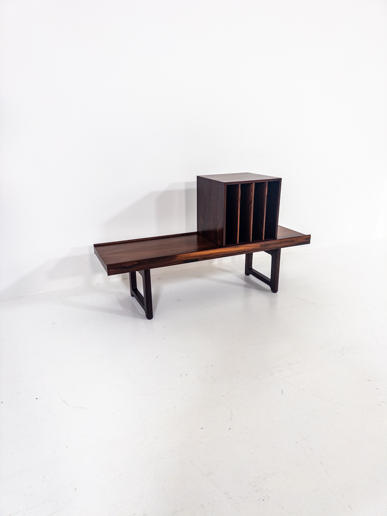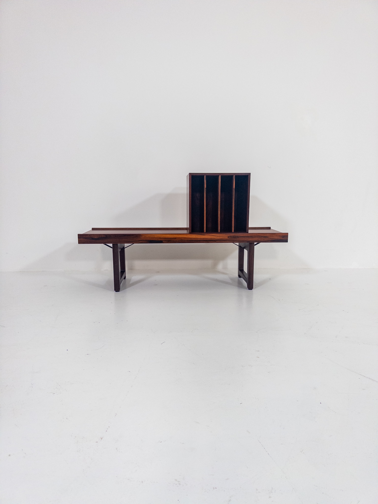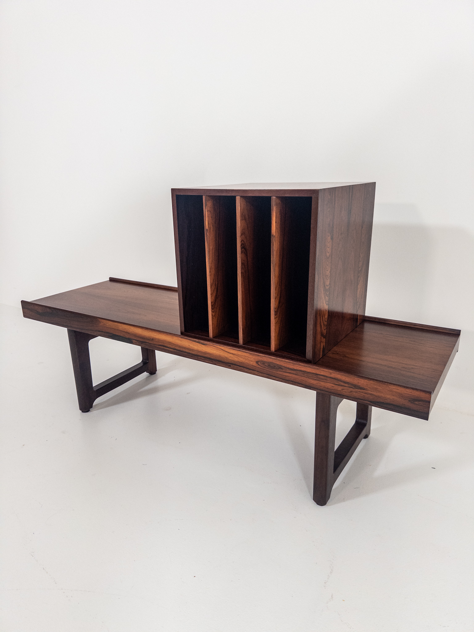 Den lösa LP-förvaringen gör möbeln både dekorativ och funktionell — perfekt som mediabänk, hallbänk