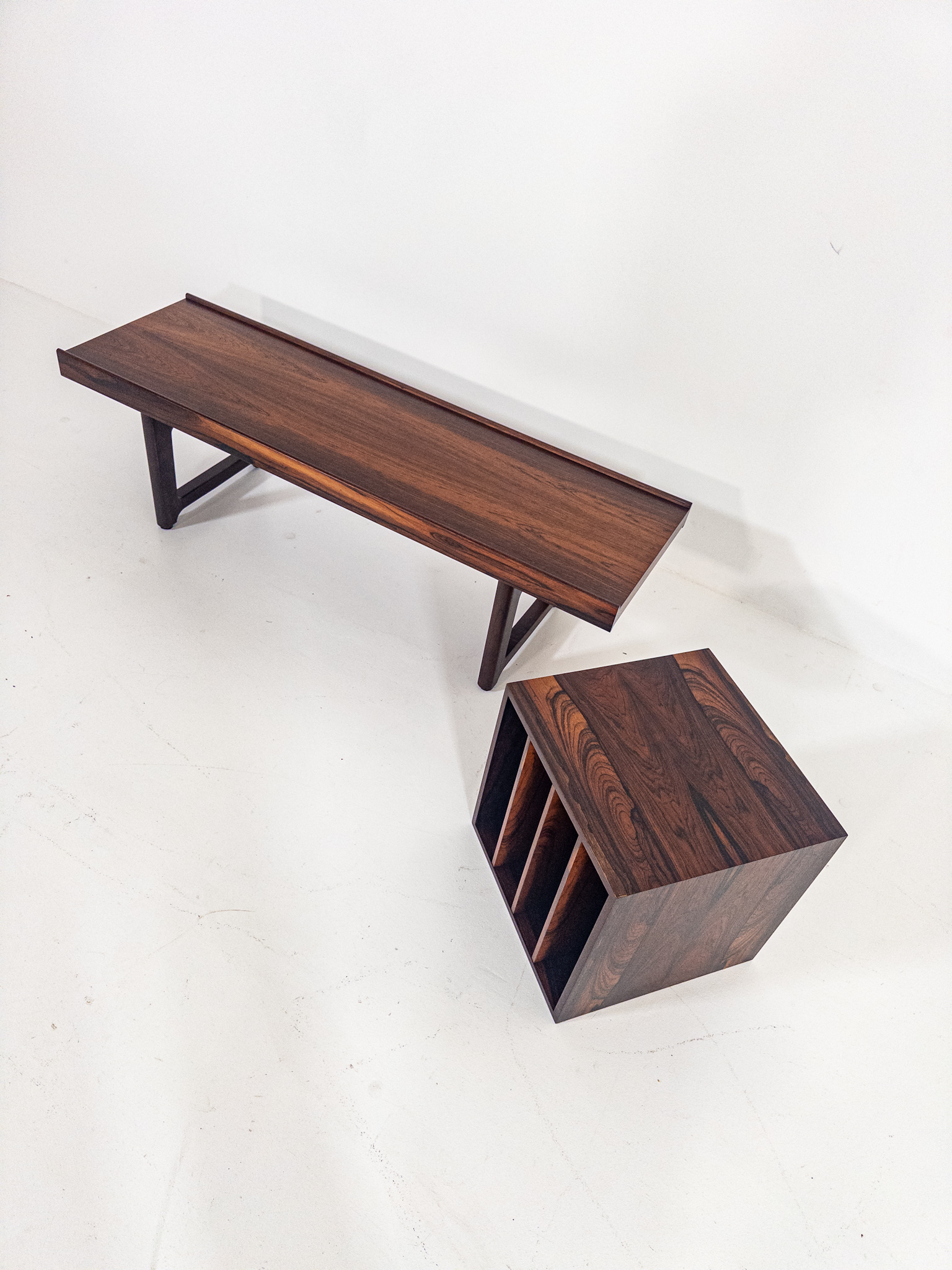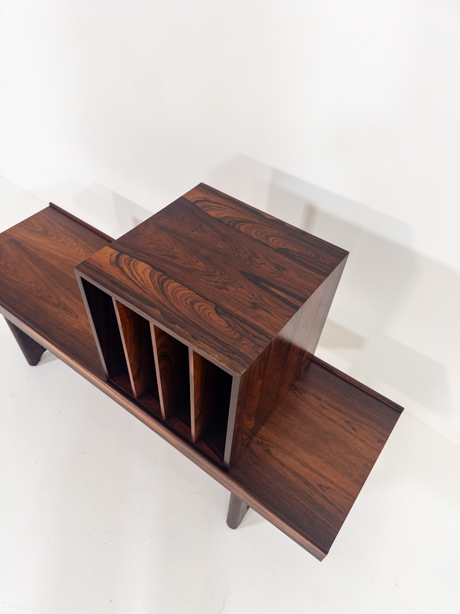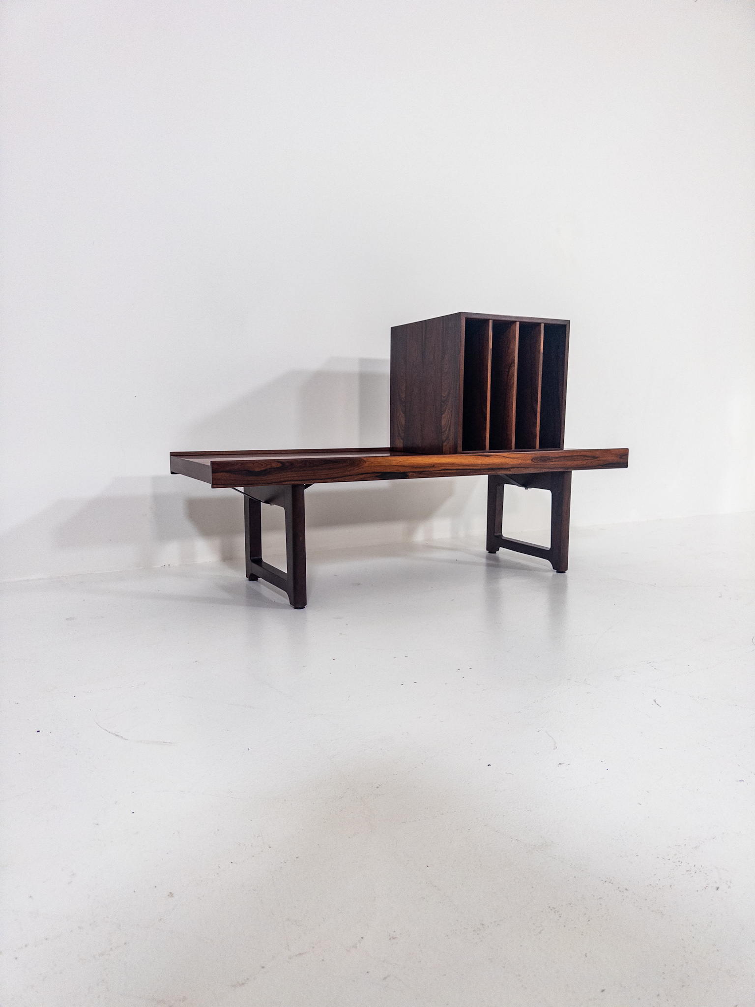 Den lösa LP-förvaringen gör möbeln både dekorativ och funktionell — perfekt som mediabänk, hallbänk