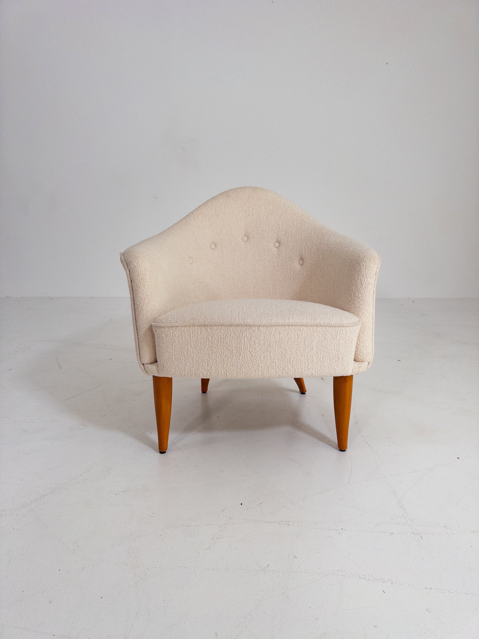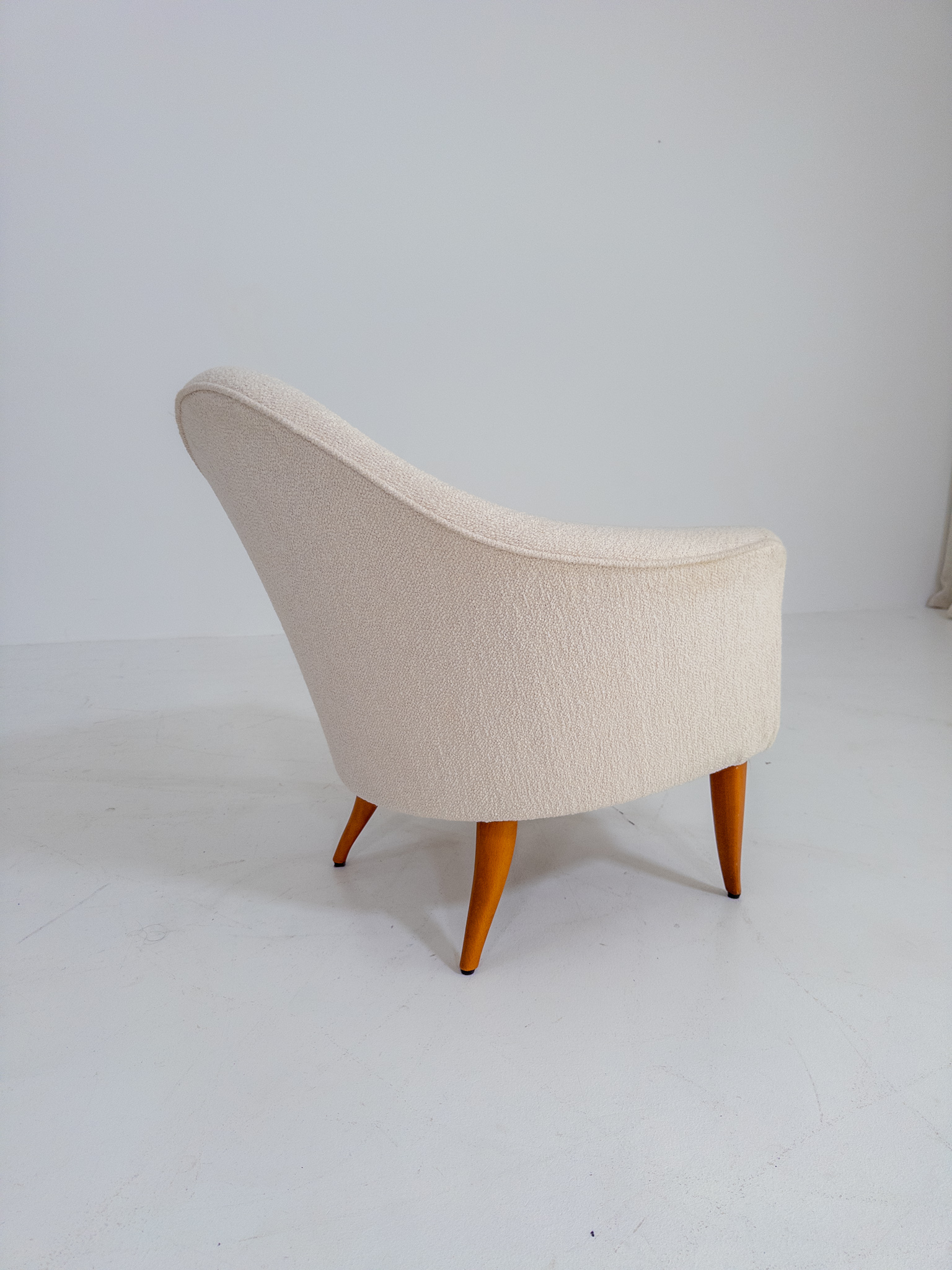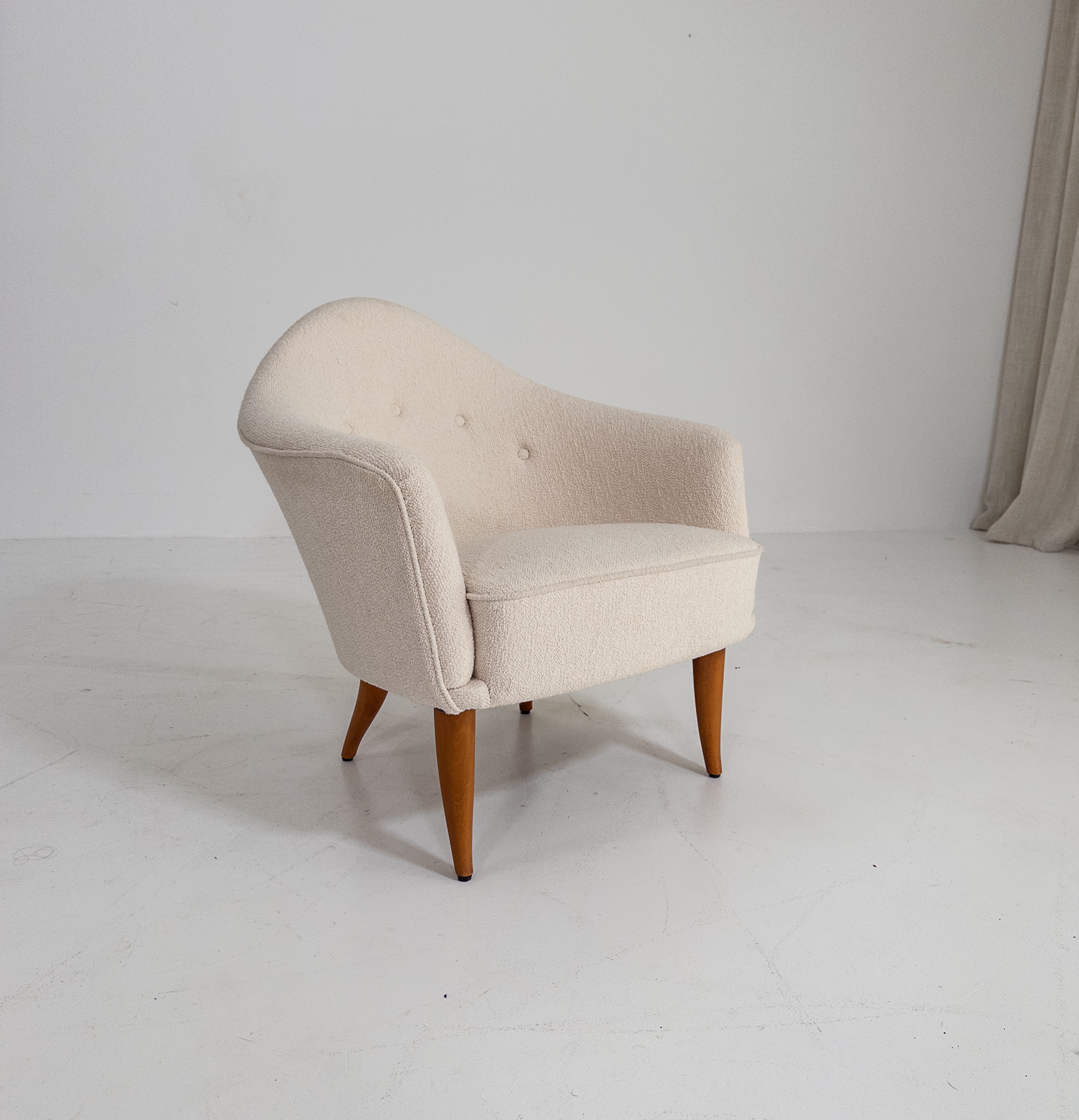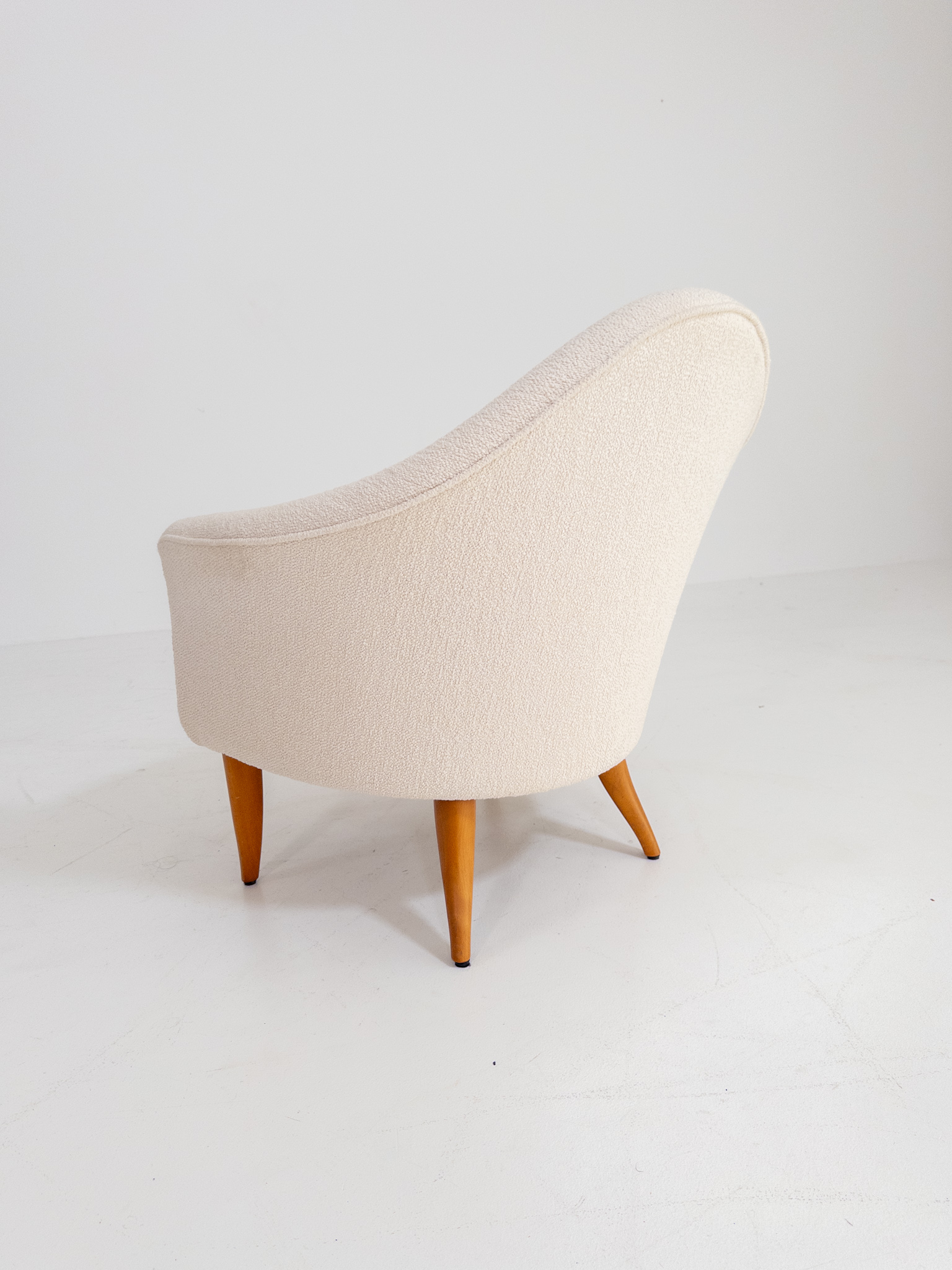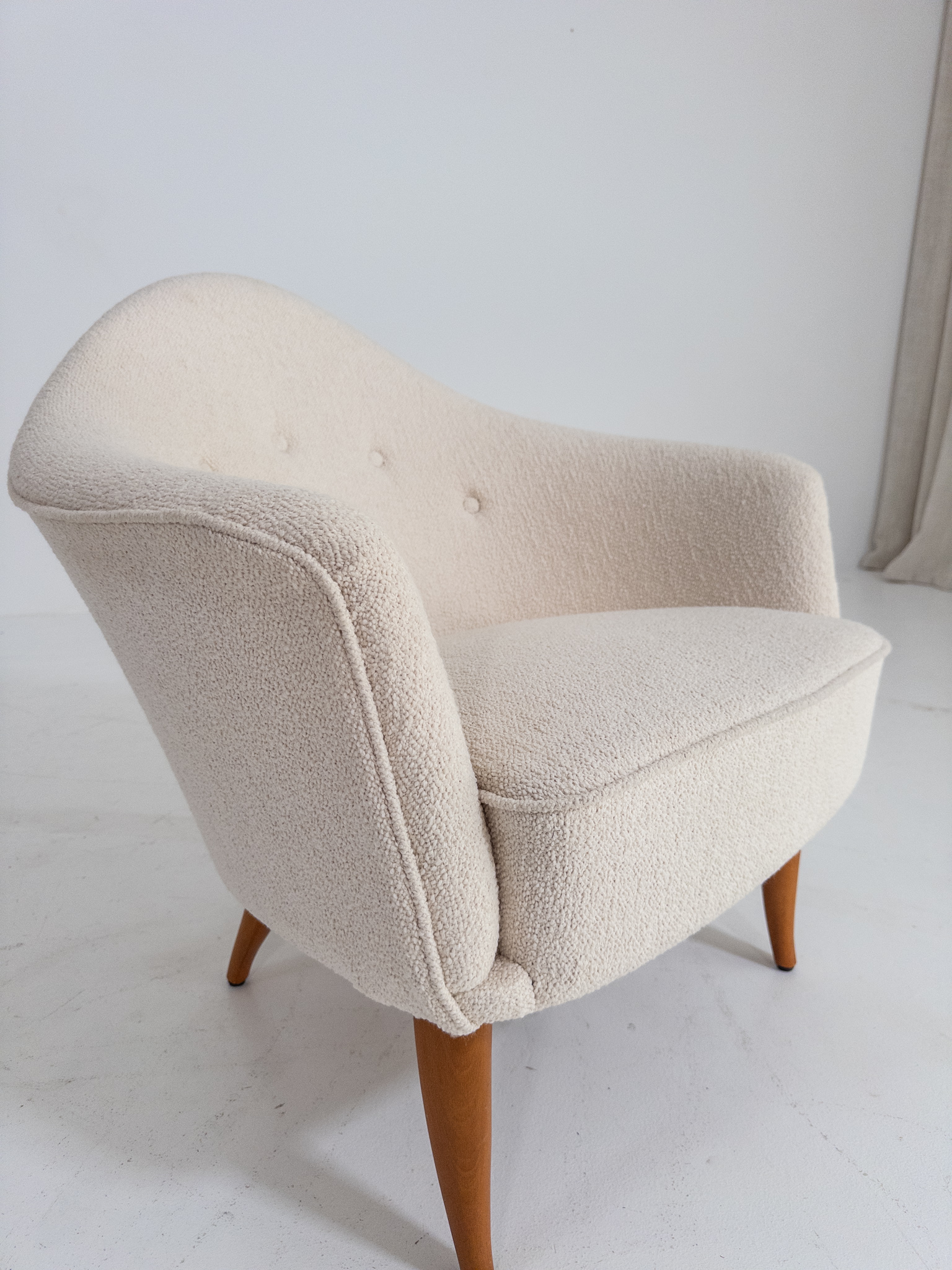 Fåtöljen har sin karaktäristiska mjuka, nätta form med omslutande rygg och vackert svängda linjer. Nyomklädd i ett ljust bouclétyg som ger stolen ett varmt, exklusivt och tidlöst uttryck.