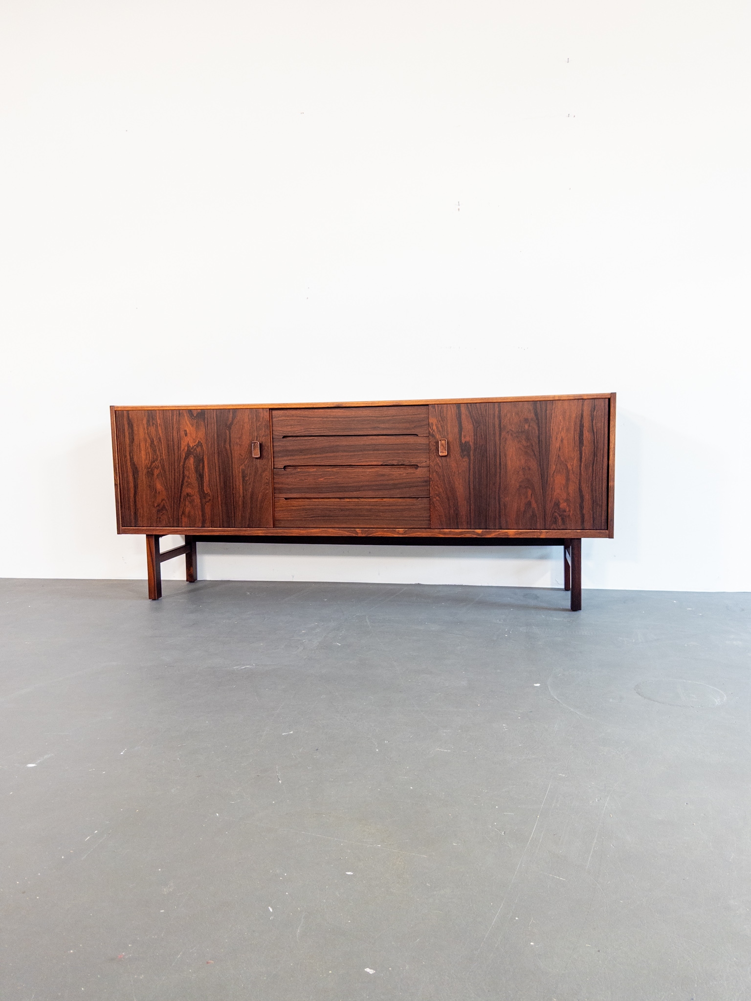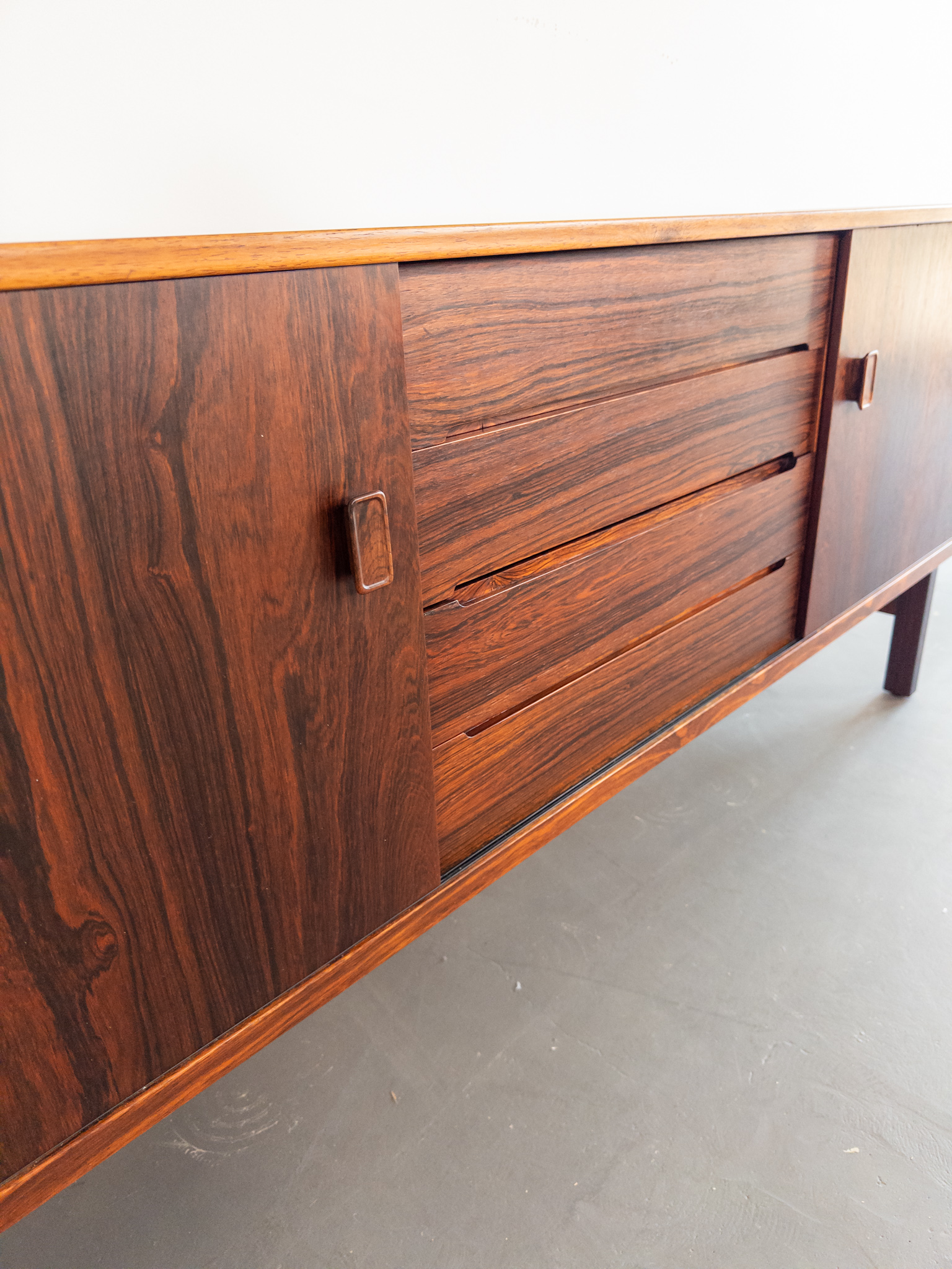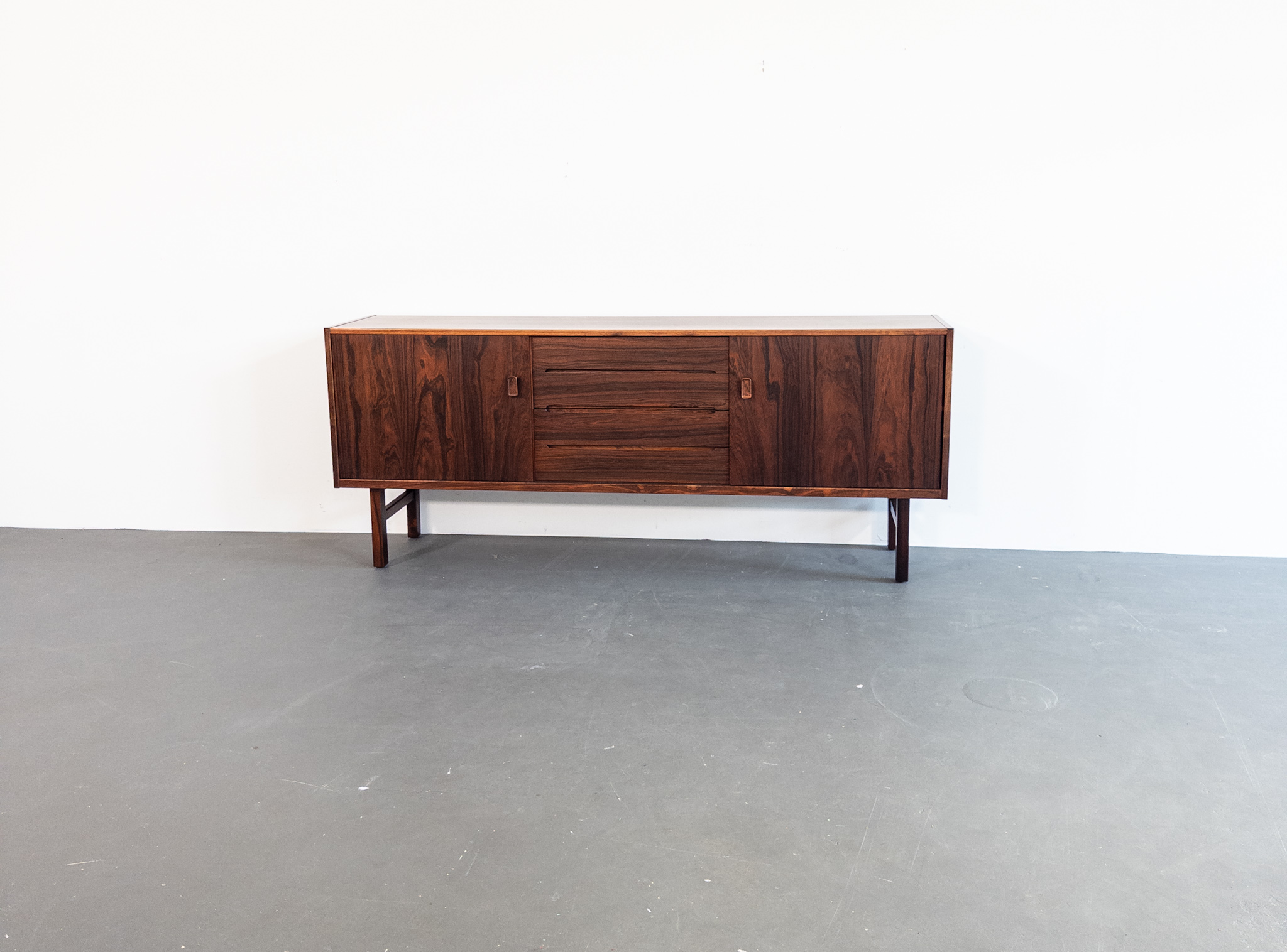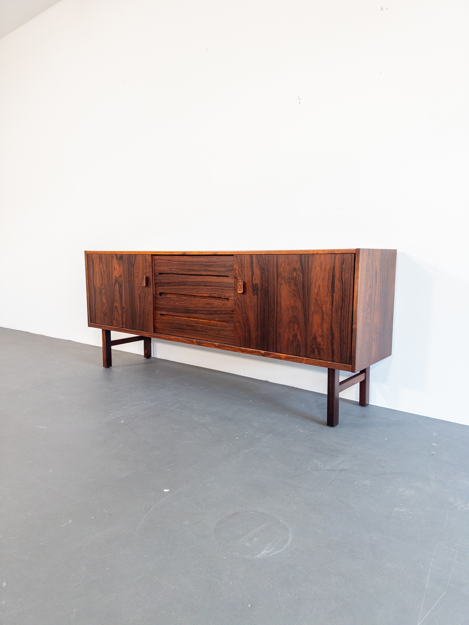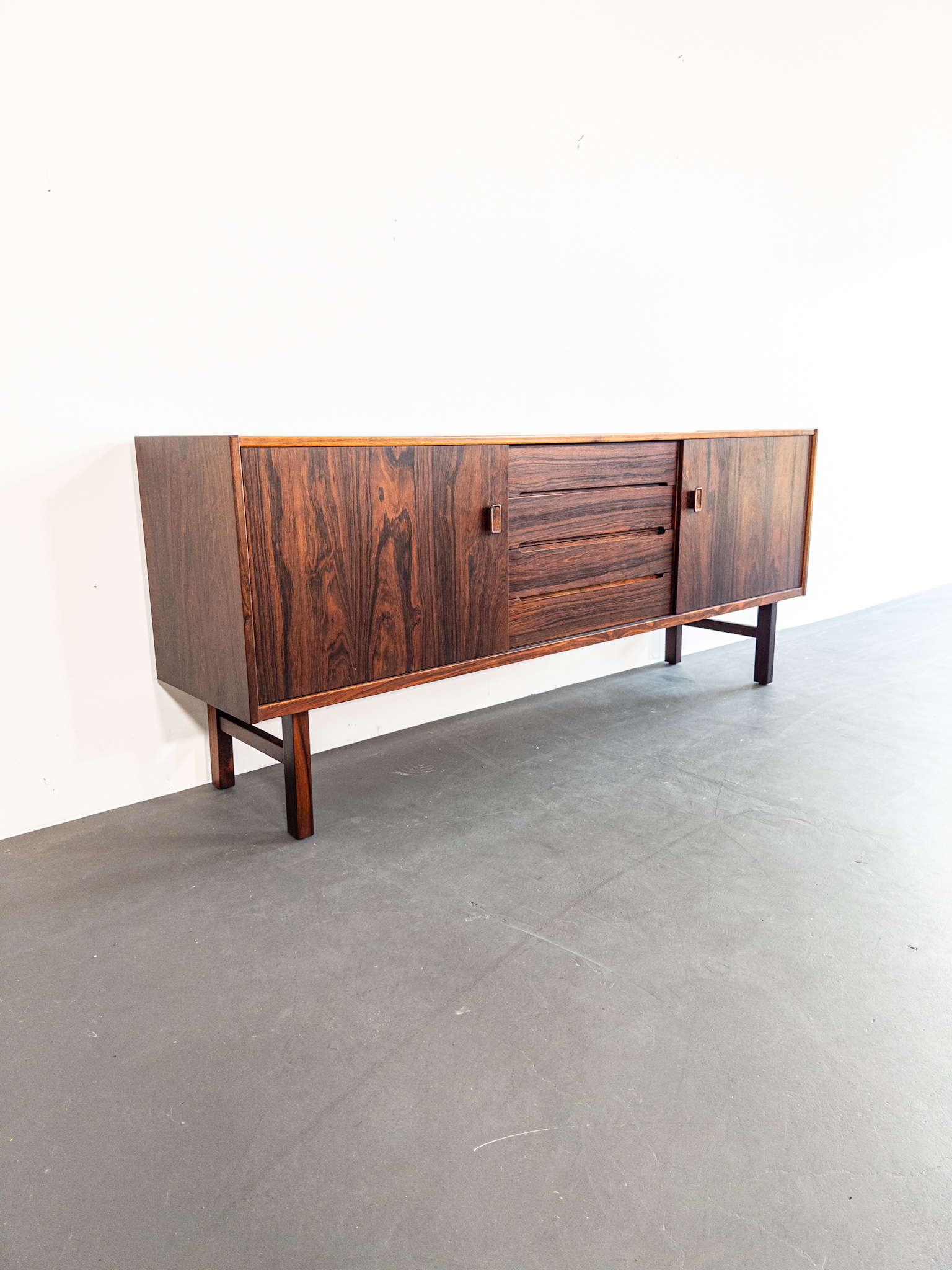 Elegant och tidlöst sideboard från svenska Troeds möbelfabrik, modell “Arild”, formgivet under det stilbildande 60-talet. Tillverkat i exklusiv palisander-Santos Rosewood med vacker ådring som ger ett varmt och levande uttryck.