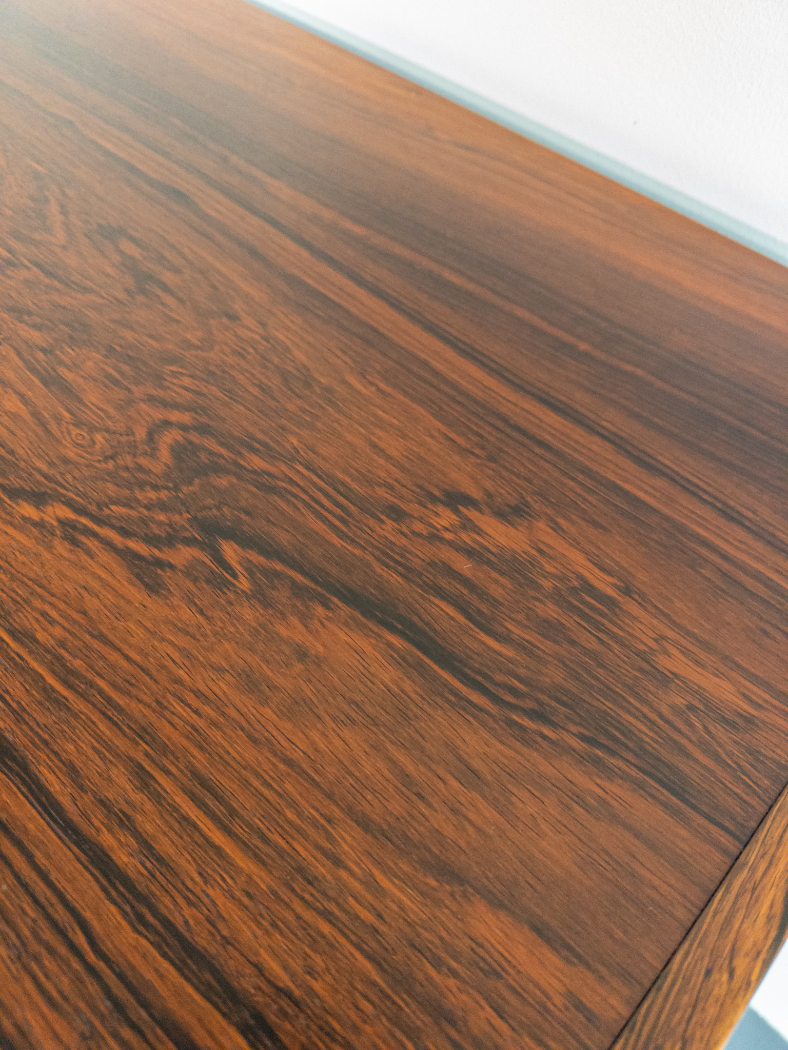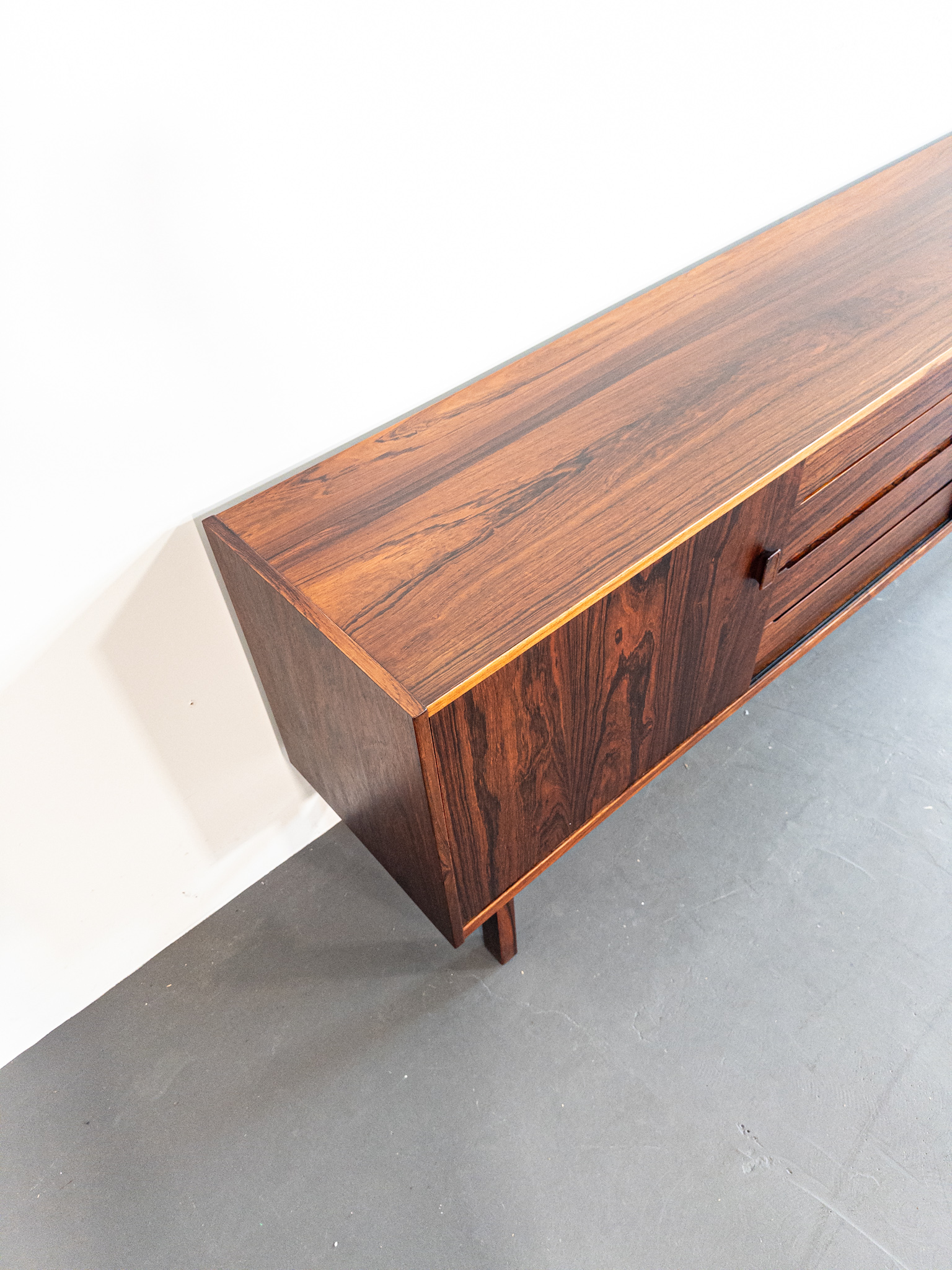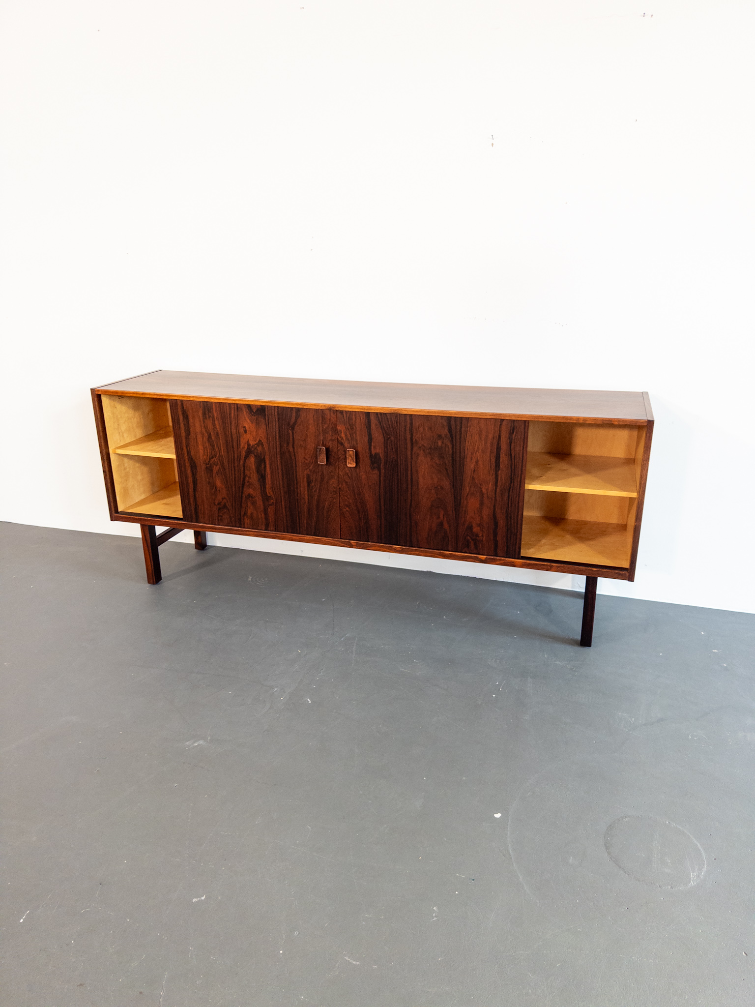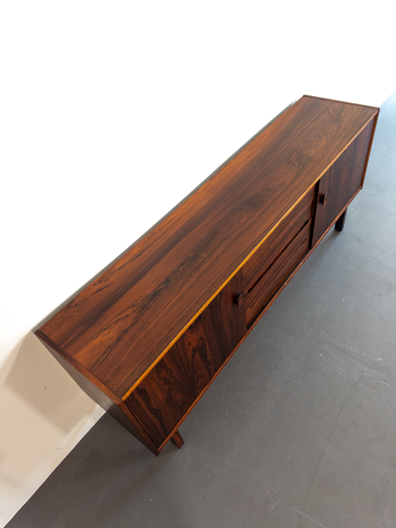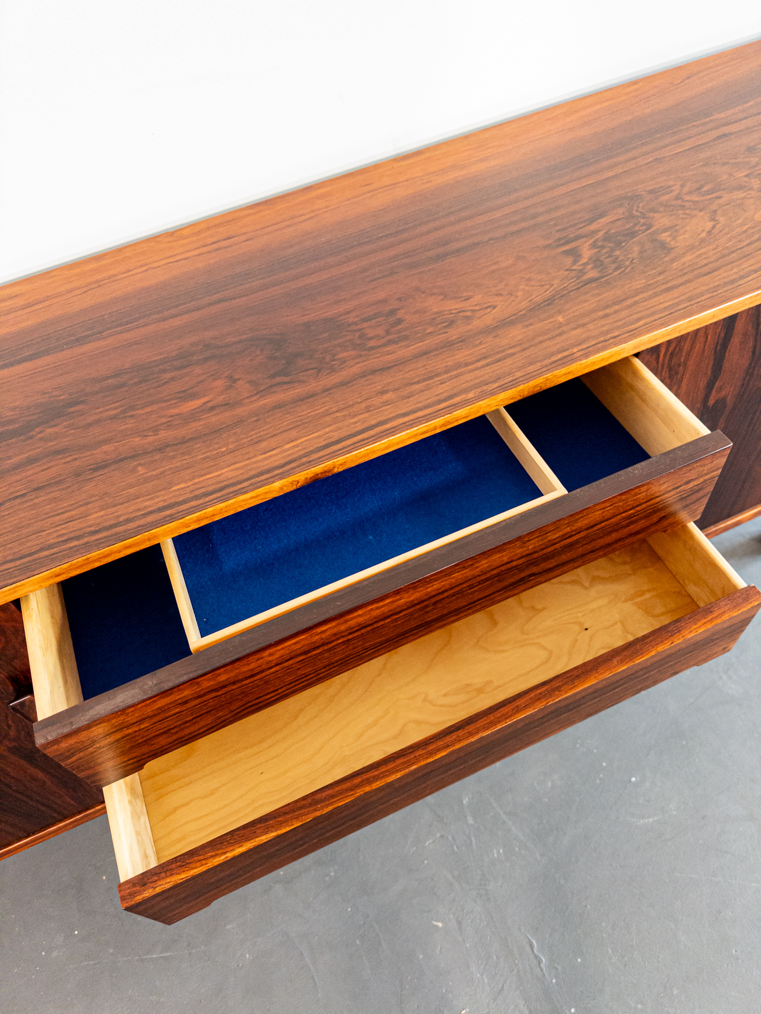 Elegant och tidlöst sideboard från svenska Troeds möbelfabrik, modell “Arild”, formgivet under det stilbildande 60-talet. Tillverkat i exklusiv palisander-Santos Rosewood med vacker ådring som ger ett varmt och levande uttryck.