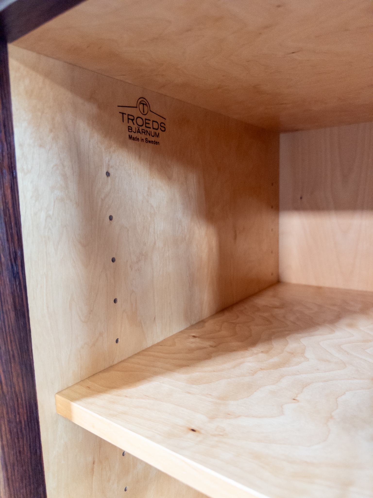 Sideboardet har två dörrar och fyra lådor med integrerade handtag – en perfekt balans mellan form och funktion. Möbeln står på höga ben som ger en svävande känsla och ett luftigt intryck, typiskt för skandinavisk modernism.