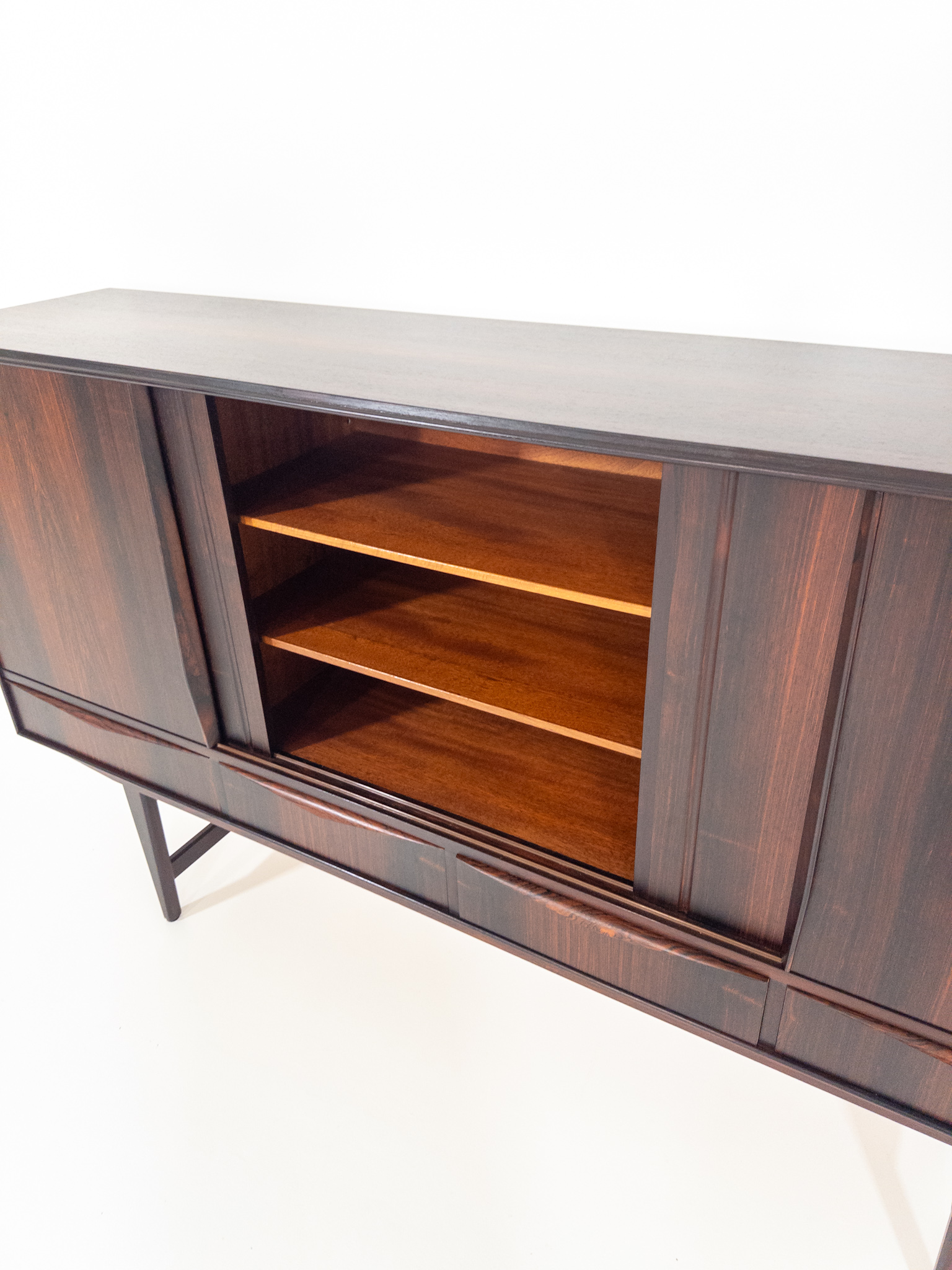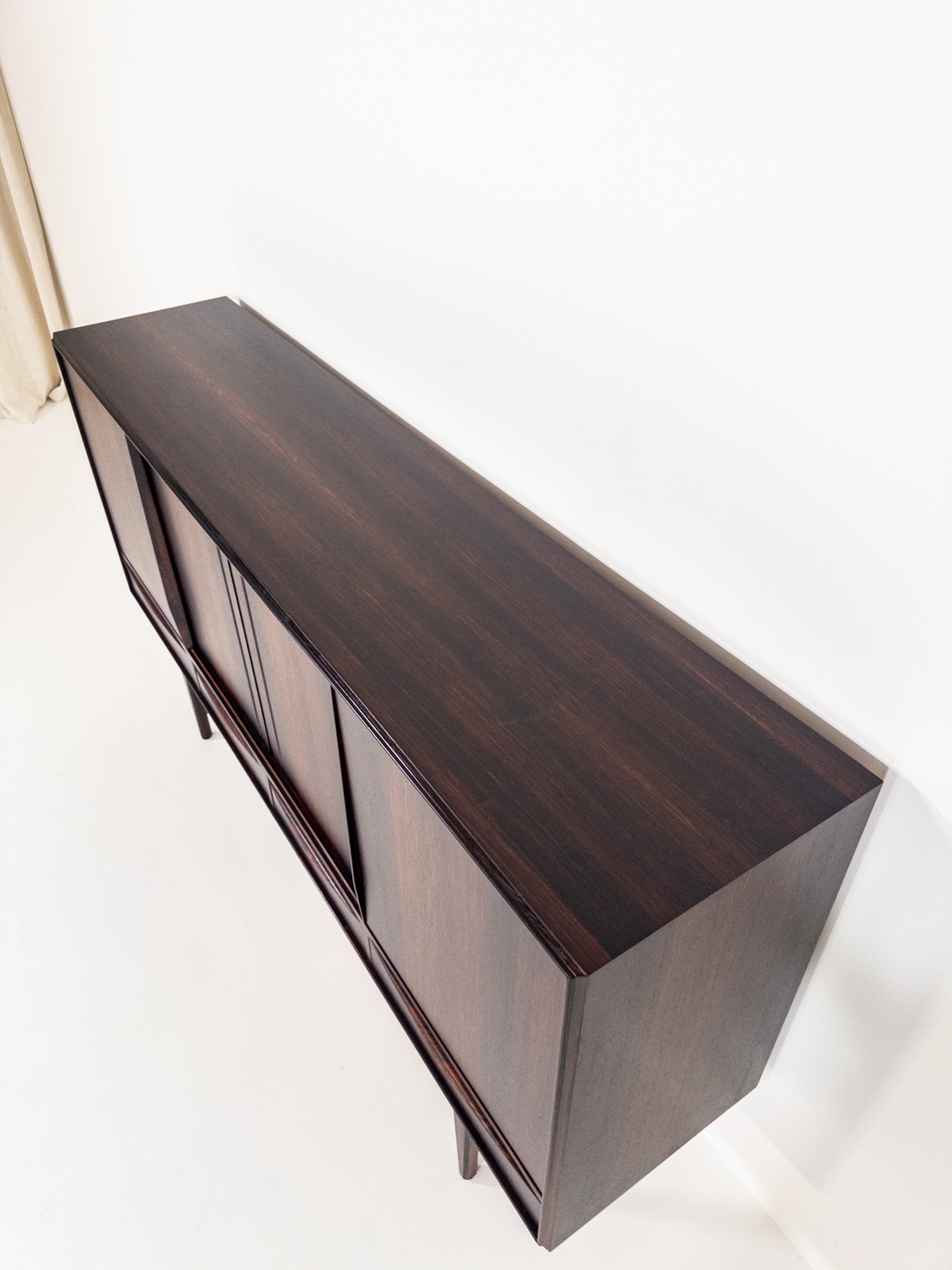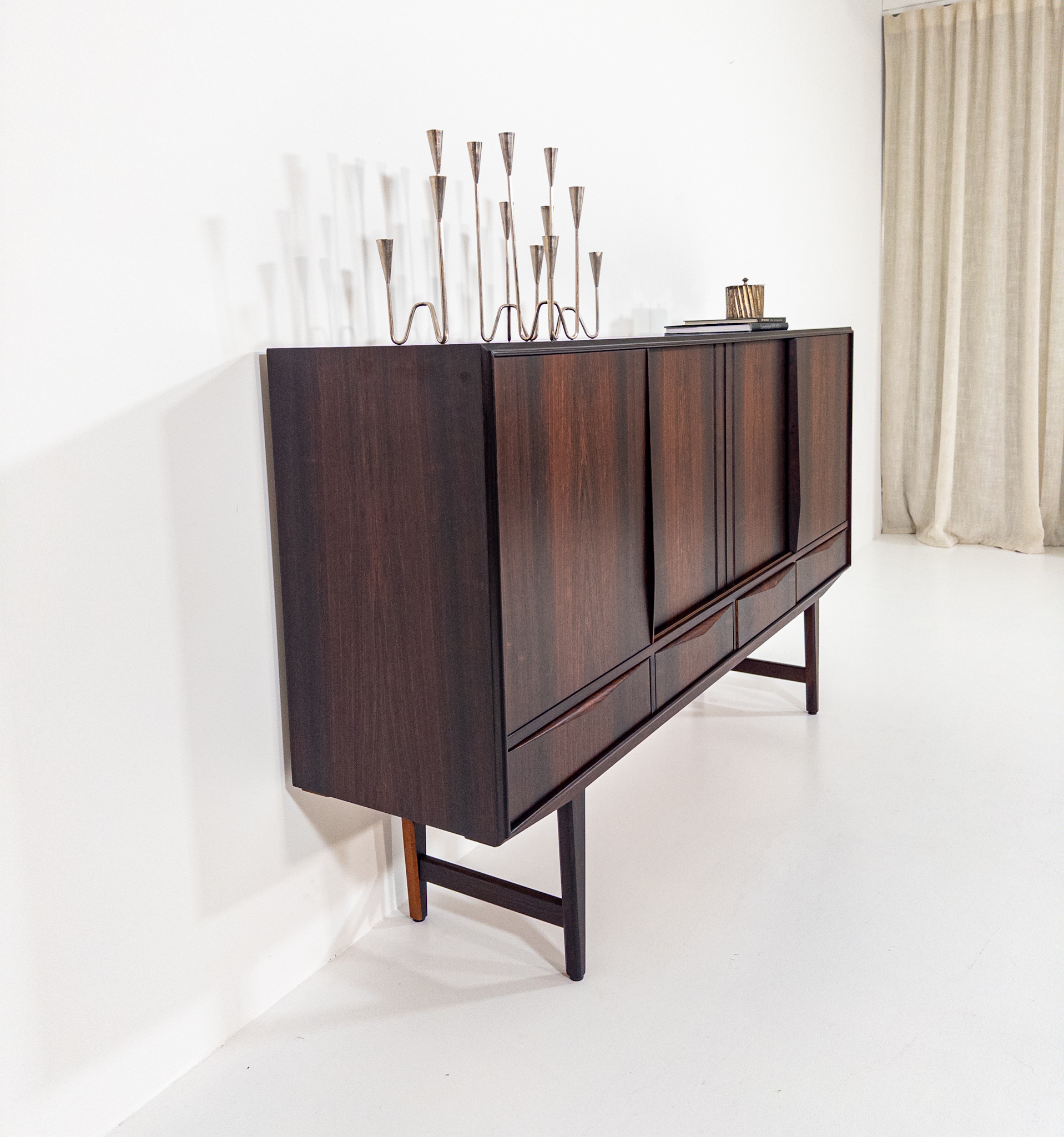 Ett riktigt vackert danskt sideboard i exklusiv Santos Rosewood (jakaranda), formgivet av EW Bach under 1960-talet. Elegant och välbalanserad modell med rena linjer, slanka ben och fantastisk ådring i träet som ger ett varmt och levande uttryck.