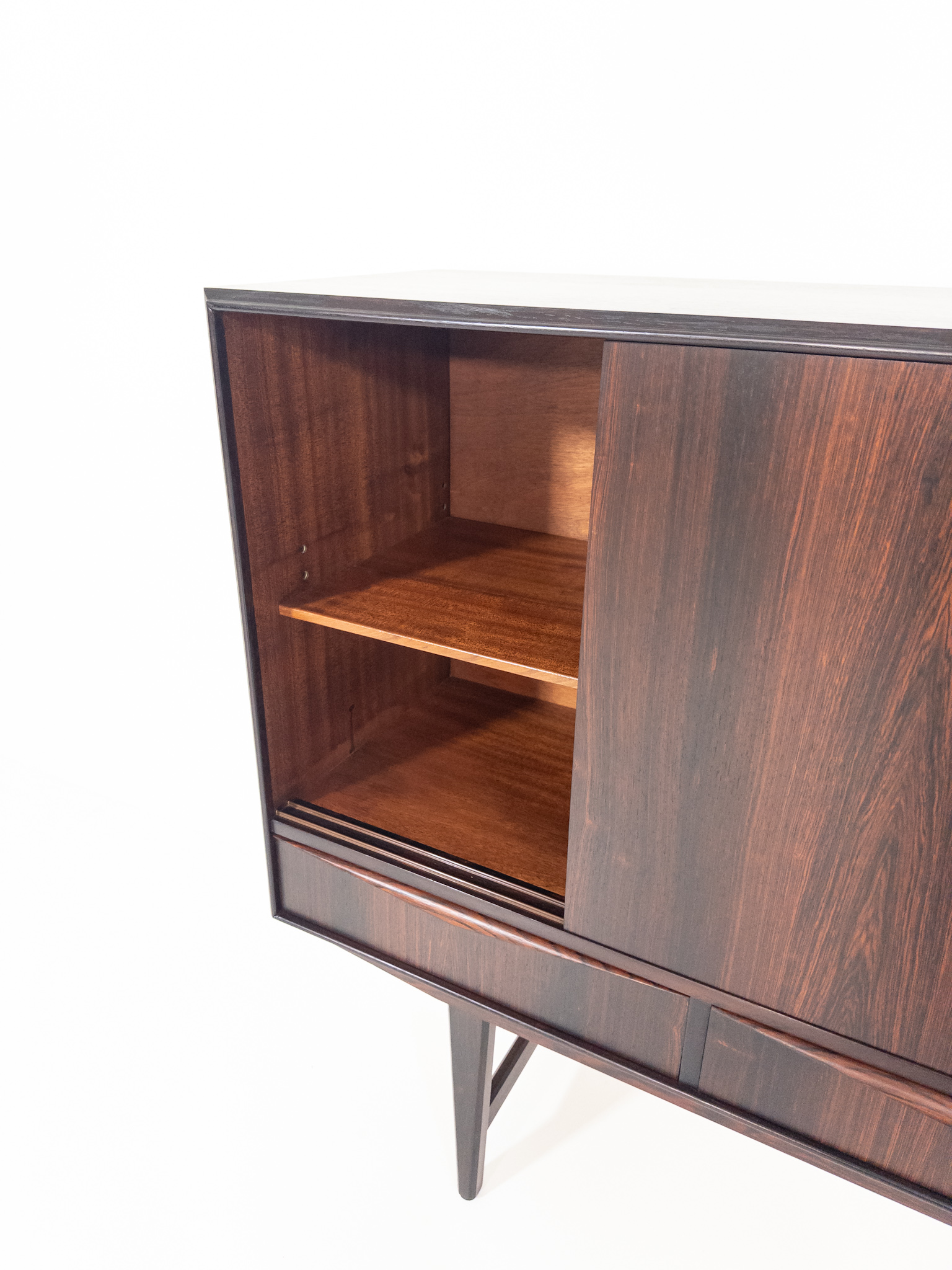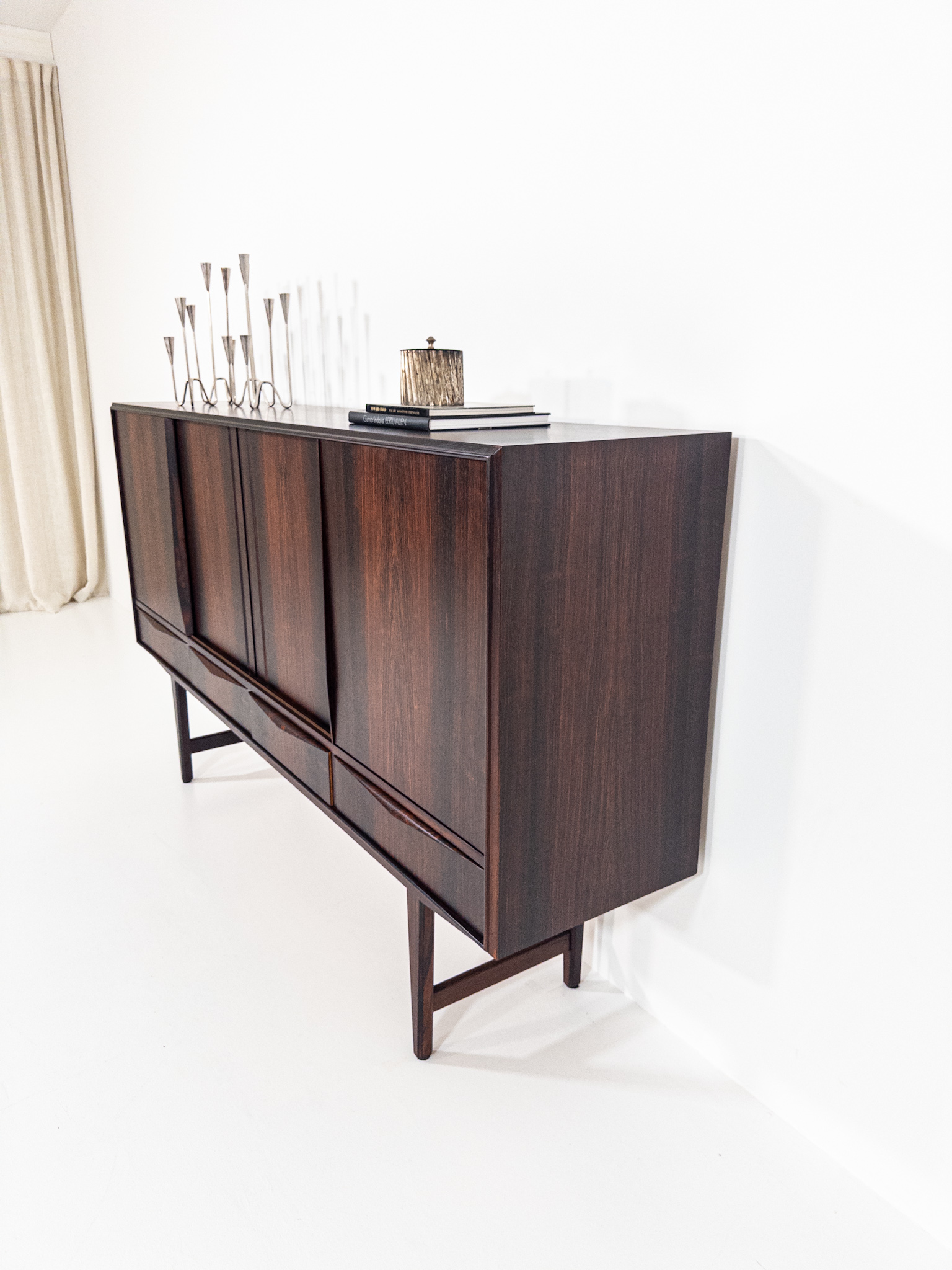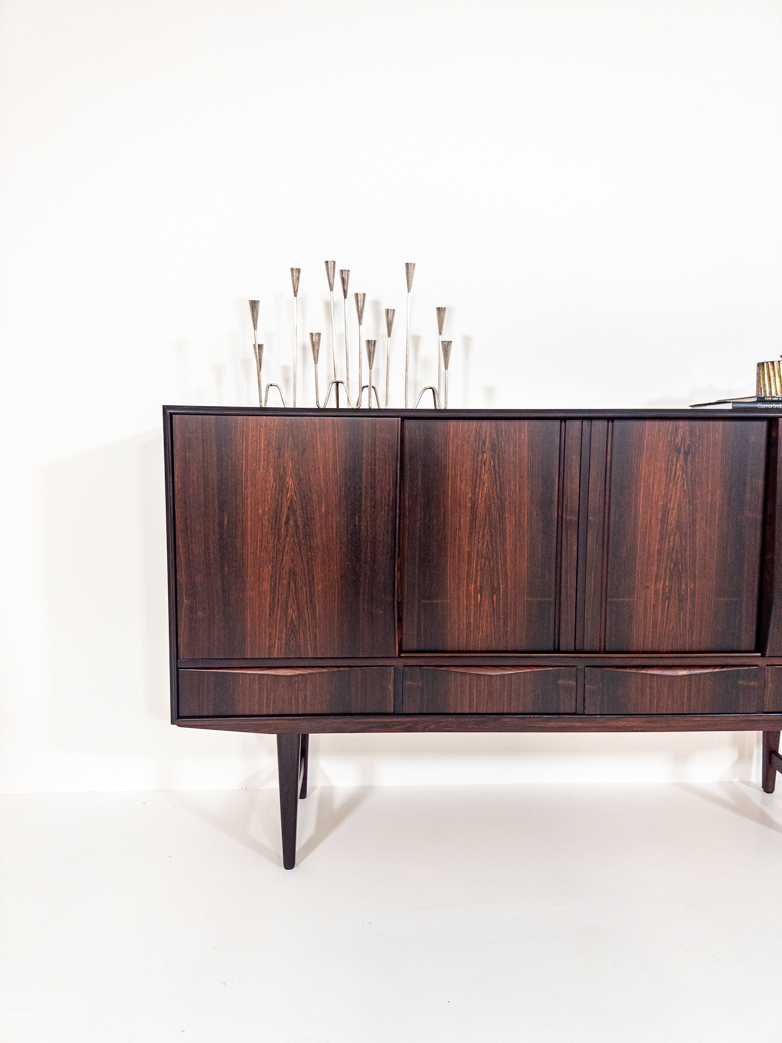 Ett riktigt vackert danskt sideboard i exklusiv Santos Rosewood (jakaranda), formgivet av EW Bach under 1960-talet. Elegant och välbalanserad modell med rena linjer, slanka ben och fantastisk ådring i träet som ger ett varmt och levande uttryck.