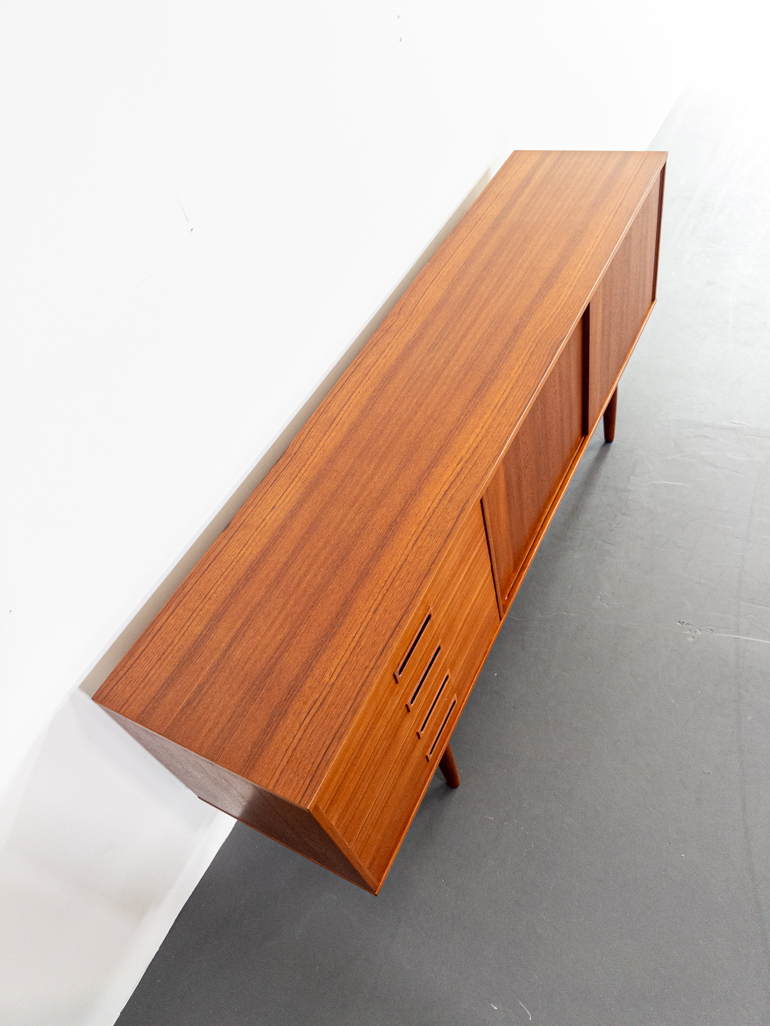 Elegant sideboard i teak från 60-talet, troligen svenskt, med en tidlös och stilren design. Möbeln är professionellt restaurerad och i ett mycket fint vintageskick – redo att bli en central och funktionell del av ditt hem.