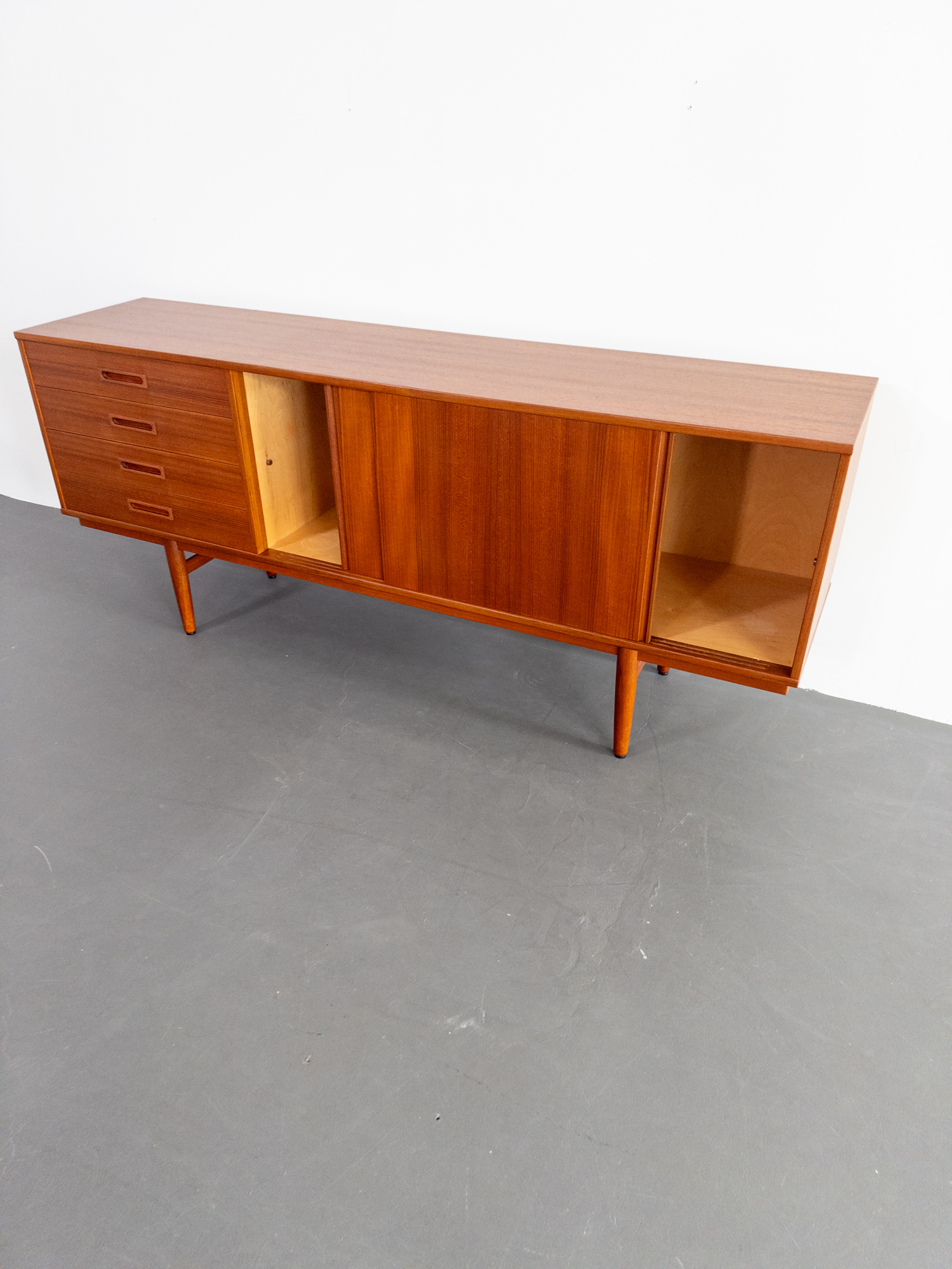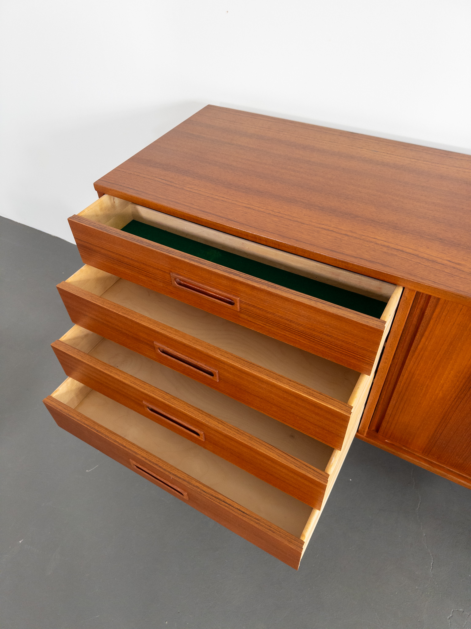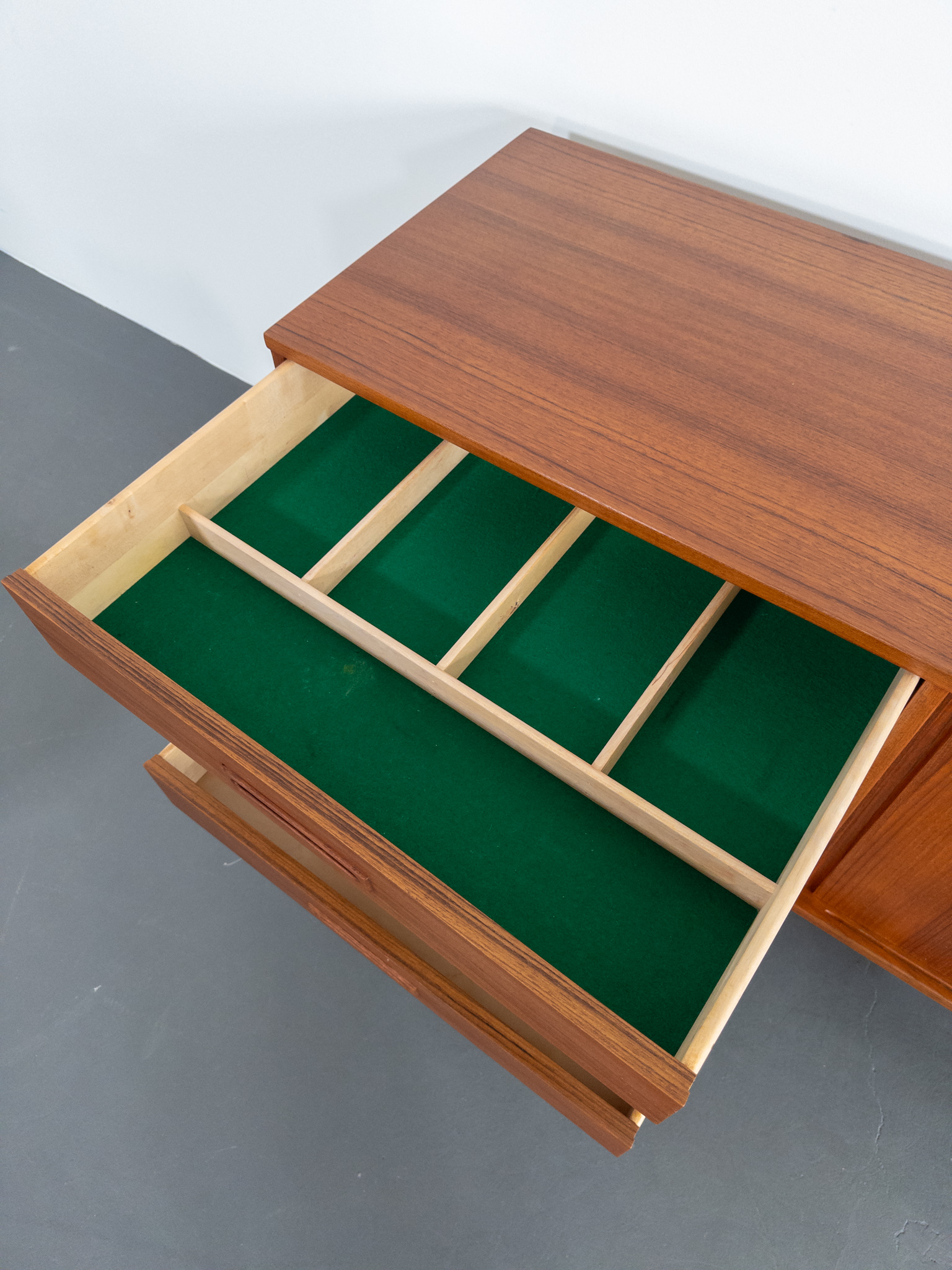 Sideboardet har praktiska skjutluckor som döljer två rymliga skåp, båda med hyllplan, samt fyra lådor varav översta med grön filt och fackindelning för bestick eller småförvaring. Perfekt kombination av stil och funktion.