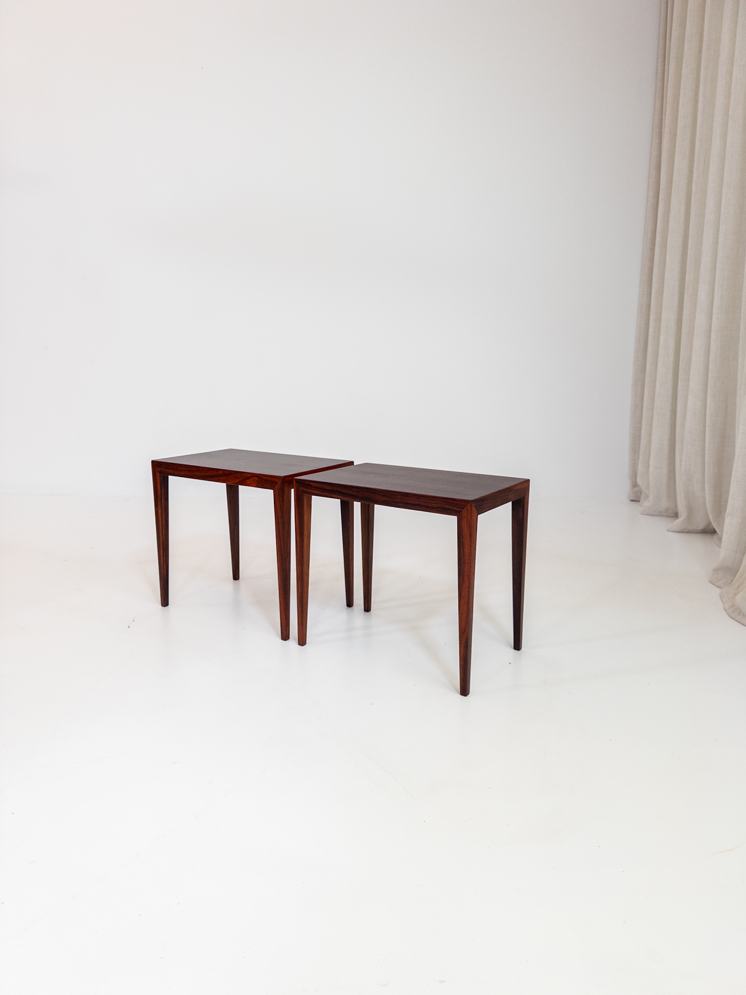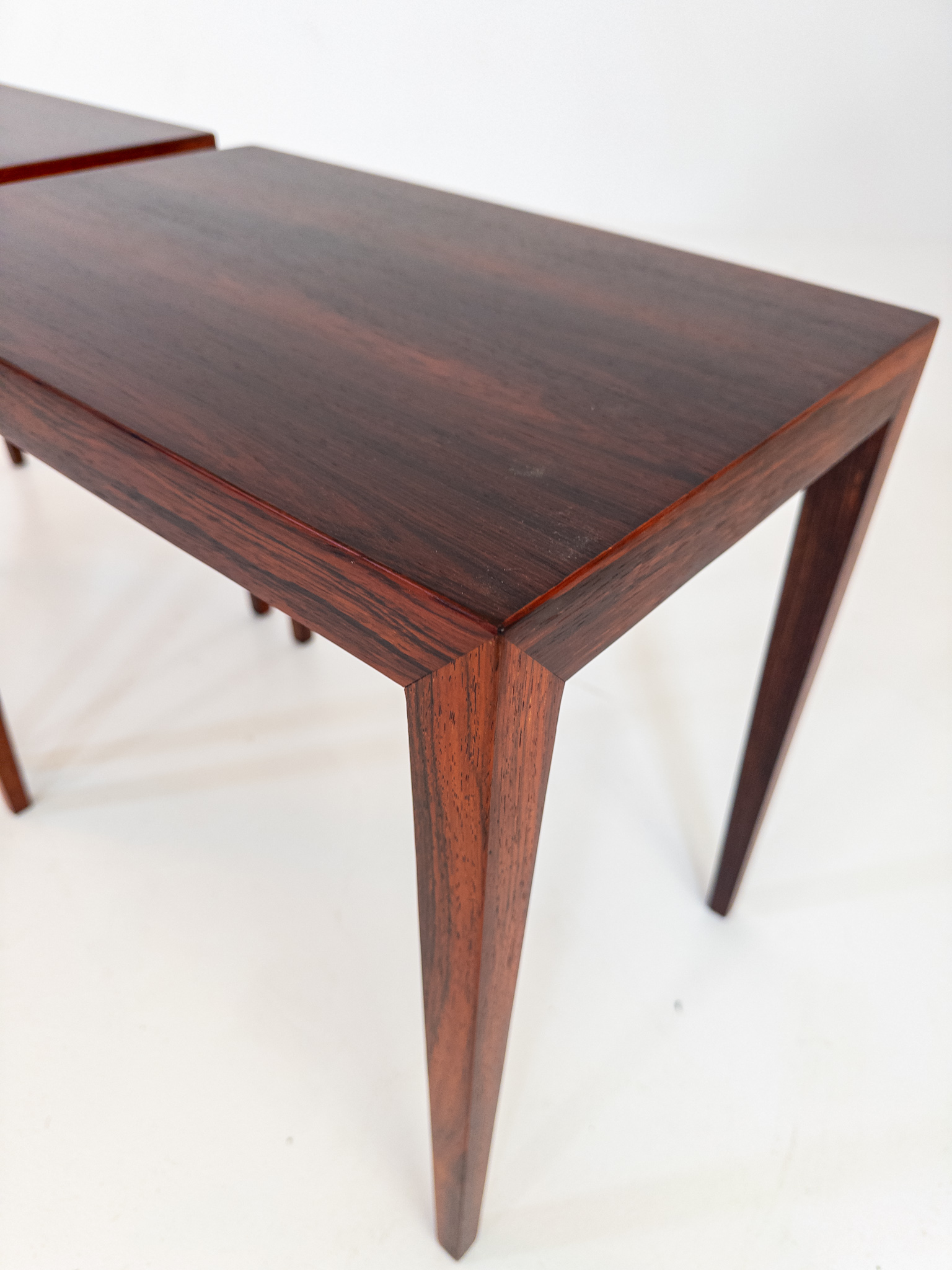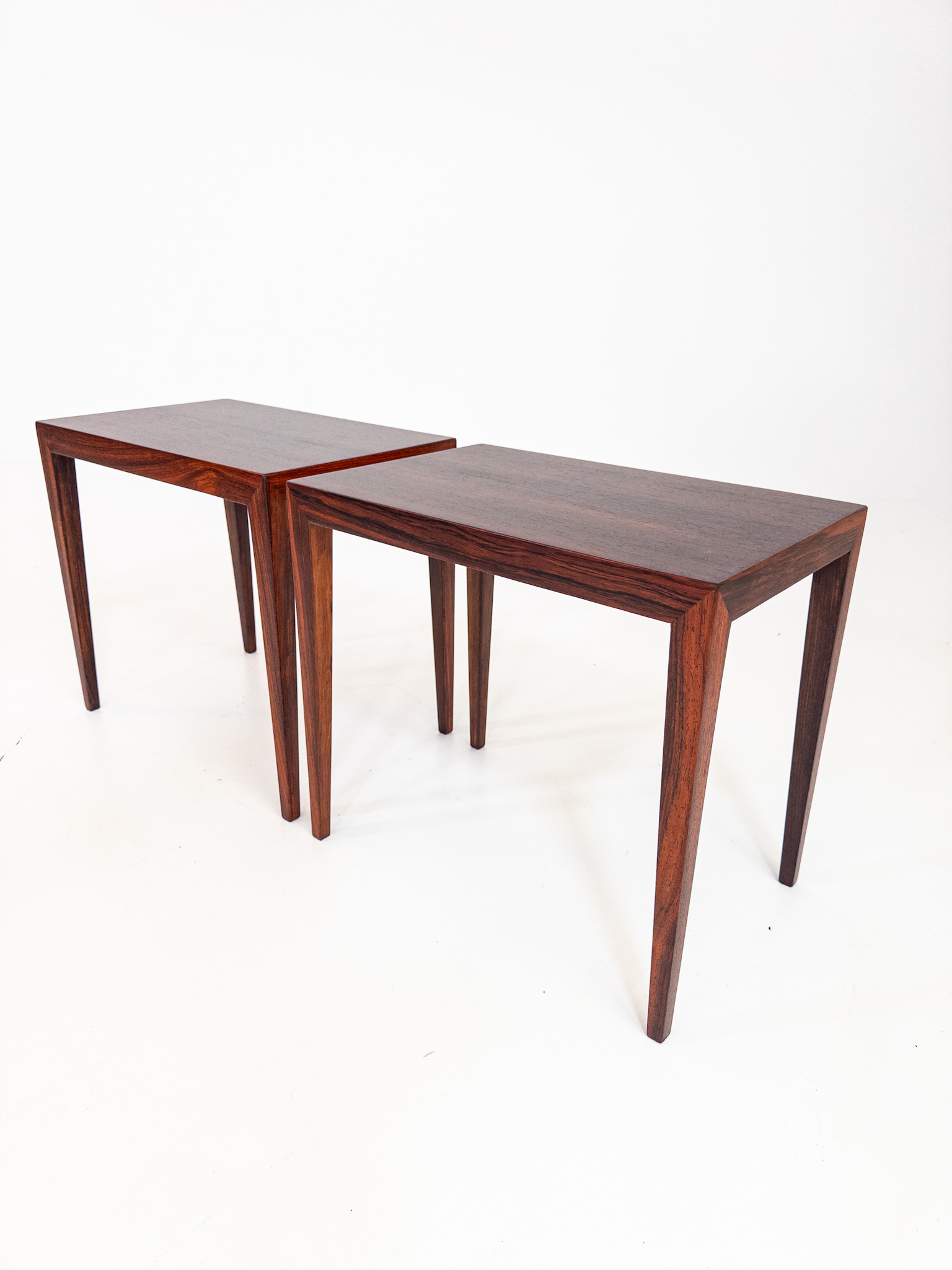 Ett elegant par mindre bord formgivna av Severin Hansen i Danmark under 1960-talet. Den klassiska danska designen syns tydligt i de slanka proportionerna, de fint avsmalnande benen och den vackra faneren.