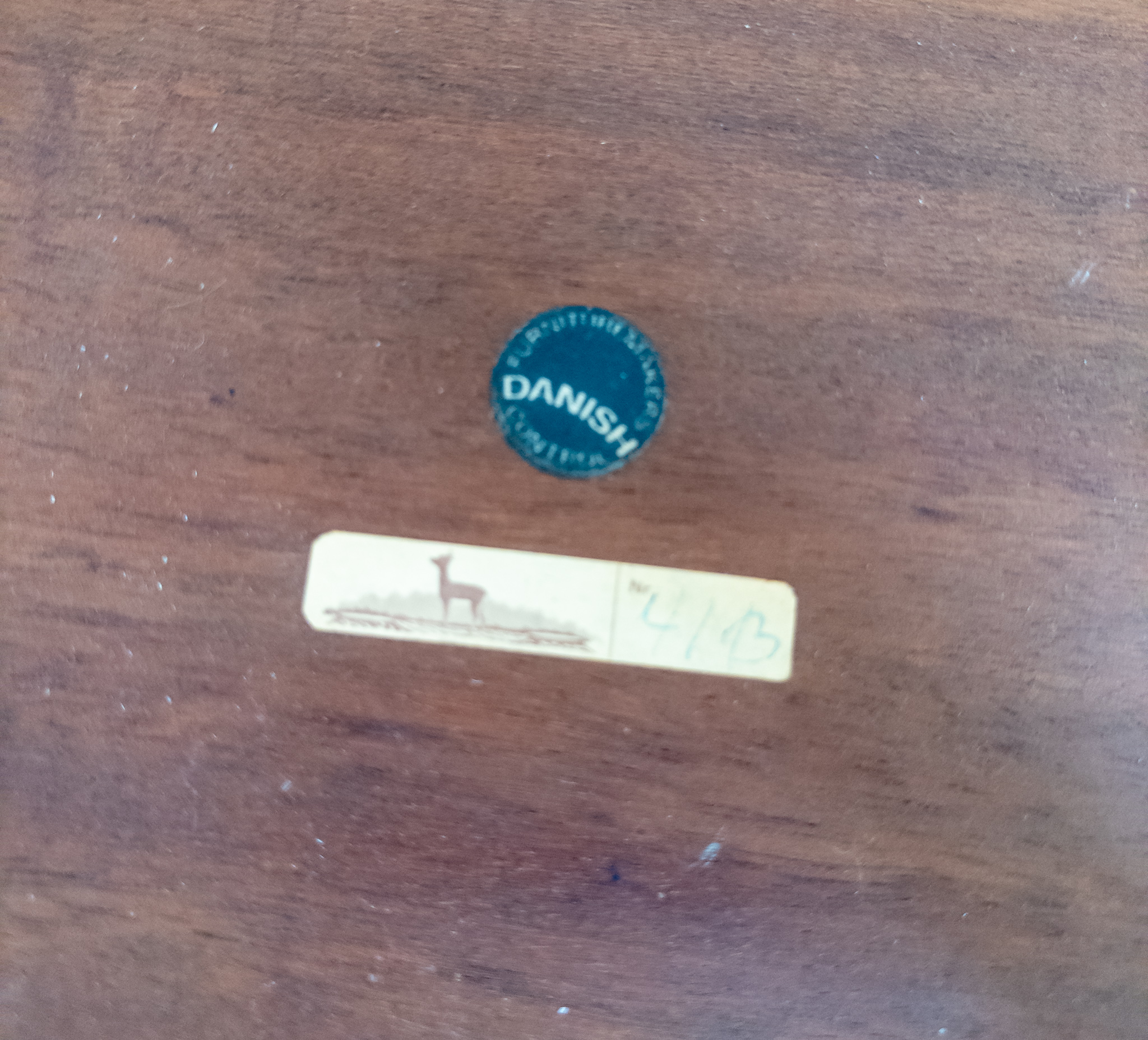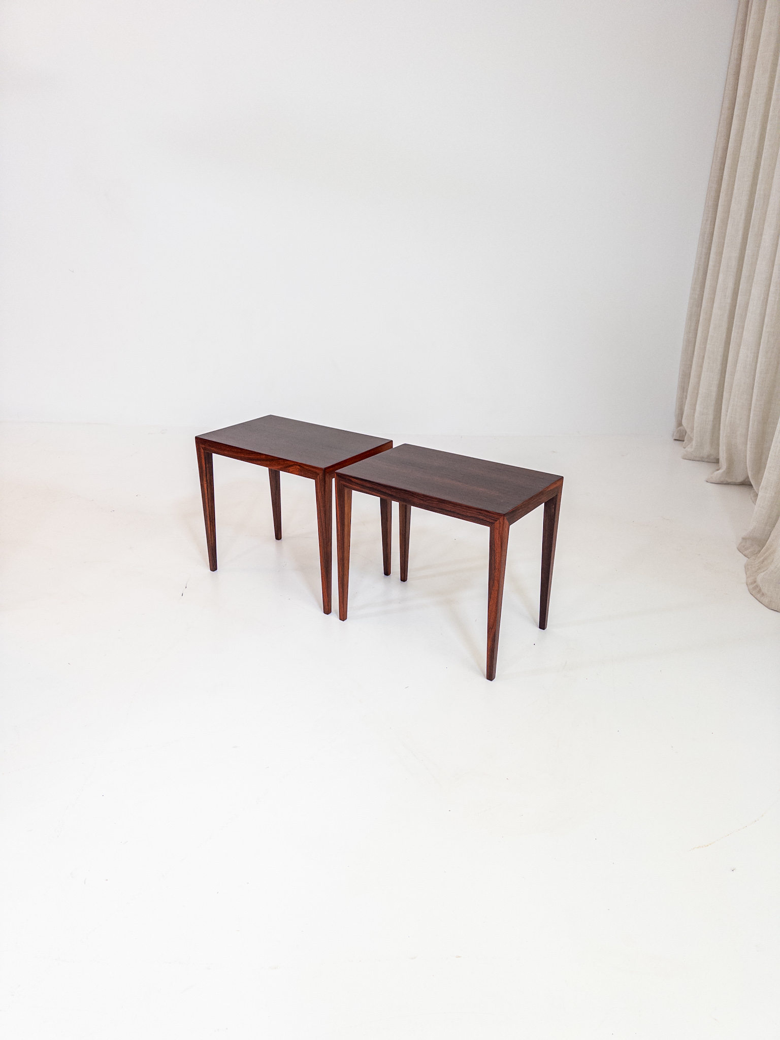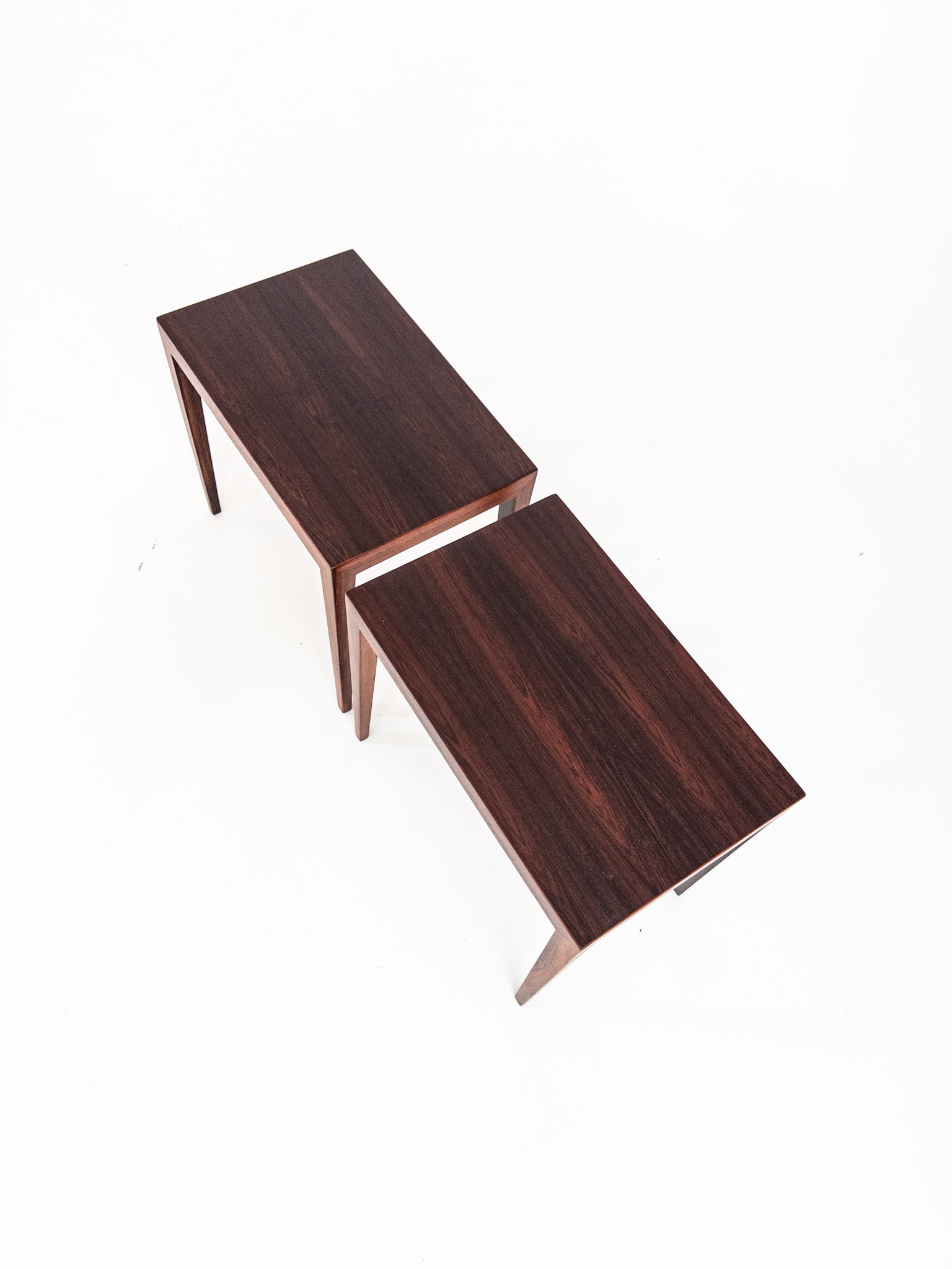 Ett elegant par mindre bord formgivna av Severin Hansen i Danmark under 1960-talet. Den klassiska danska designen syns tydligt i de slanka proportionerna, de fint avsmalnande benen och den vackra faneren.