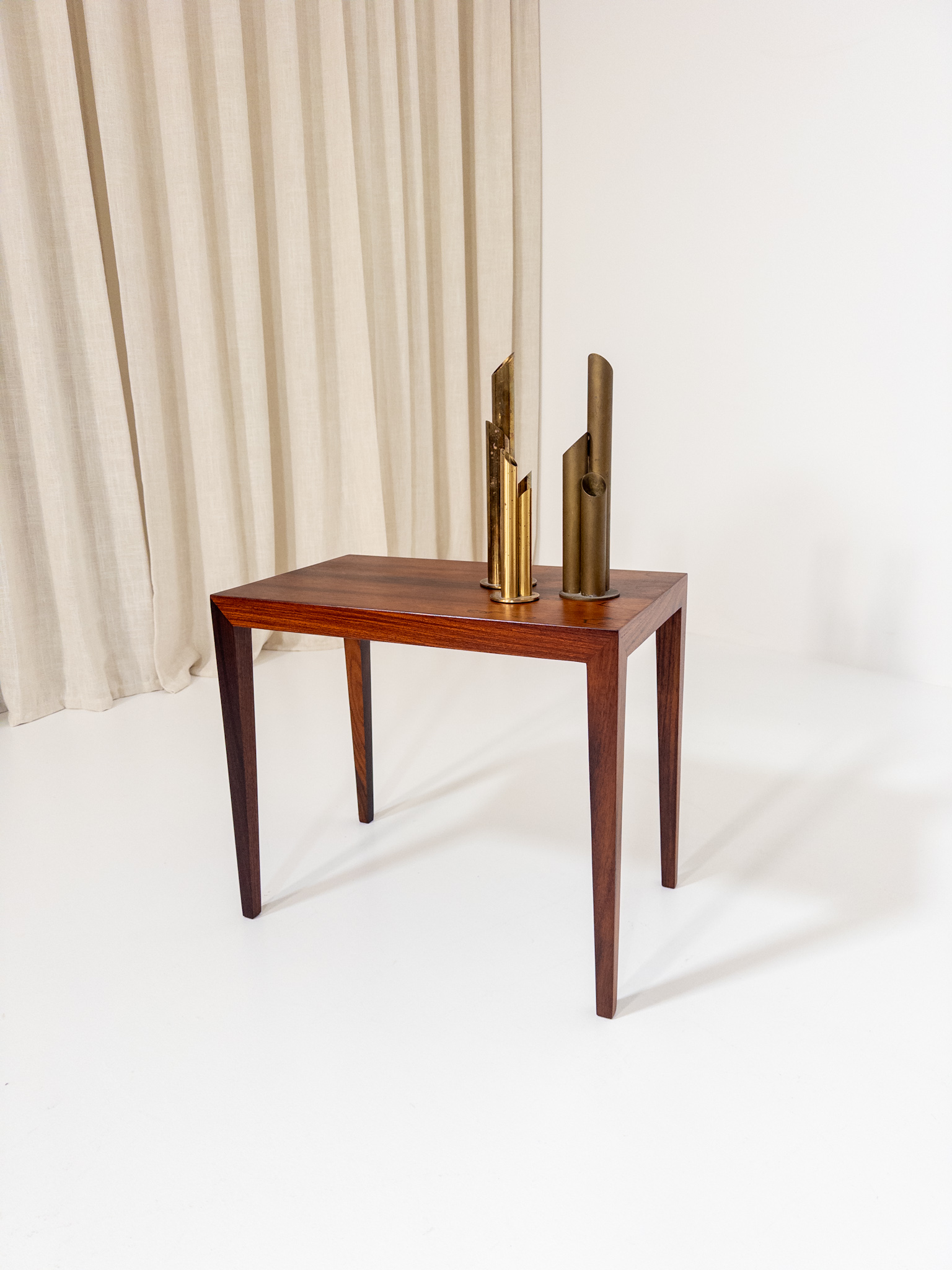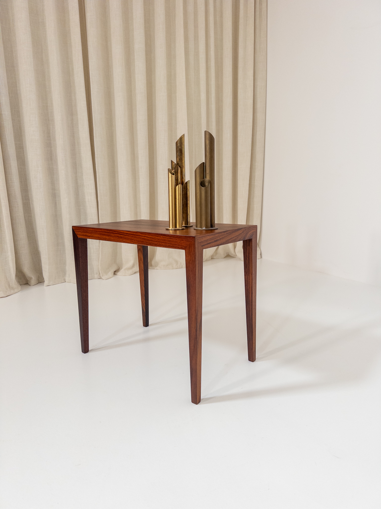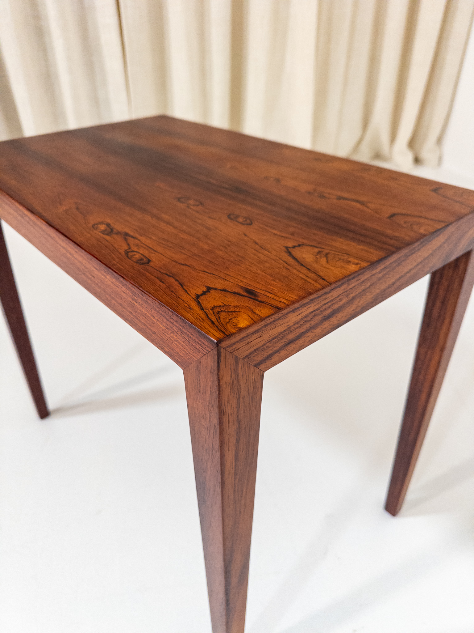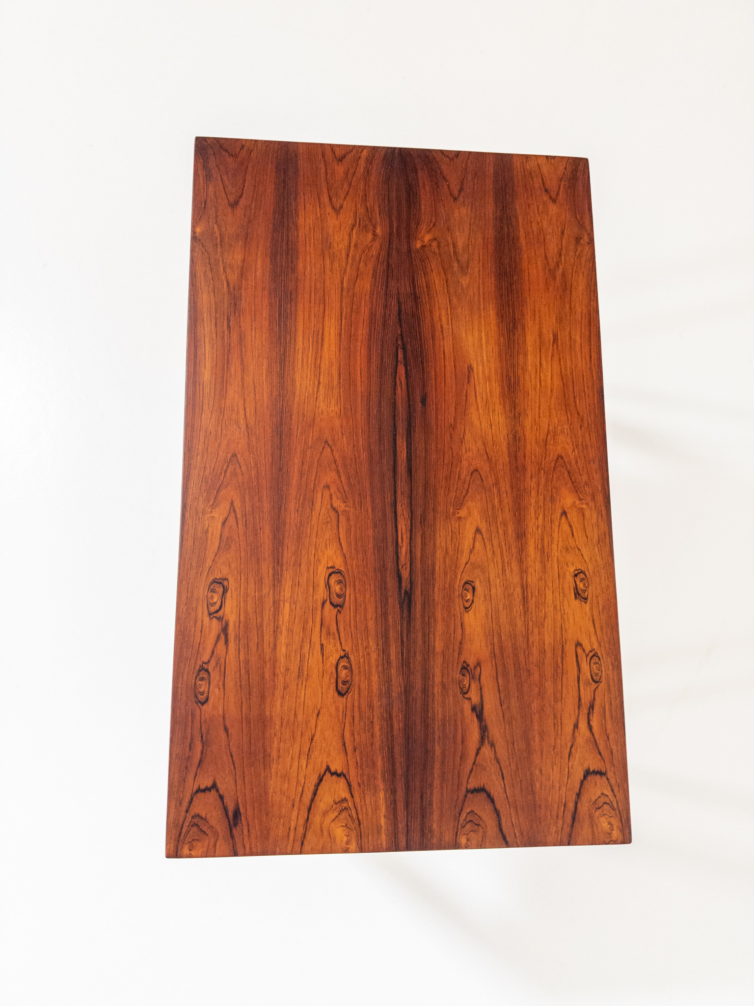 Elegant och tidstypiskt sidobord formgivet av Severin Hansen under 1960-talet. Tillverkat i vackert Santos rosewood med ett levande ådringsspel och varm lyster. Den strama formen kombineras med fint avsmalnande ben och precisa hörn, typiskt för Hansens formspråk.