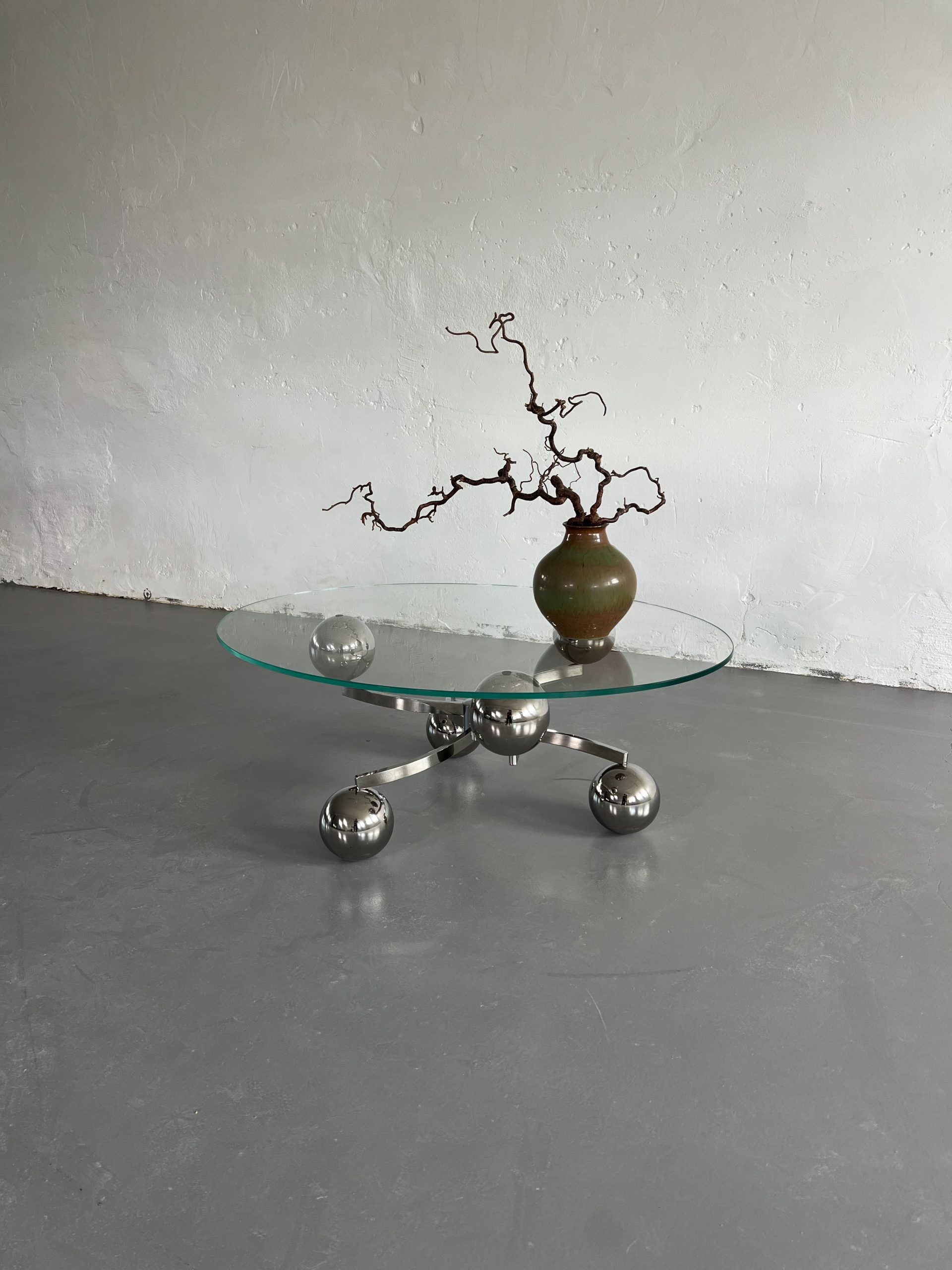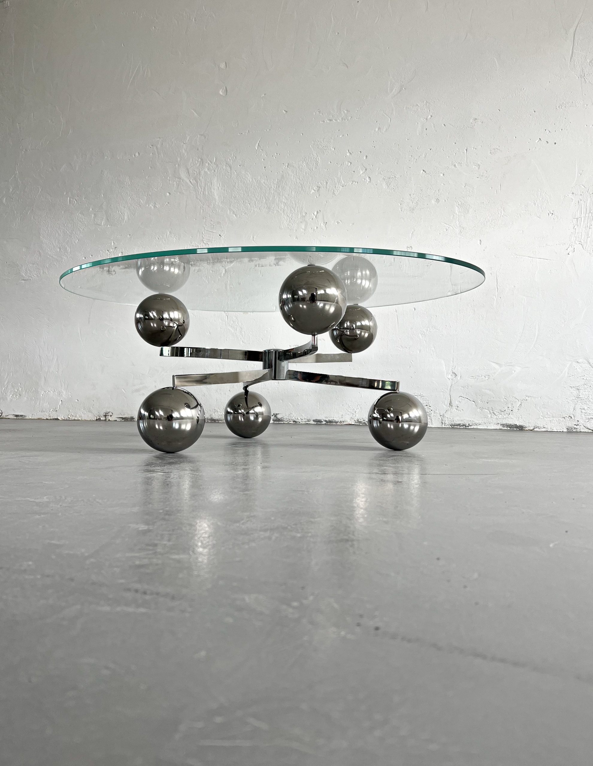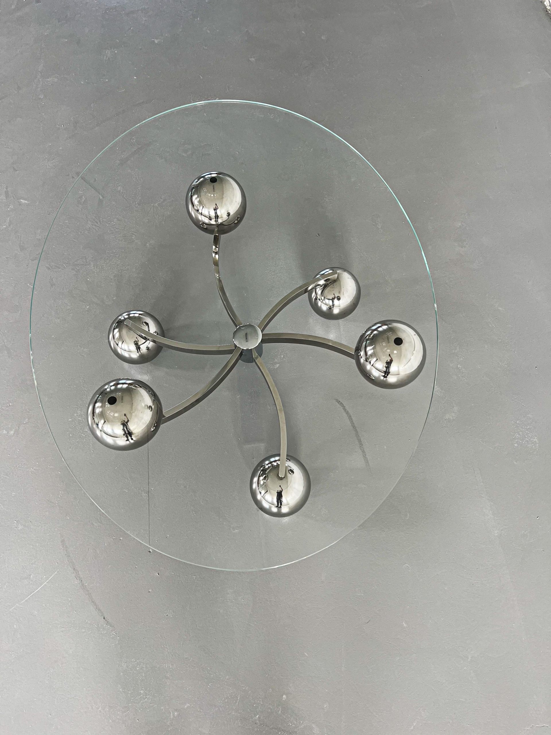 Kromat underrede med kulor och oval bordsskiva i glas