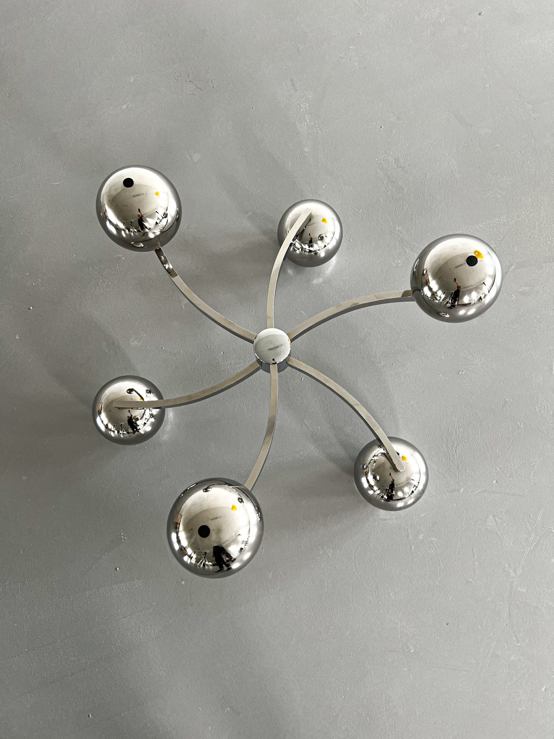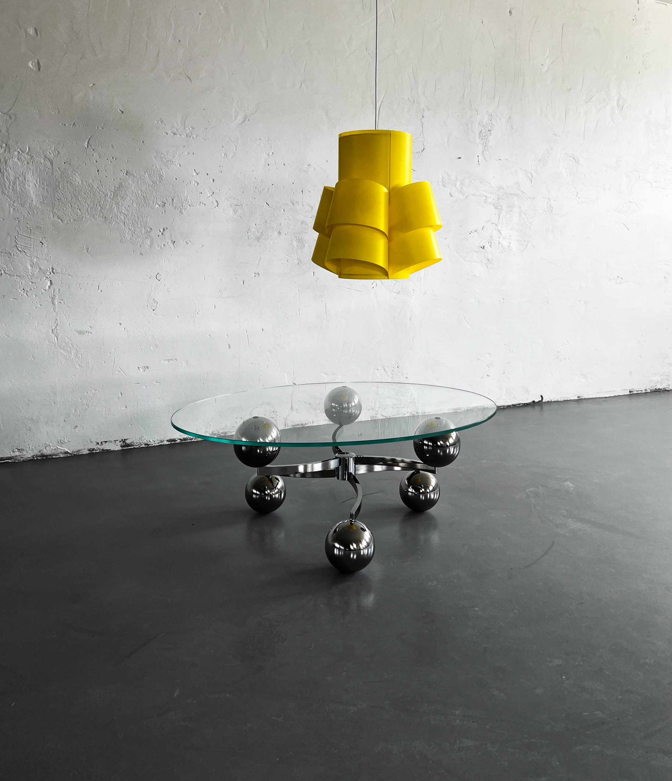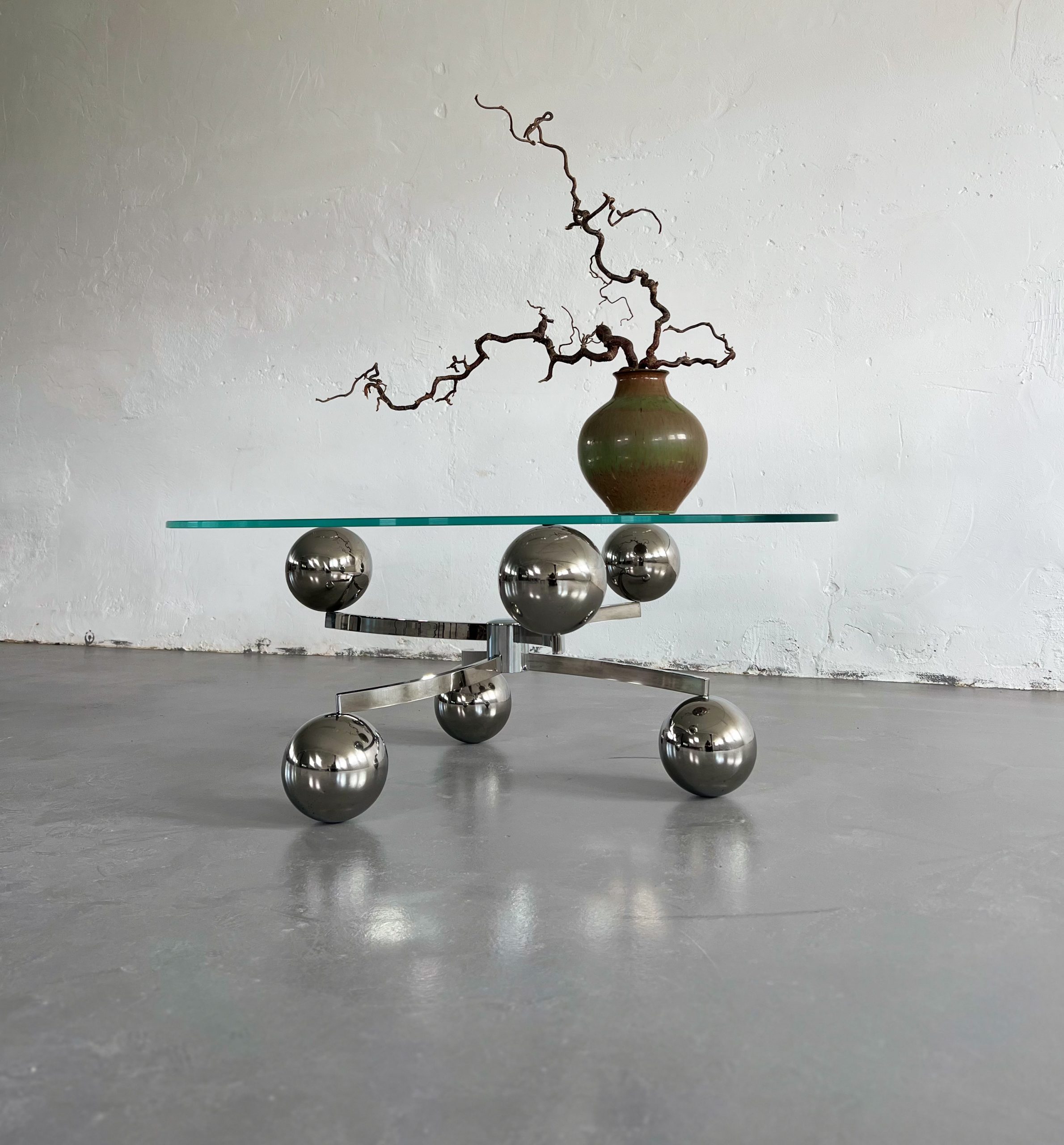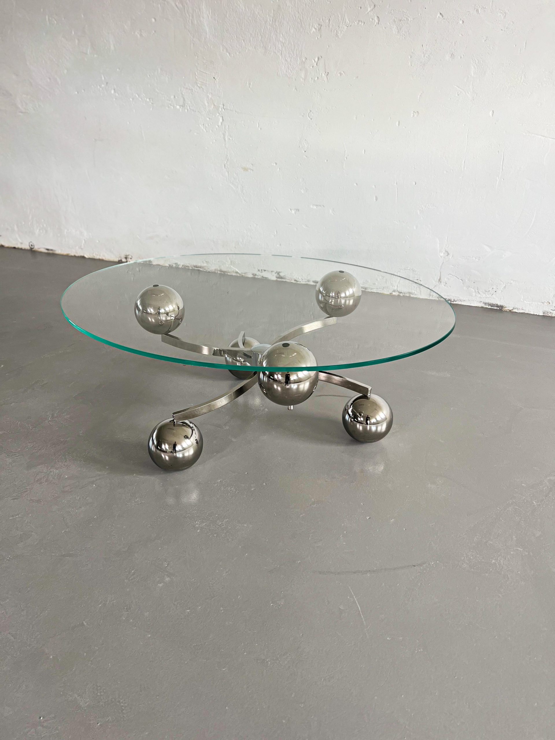 Kromat underrede med kulor och oval bordsskiva i glas