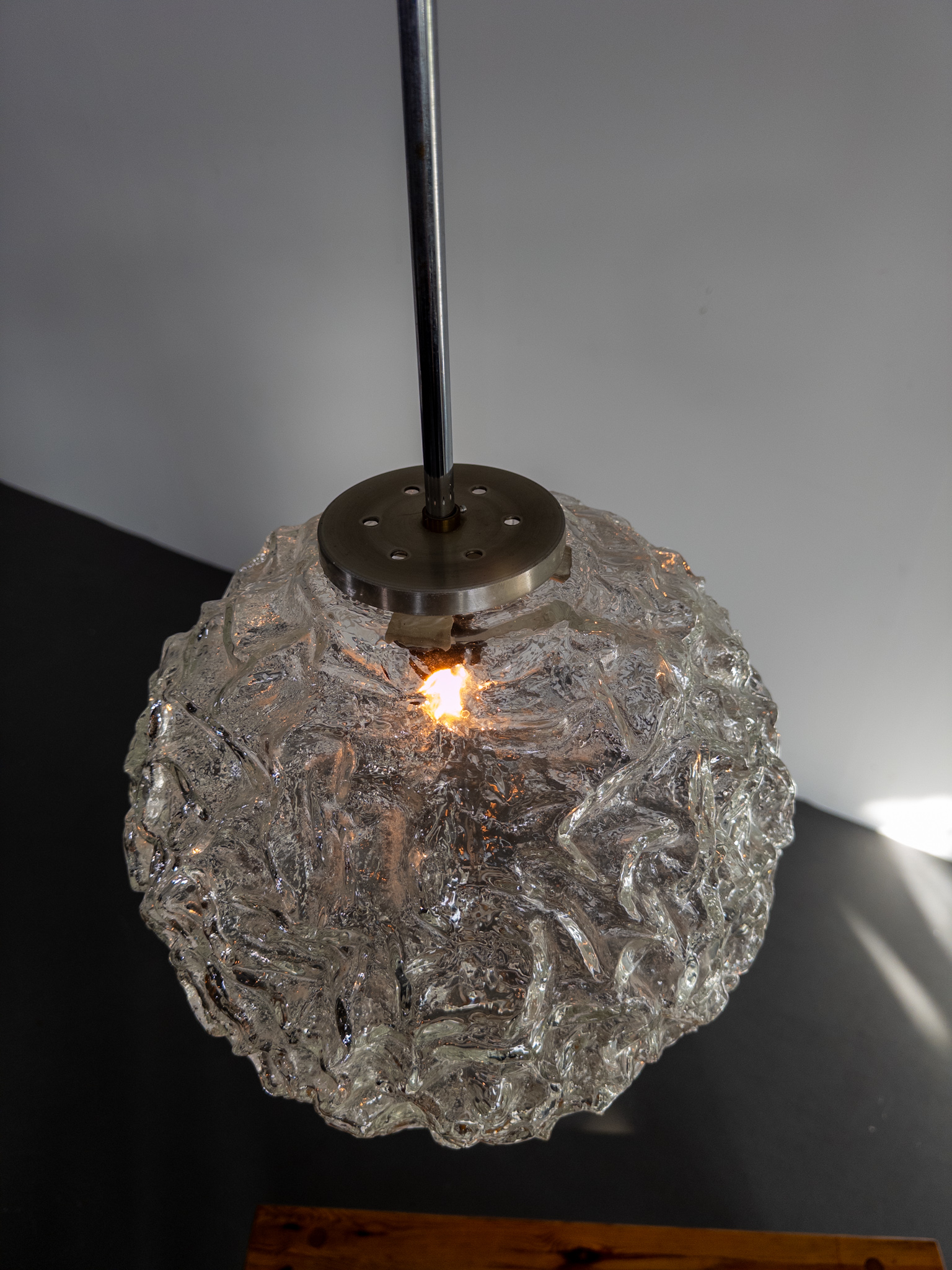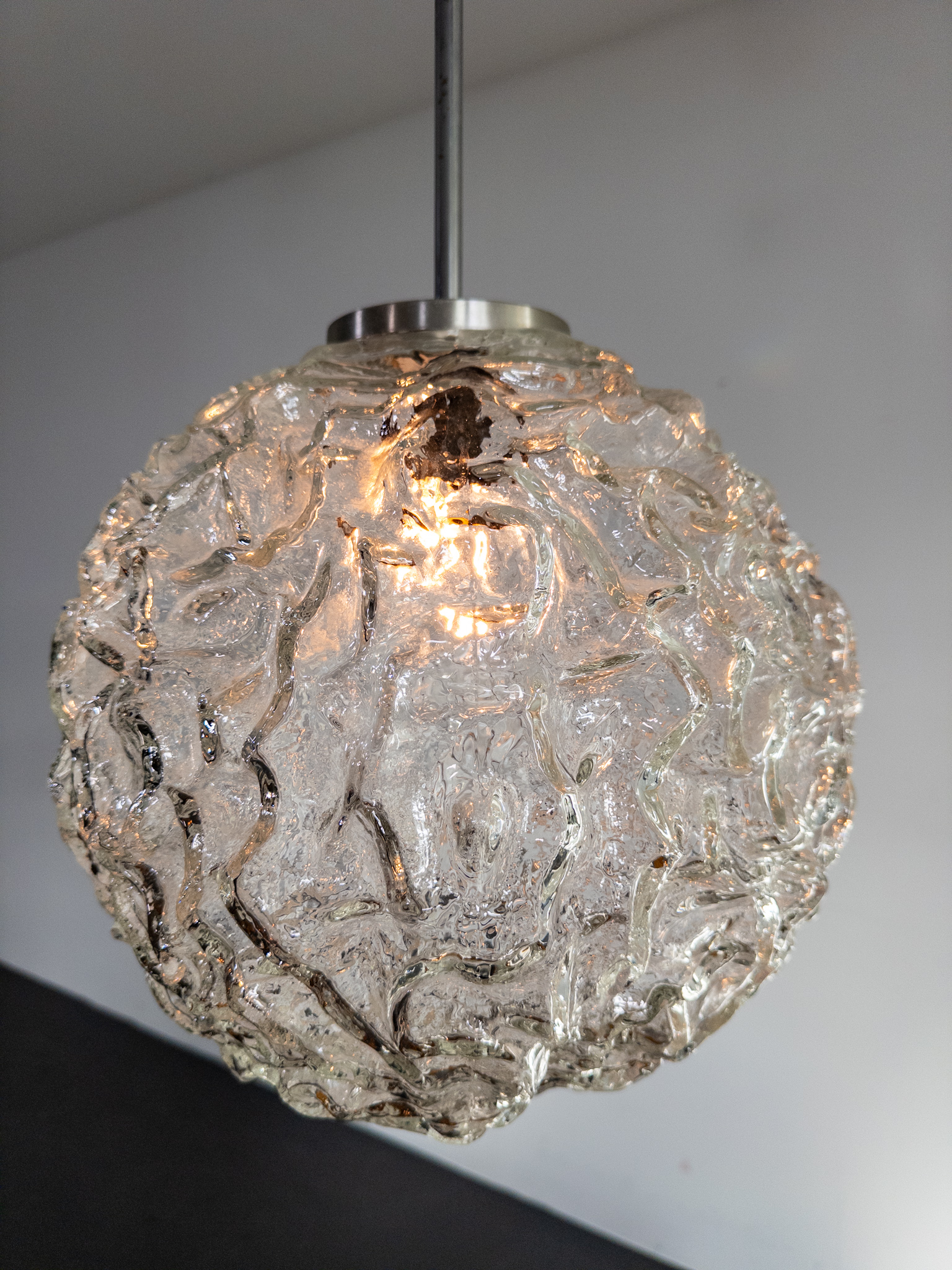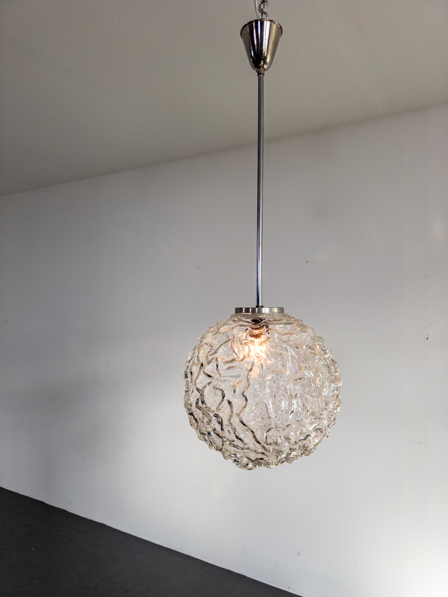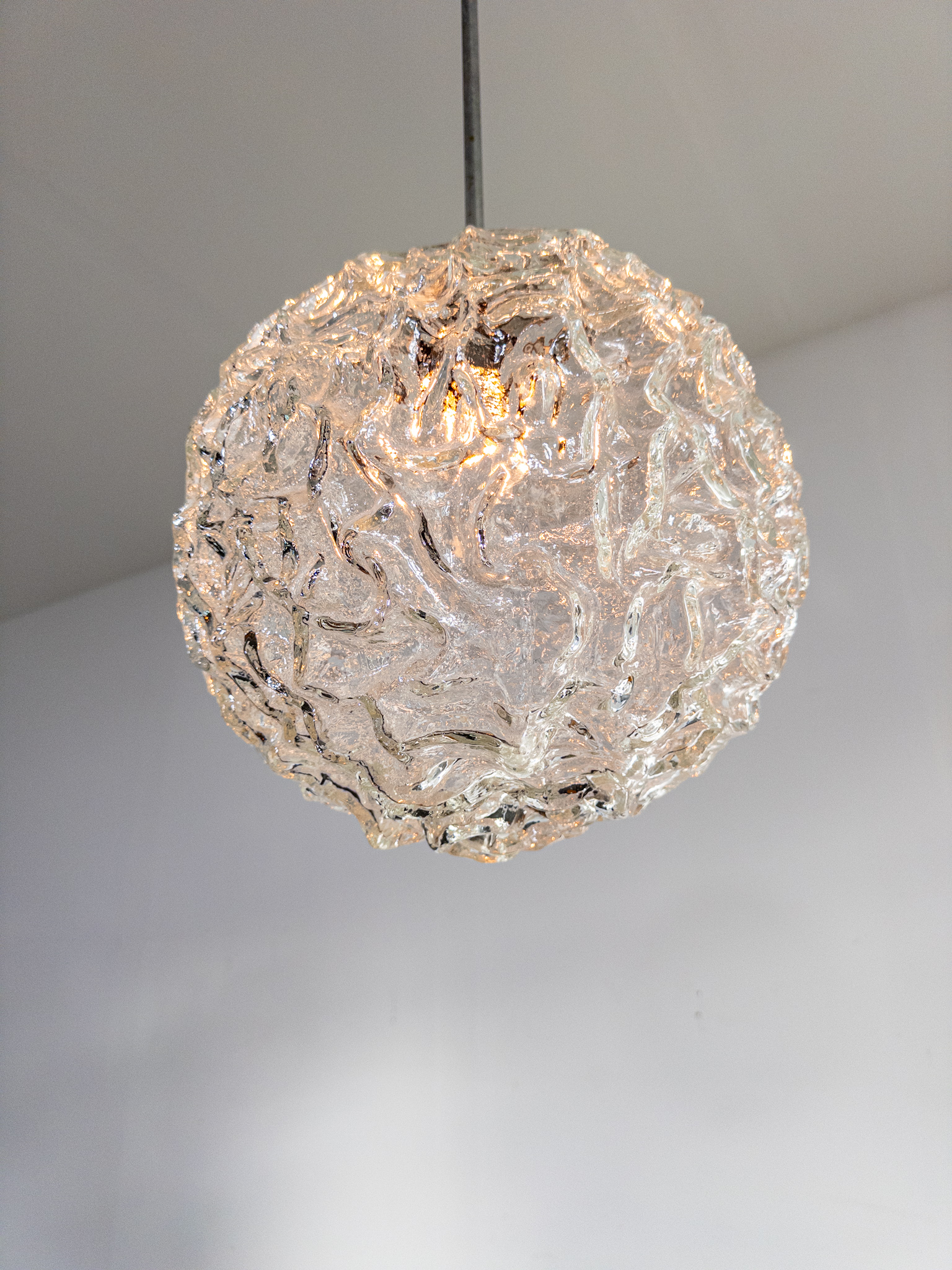 Elegant klotformad taklampa i pressat glas med vackert strukturerad yta som sprider ett levande sken. Formgiven och tillverkad vid Eriksmåla Glas under 1960-talet – ett fint exempel på tidens skandinaviska design.