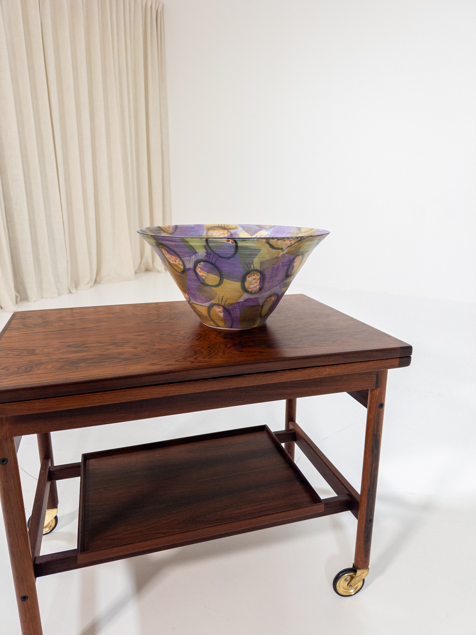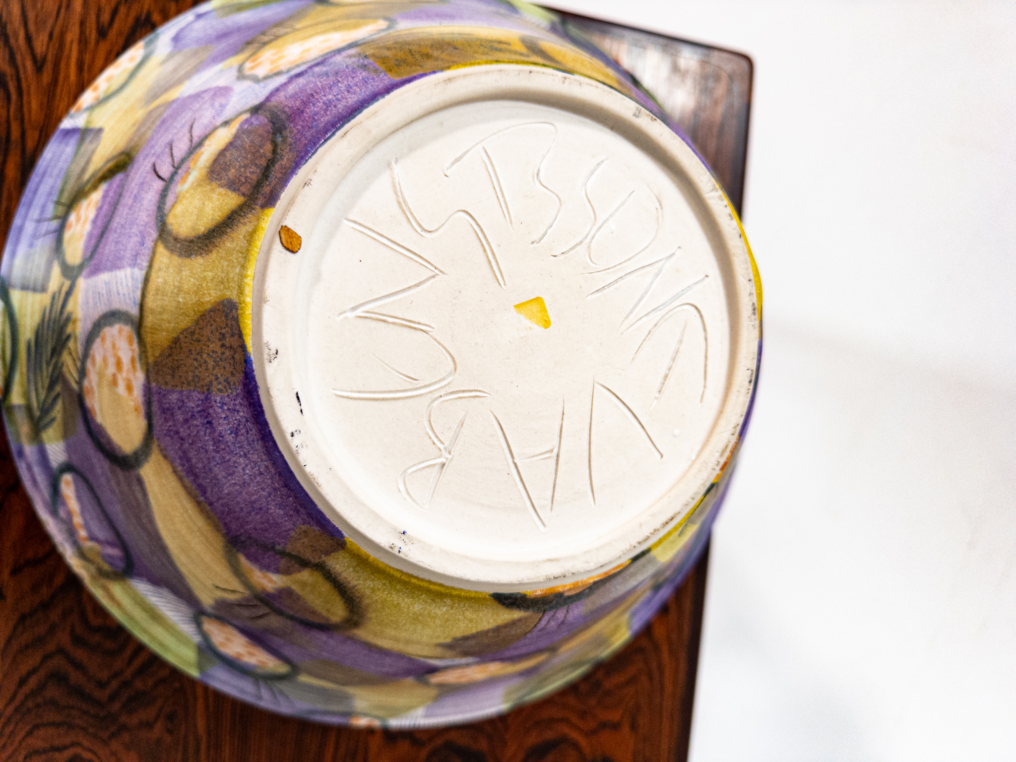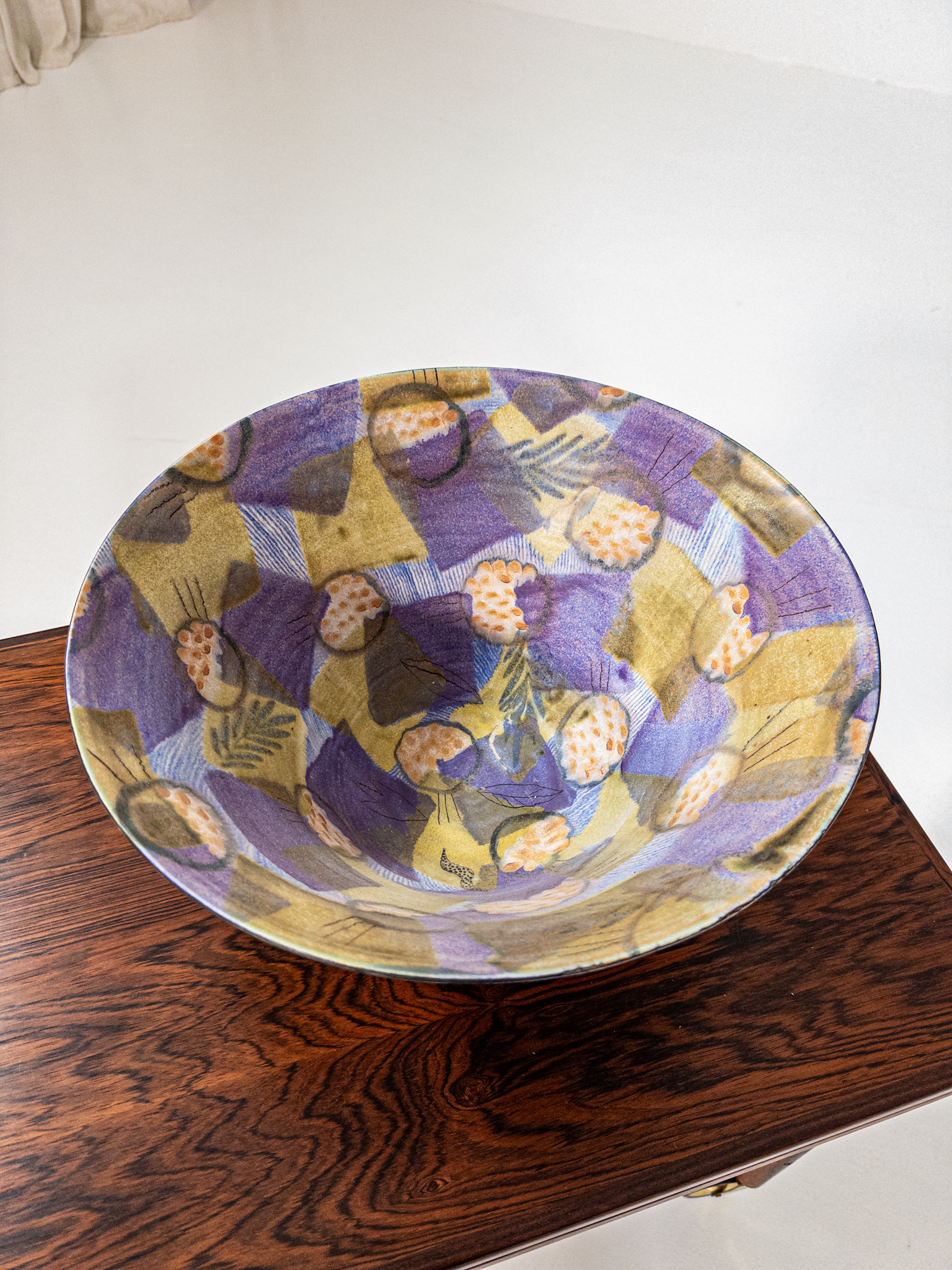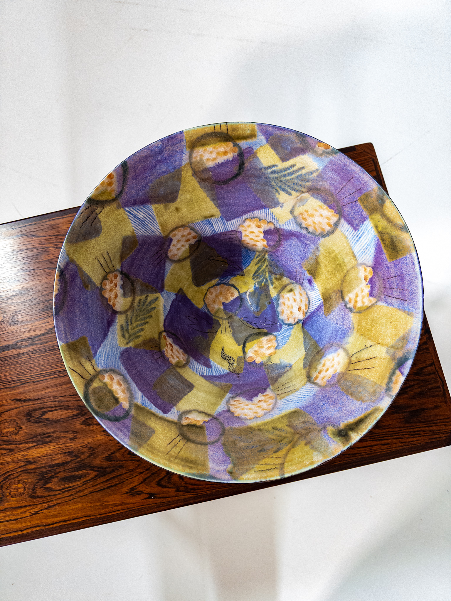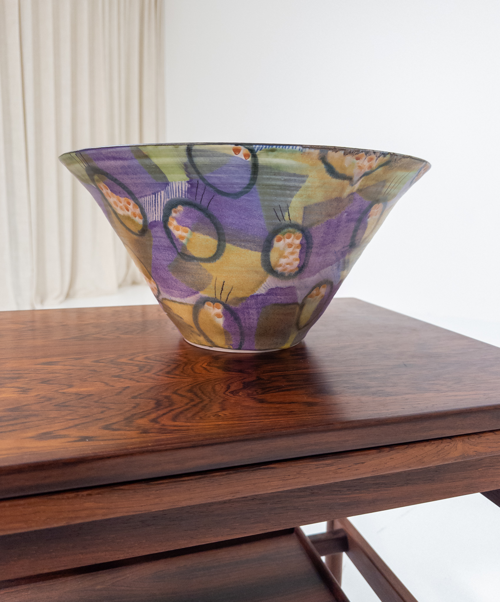 Skålen har ett levande handmålat mönster med grafiska former och organiska detaljer i lila, grönt och gult – ett uttryck som är typiskt för svenskt studiogods från perioden.