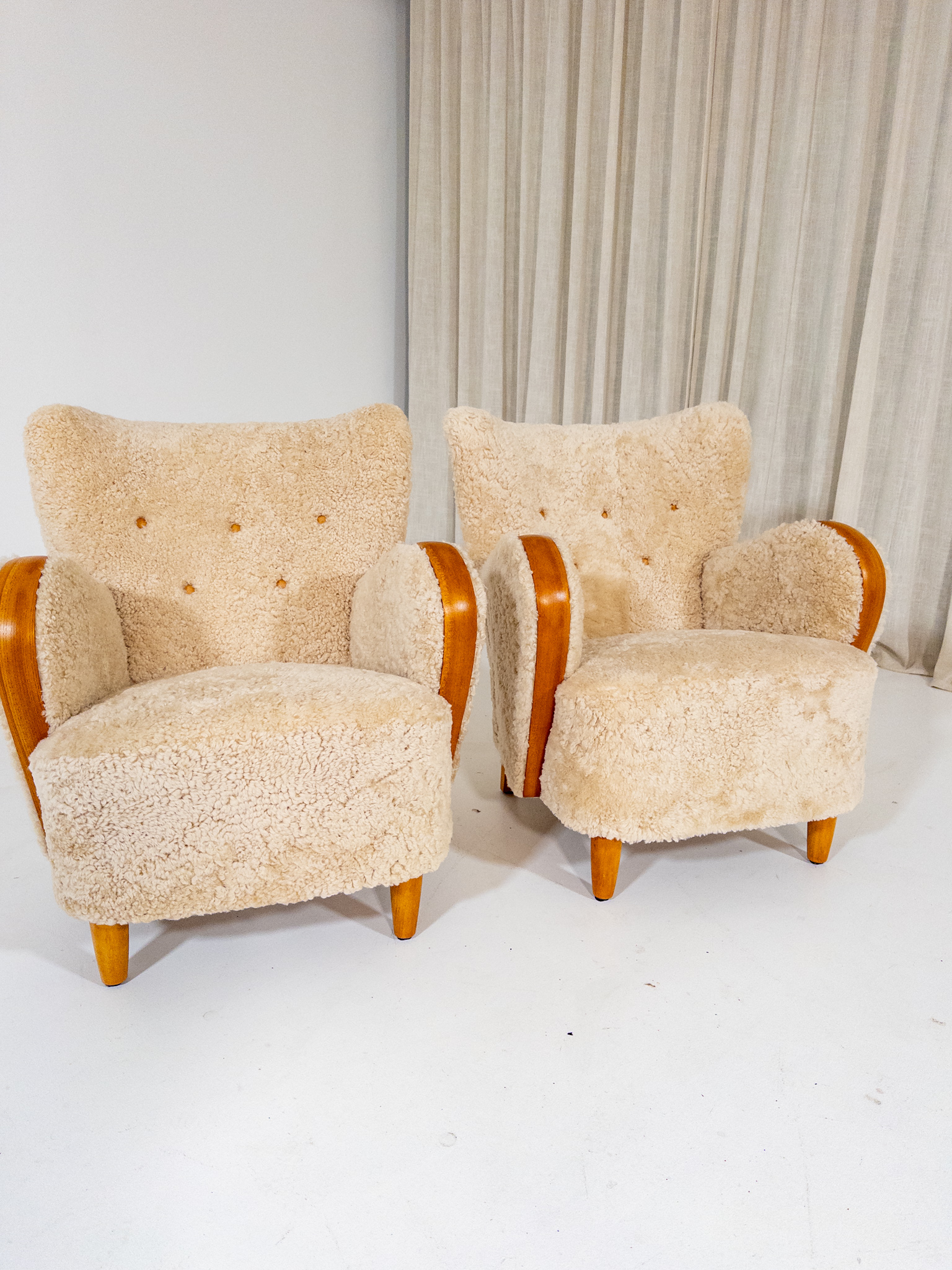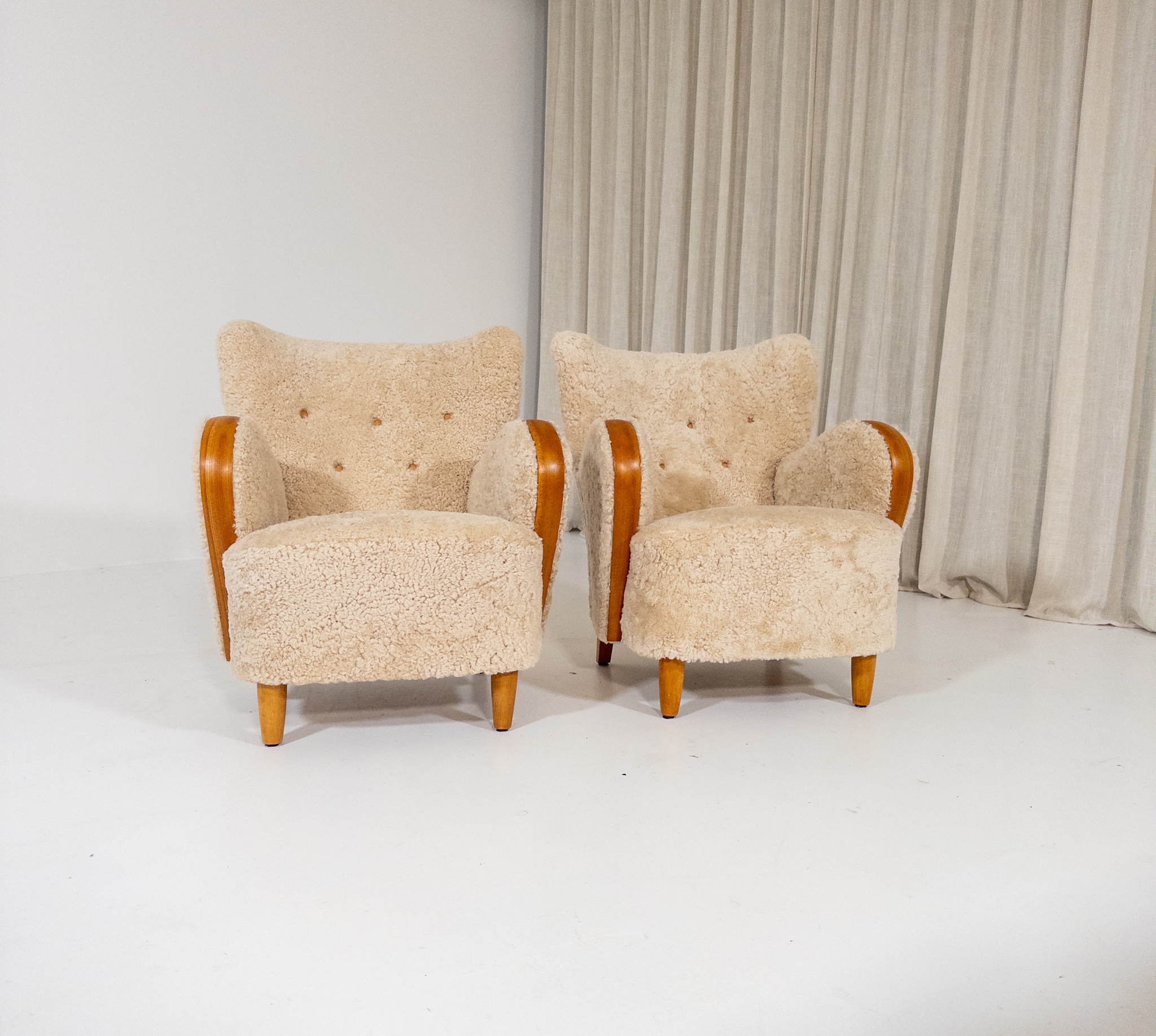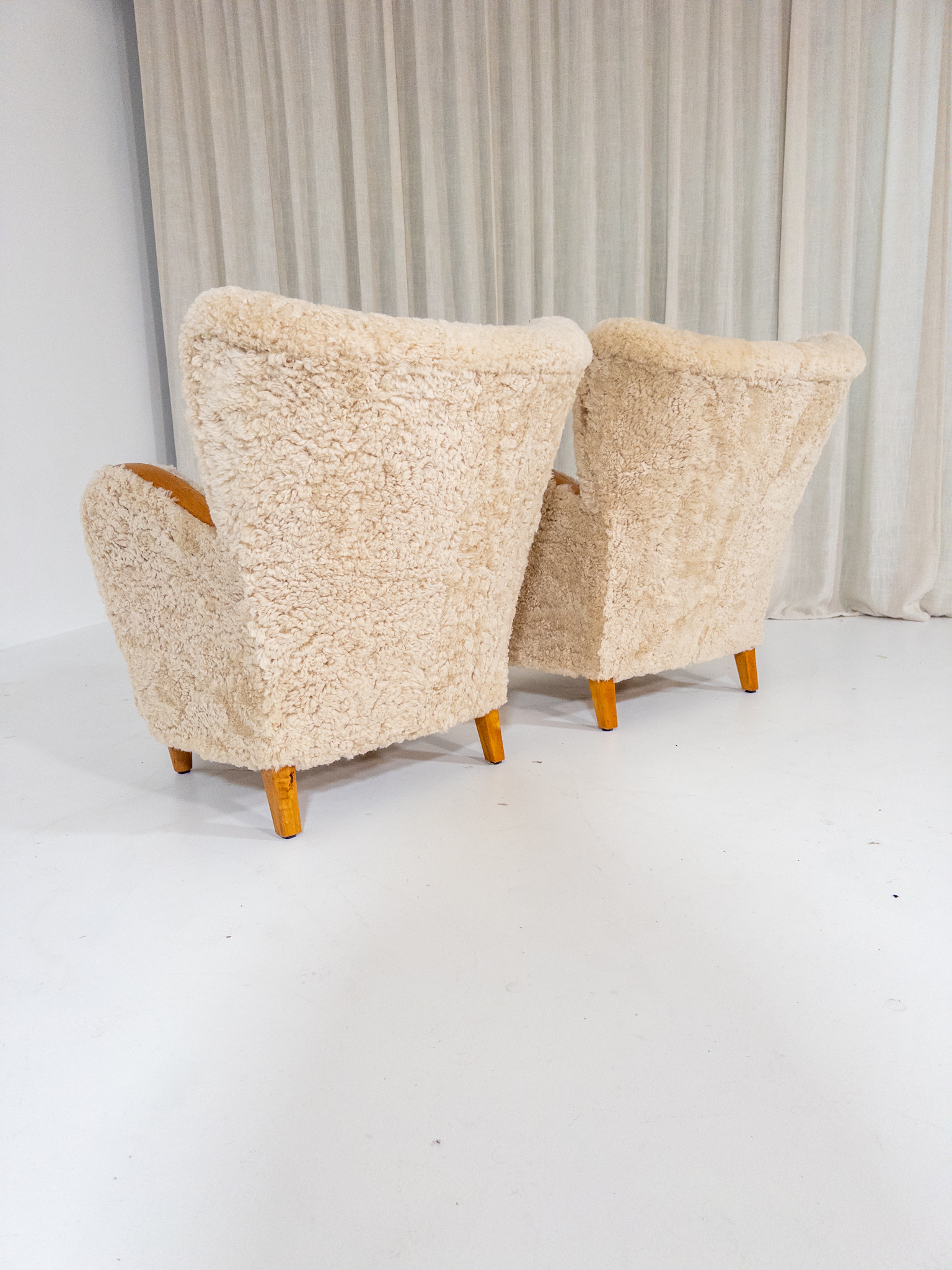 Ett ovanligt fint par fåtöljer i klassisk Swedish Modern-stil från 1940-talet. Nyomklädda i ljust, mjukt fårskinn som ger ett generöst och inbjudande uttryck, samtidigt som formen behåller sin tydliga tidstypiska karaktär.