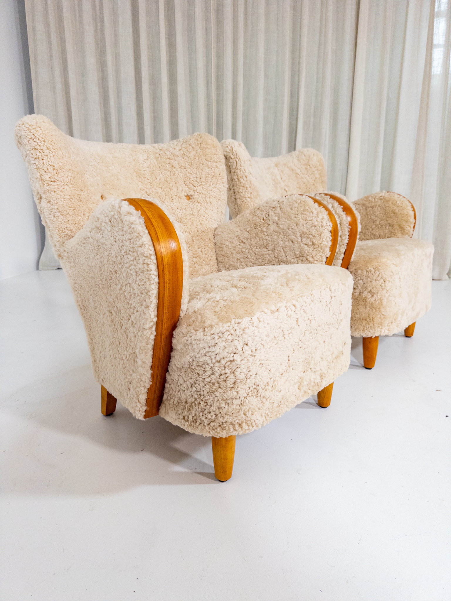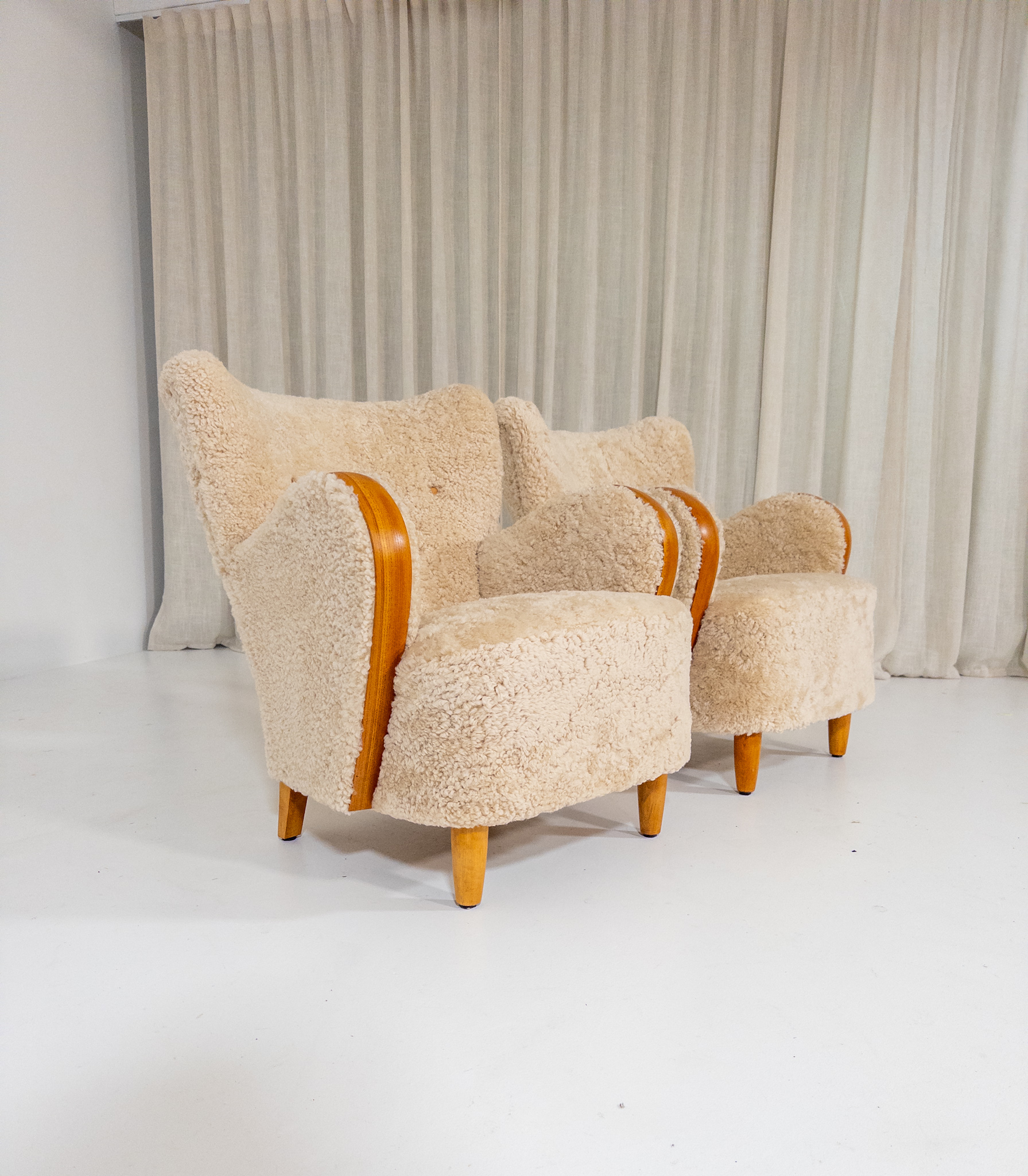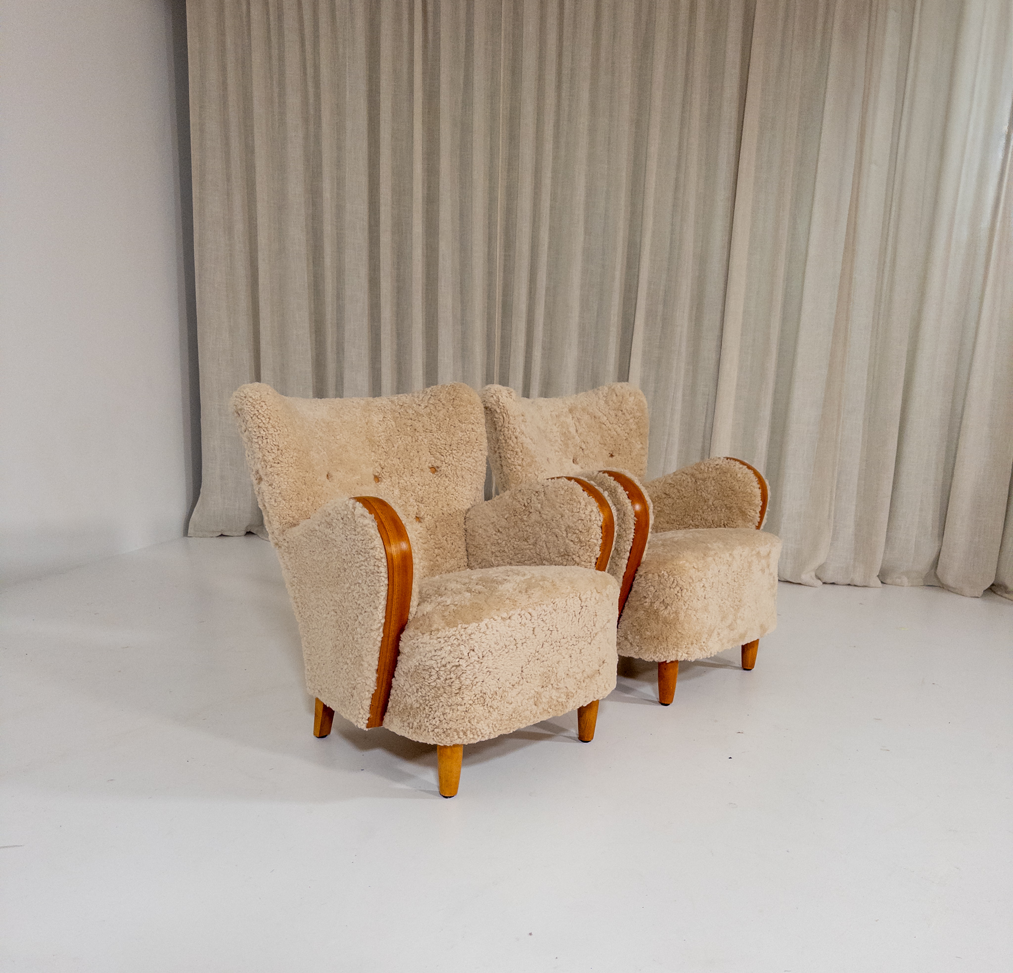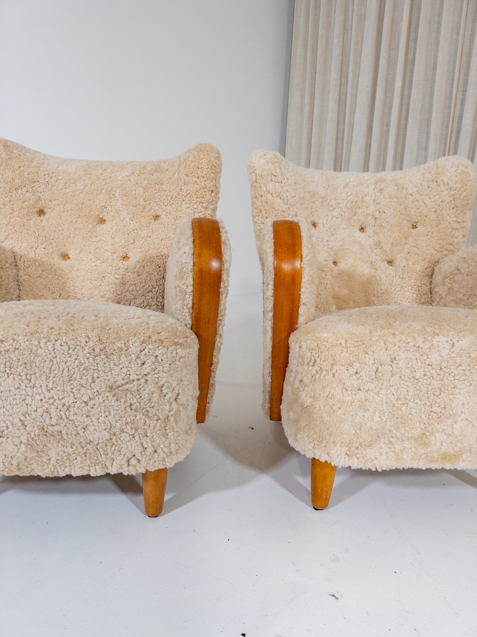 Ett ovanligt fint par fåtöljer i klassisk Swedish Modern-stil från 1940-talet. Nyomklädda i ljust, mjukt fårskinn som ger ett generöst och inbjudande uttryck, samtidigt som formen behåller sin tydliga tidstypiska karaktär.